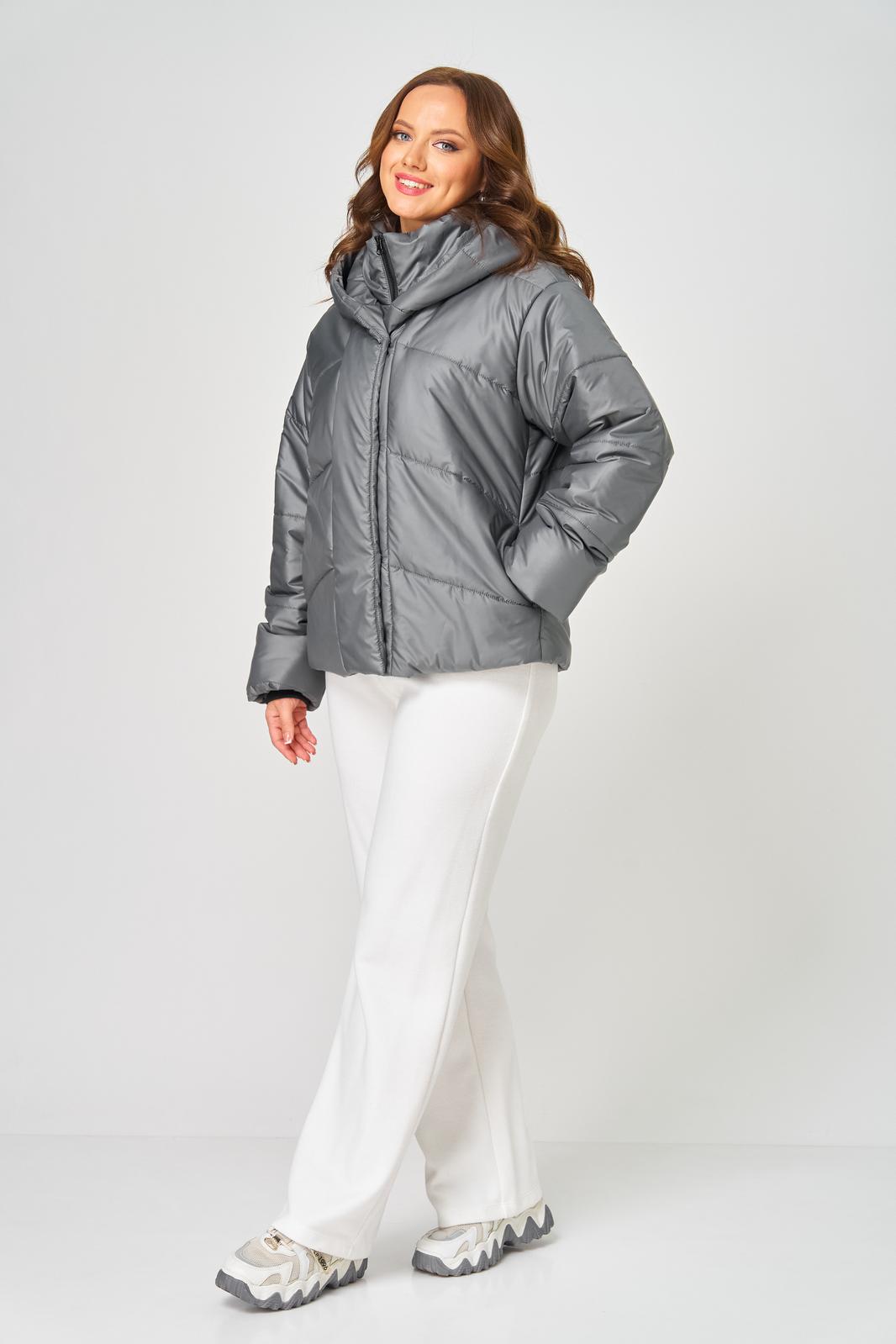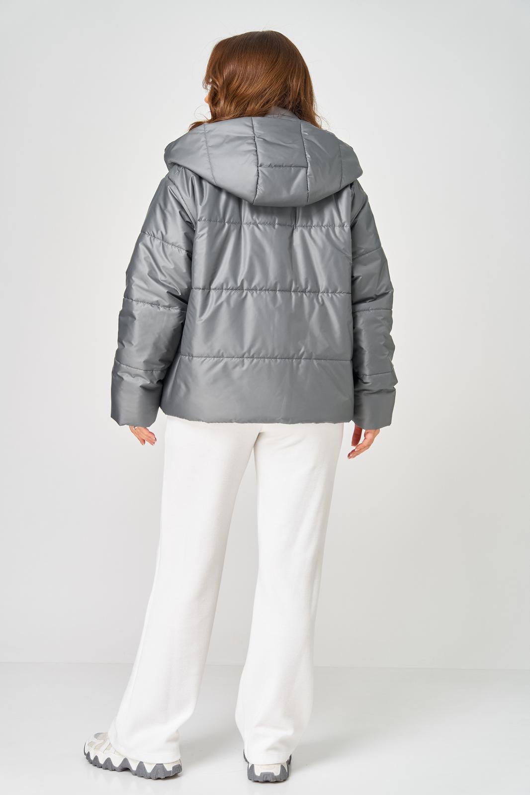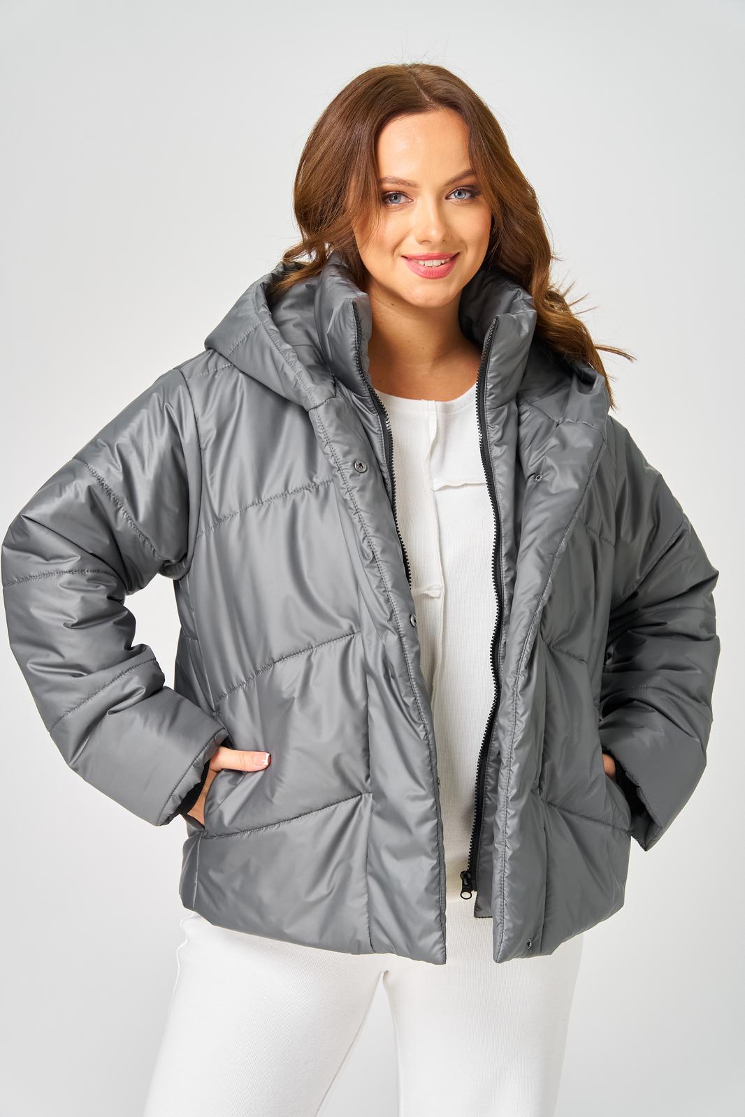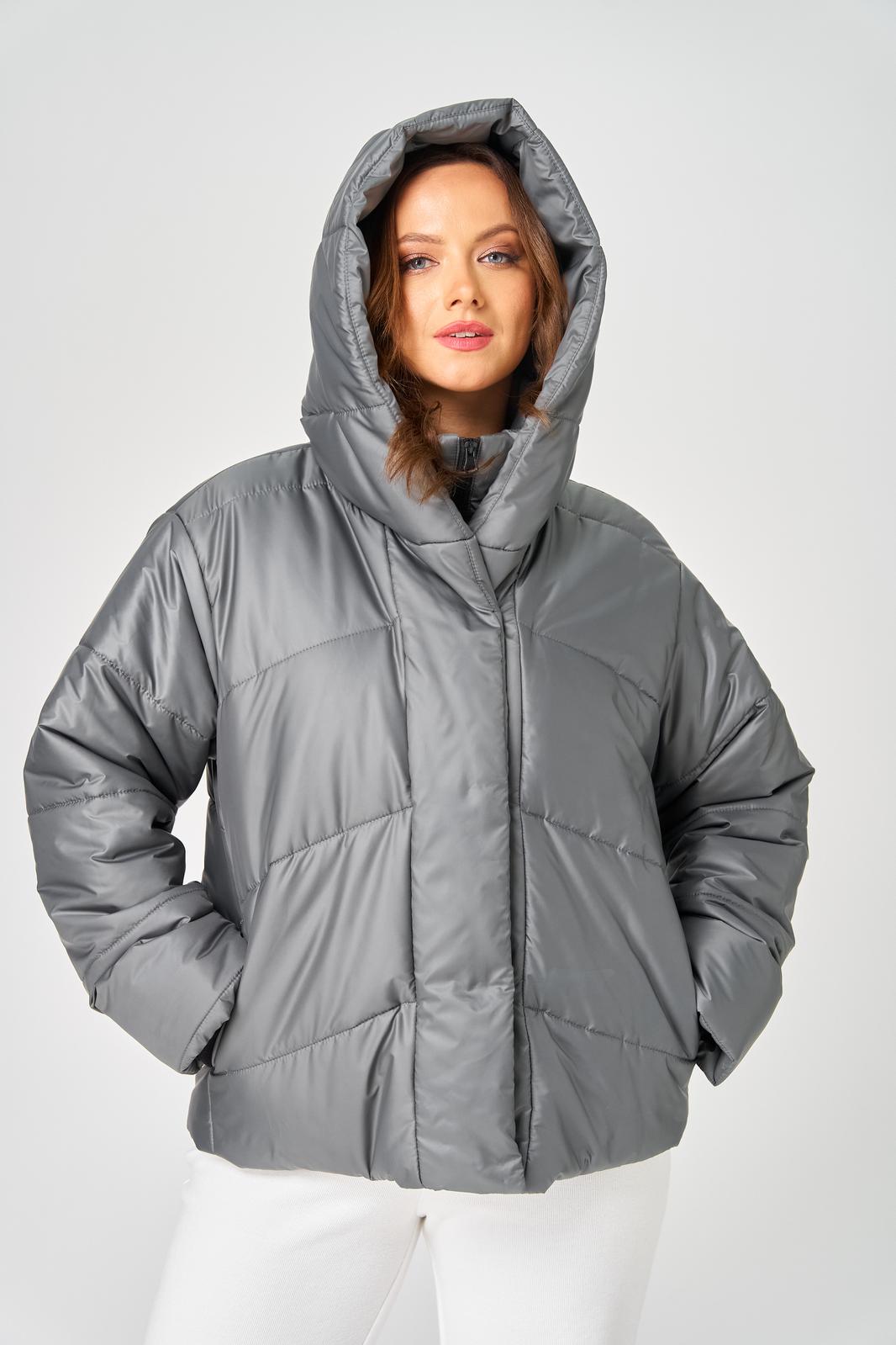 Куртка женская с центральной застёжкой на молнию и потайные кнопки. Спинка с горизонтальной стяжкой. Полочка выстегана по косой. В бококвых швах обработаны карманы. Рукав втачной одношовный с трикотажными манжетами из-под подгибки. Воротник-капюшон переходящий в планку с кнопками. Внутренний воротник-стойка с манишкой на молнии. Куртка на утеплителе. Температурный режим до - 10 градусов.