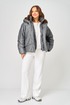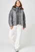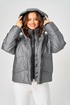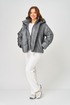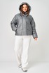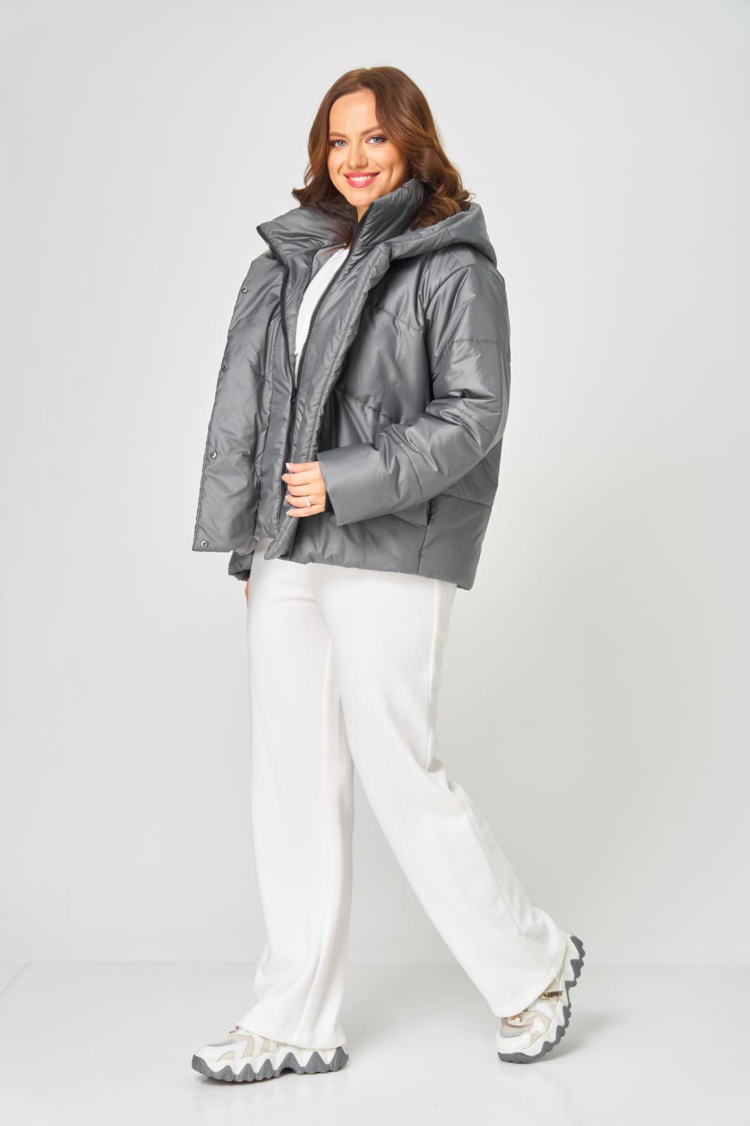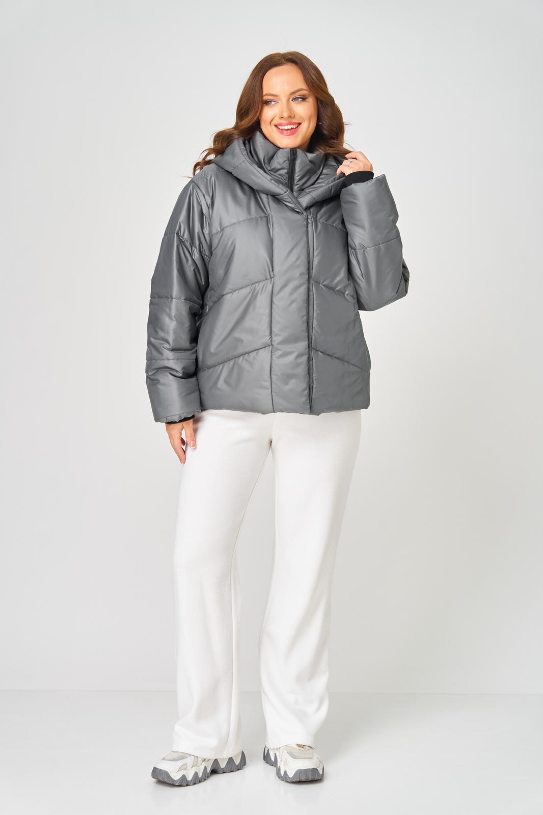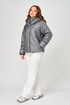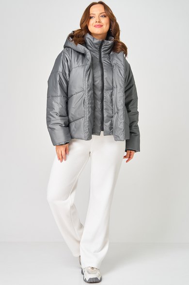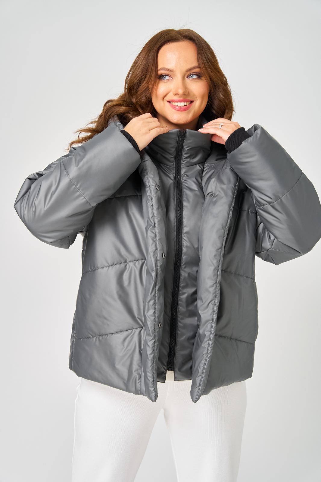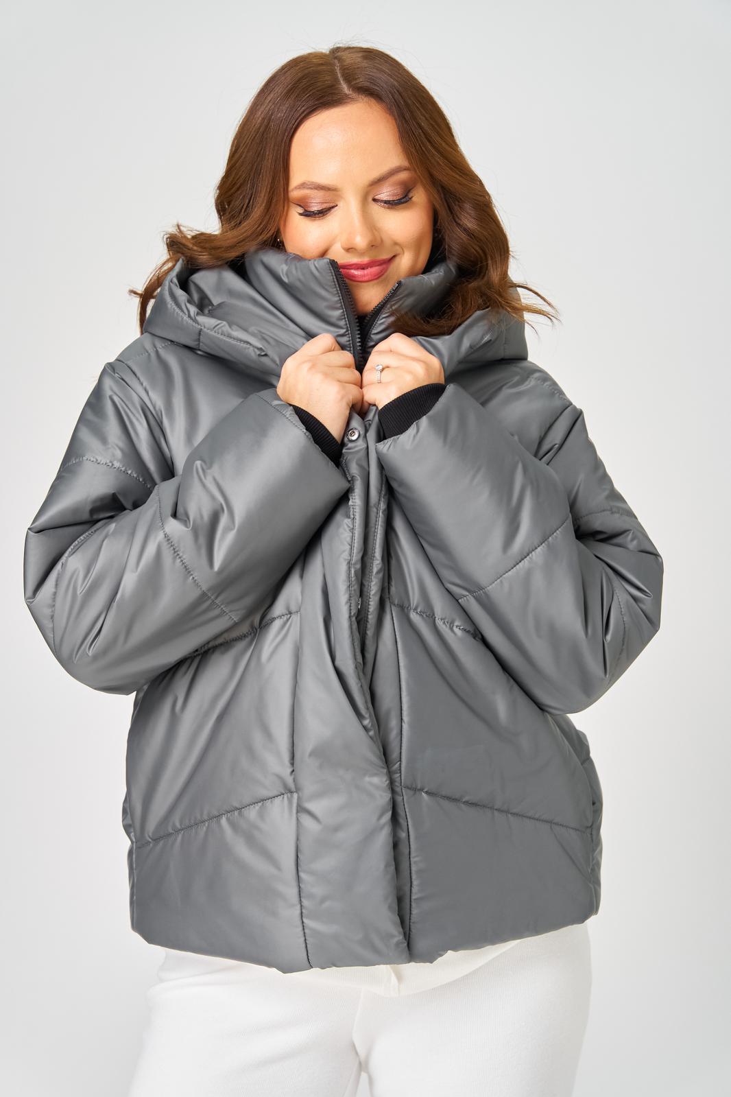 Куртка женская с центральной застёжкой на молнию и потайные кнопки. Спинка с горизонтальной стяжкой. Полочка выстегана по косой. В бококвых швах обработаны карманы. Рукав втачной одношовный с трикотажными манжетами из-под подгибки. Воротник-капюшон переходящий в планку с кнопками. Внутренний воротник-стойка с манишкой на молнии. Куртка на утеплителе. Температурный режим до - 10 градусов.