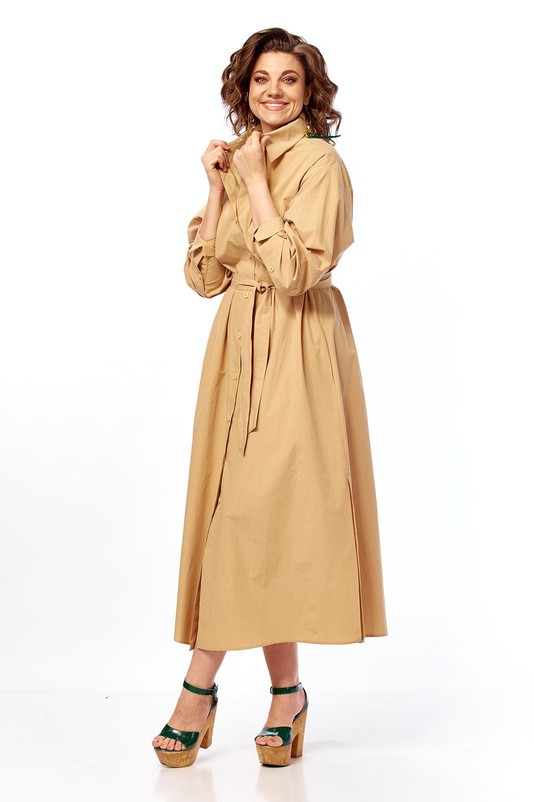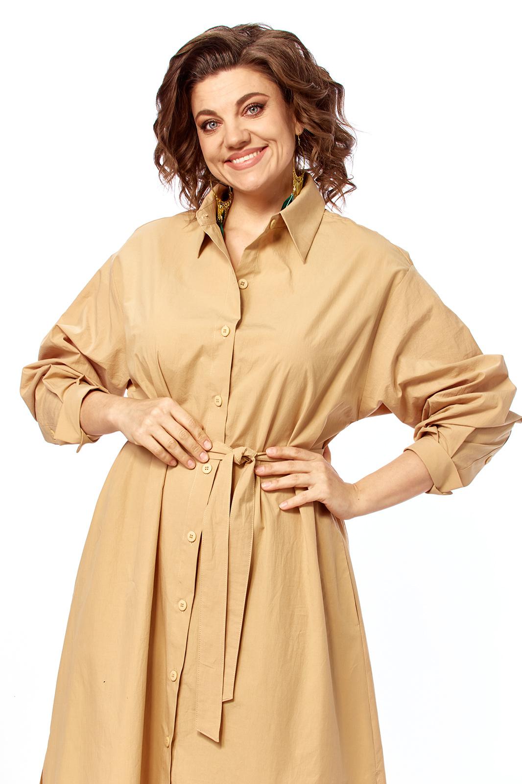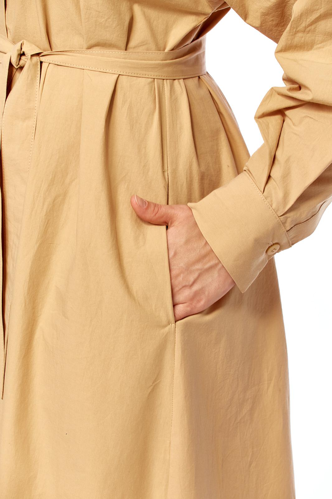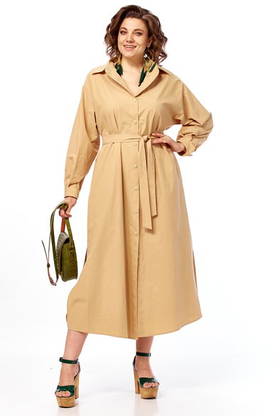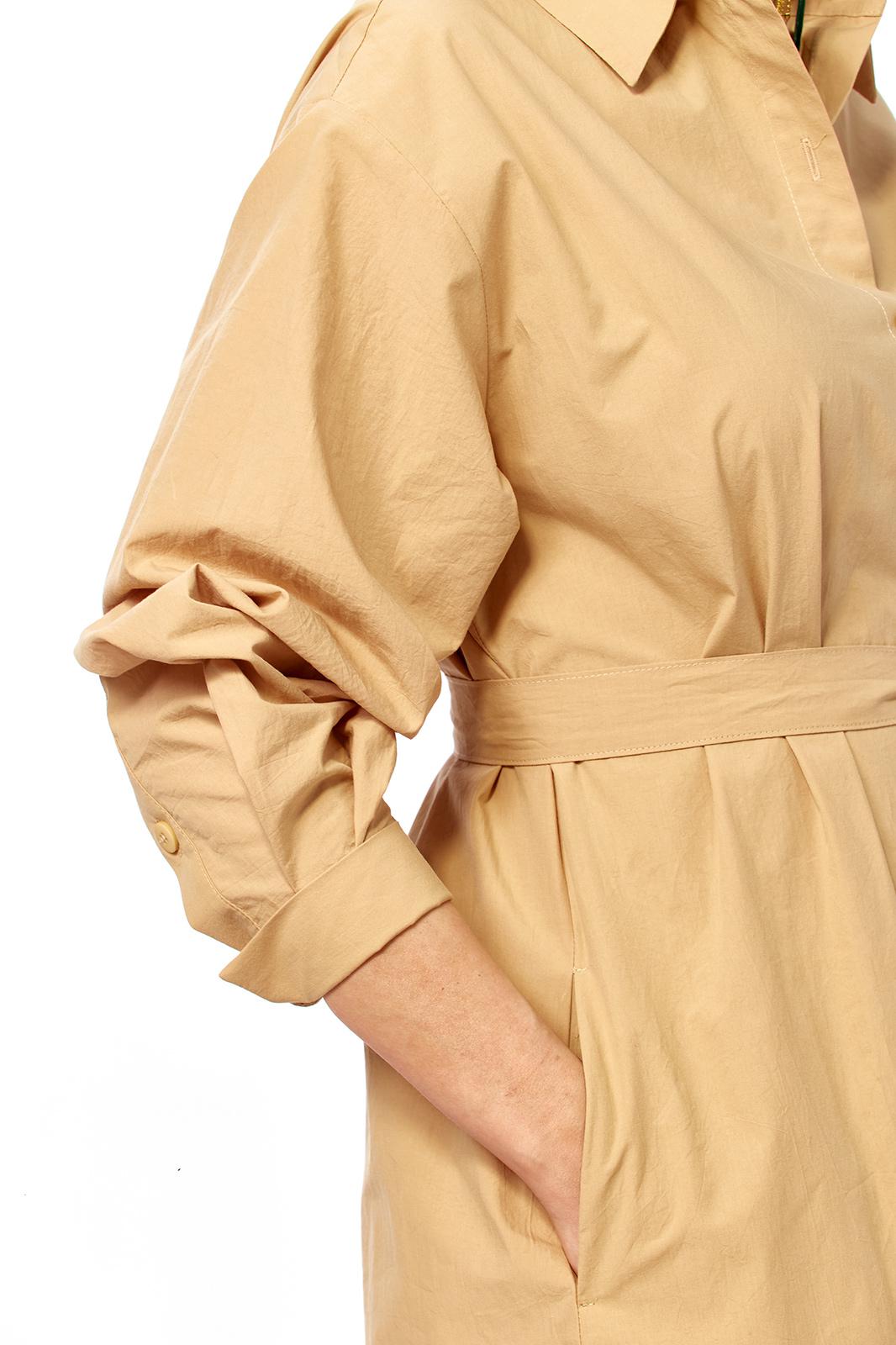 Платье женское свободного кроя с центральной застежкой на петли и пуговицы. Спина со встречной складкой застроченной сверху и в области талии. В боковых швах обработаны карманы. Рукав втачной со спущенной линией плеча. По низу рукавов разрезы с петлей и пуговицей и манжеты. Воротник рубашечный на стойке. По бокам обработаны разрезы. Пояс съемный. Фурнитура может отличаться от заявленной на фото.