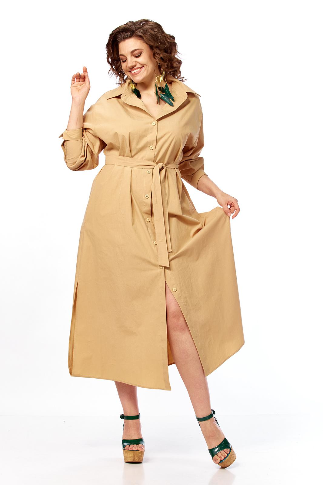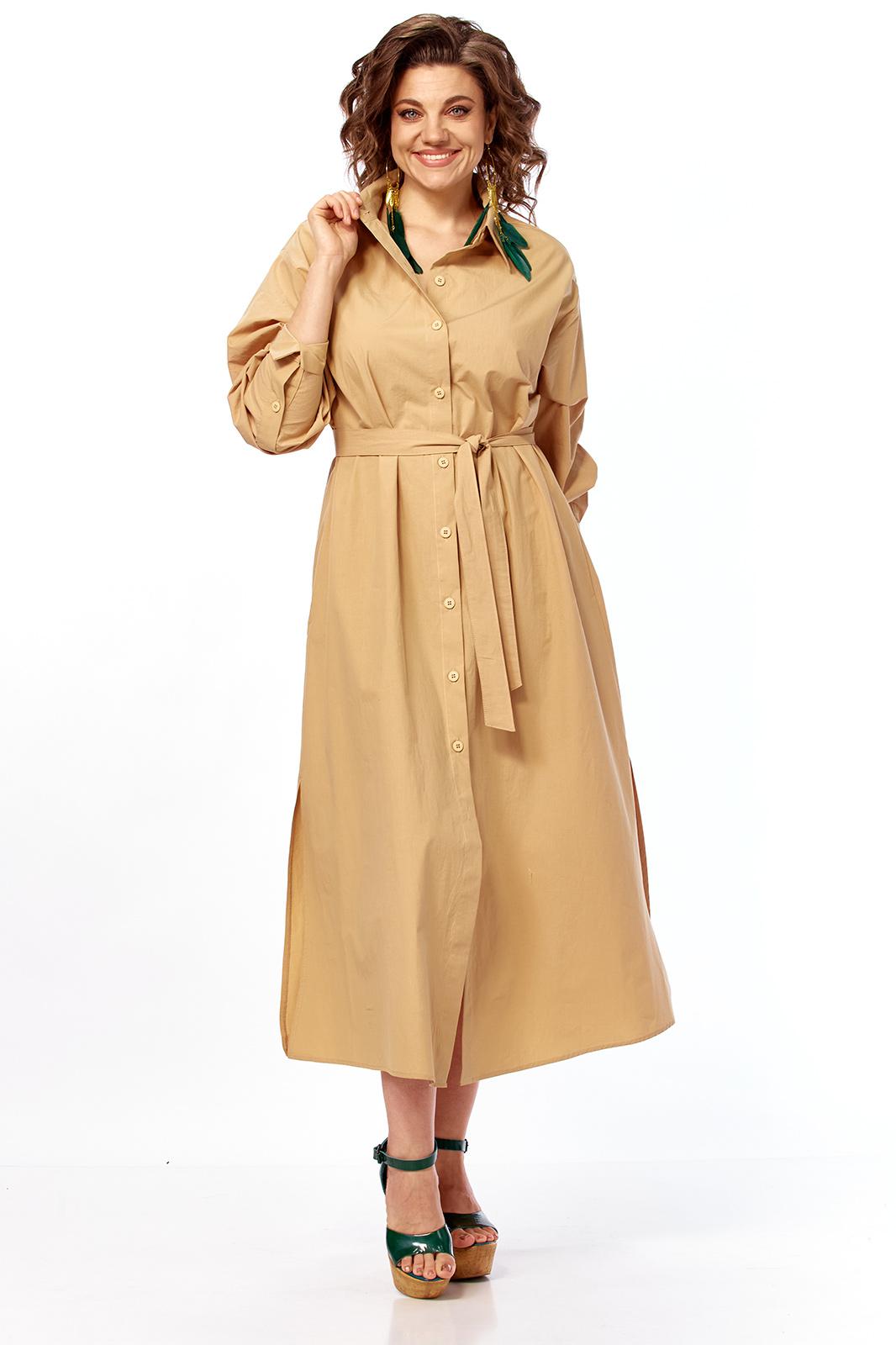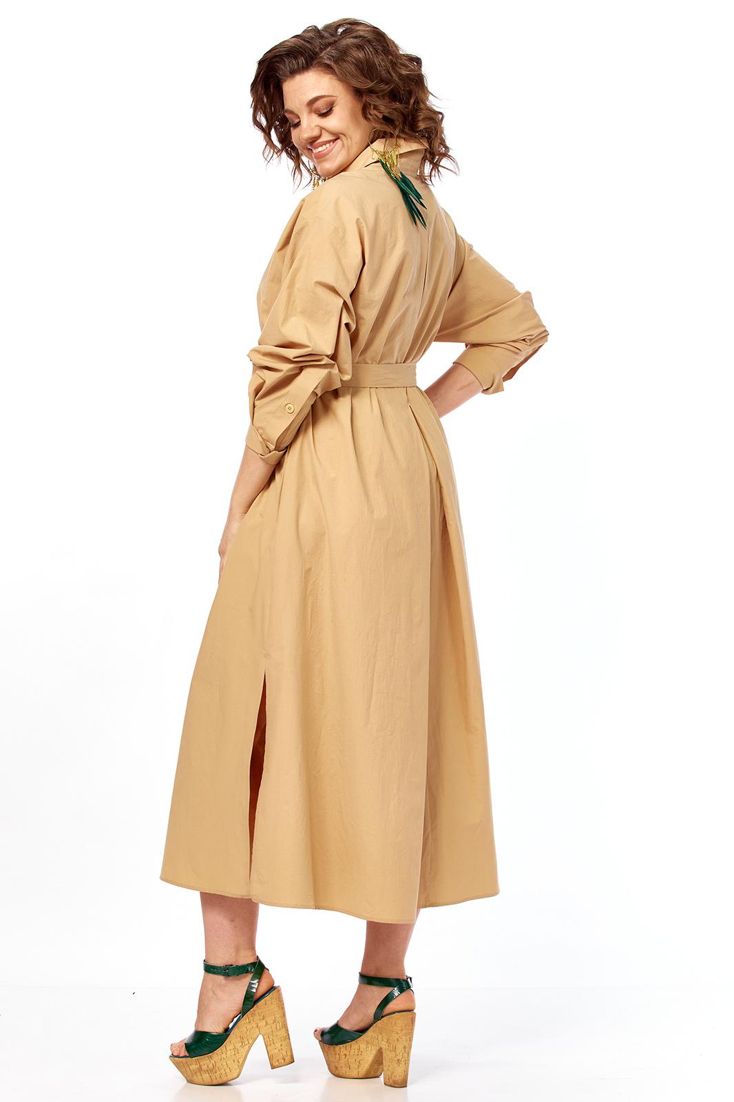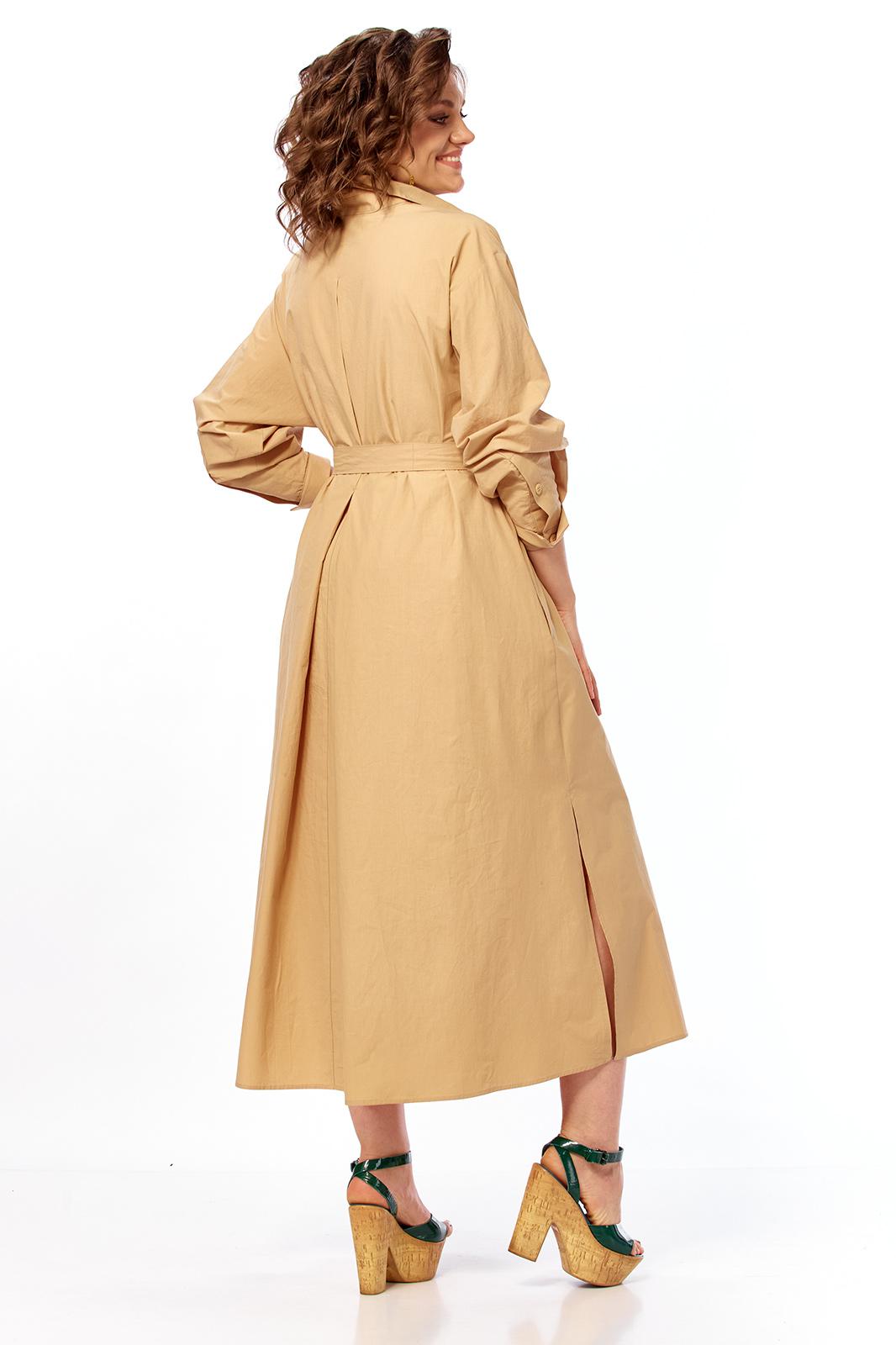 Платье женское свободного кроя с центральной застежкой на петли и пуговицы. Спина со встречной складкой застроченной сверху и в области талии. В боковых швах обработаны карманы. Рукав втачной со спущенной линией плеча. По низу рукавов разрезы с петлей и пуговицей и манжеты. Воротник рубашечный на стойке. По бокам обработаны разрезы. Пояс съемный. Фурнитура может отличаться от заявленной на фото.