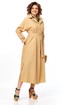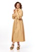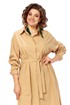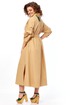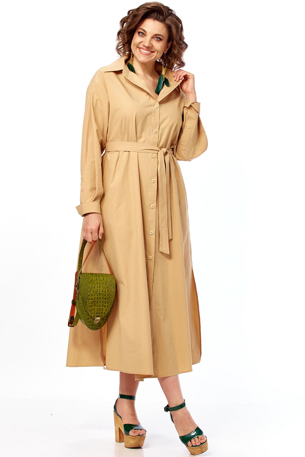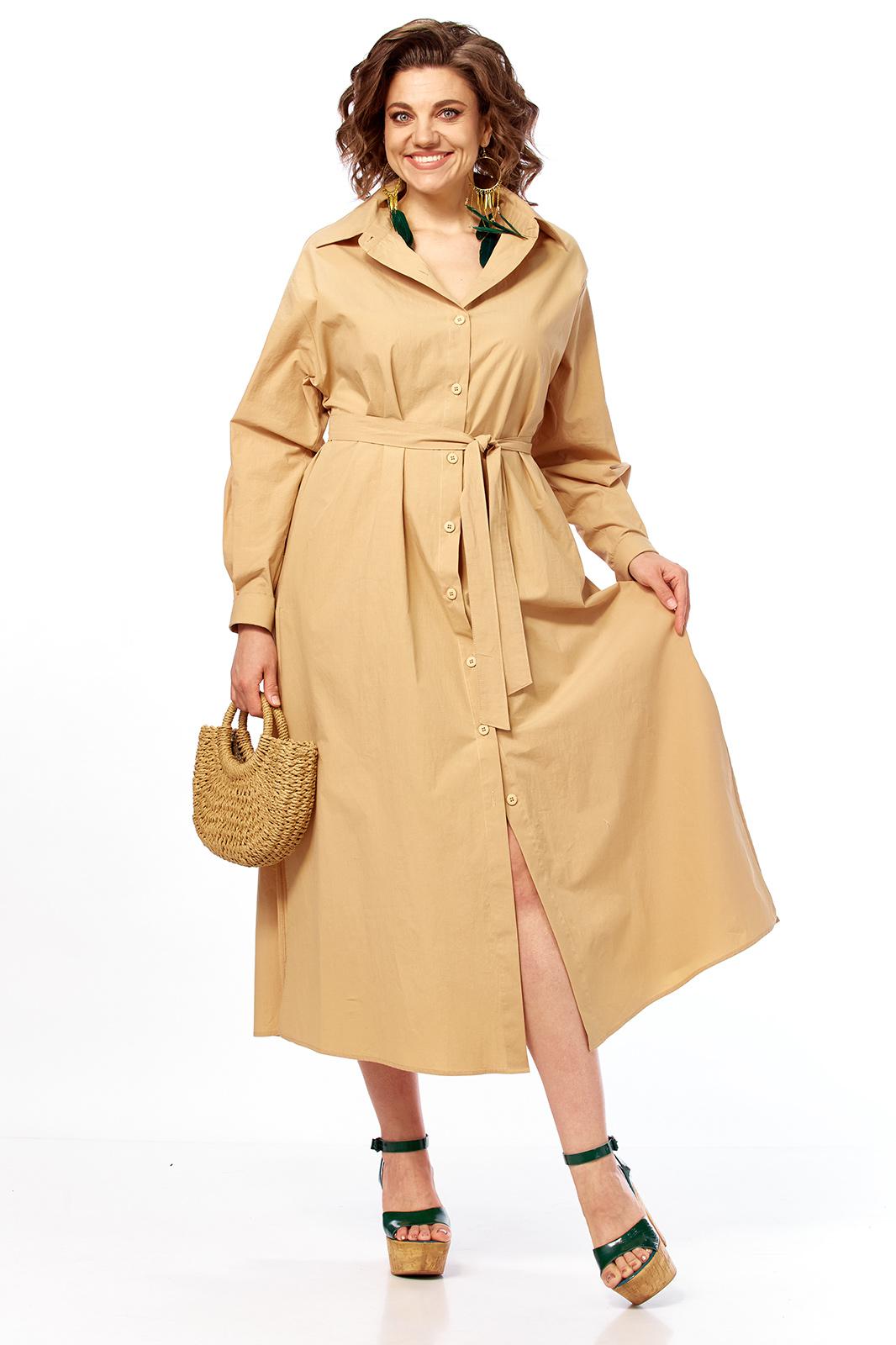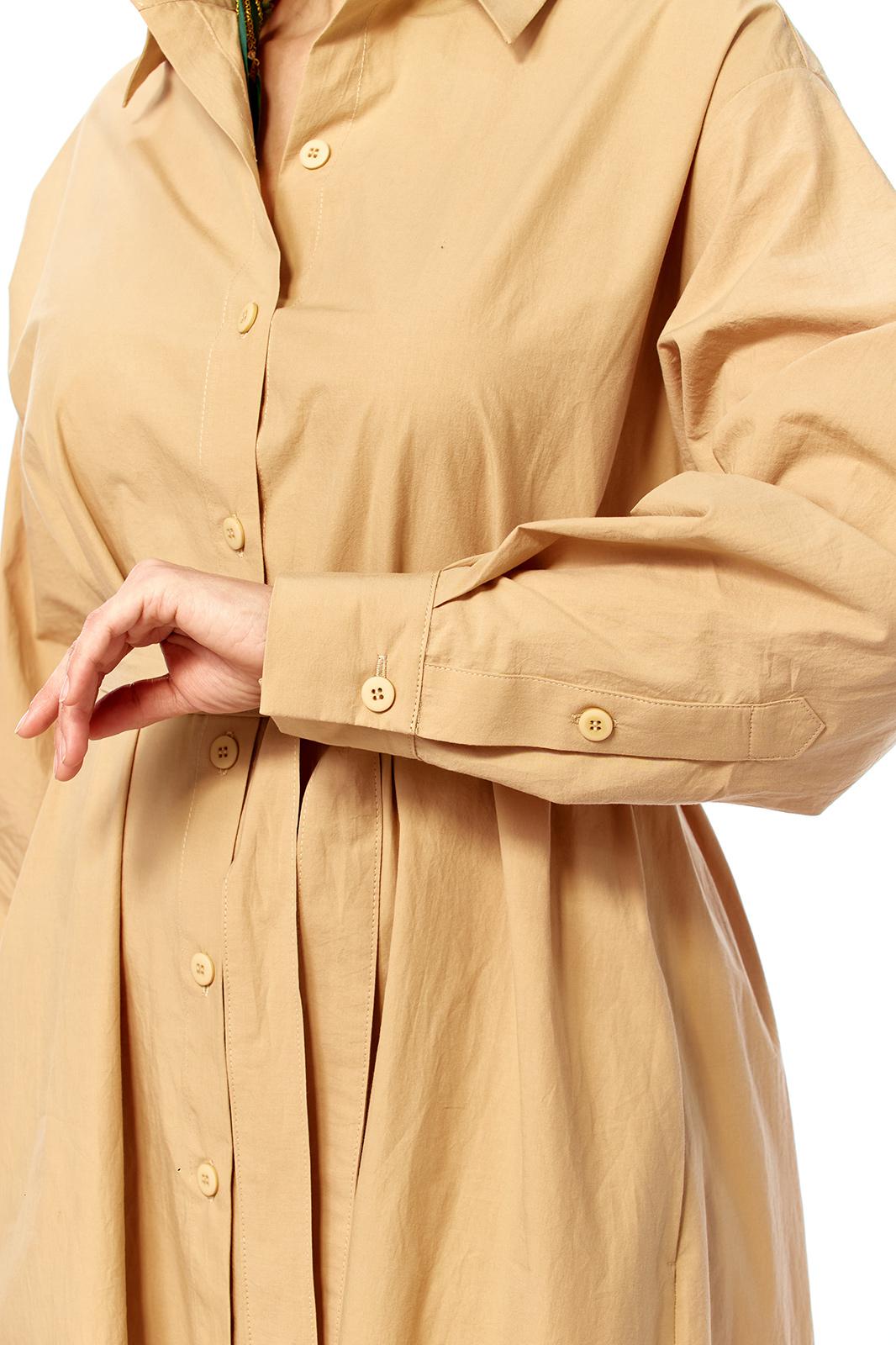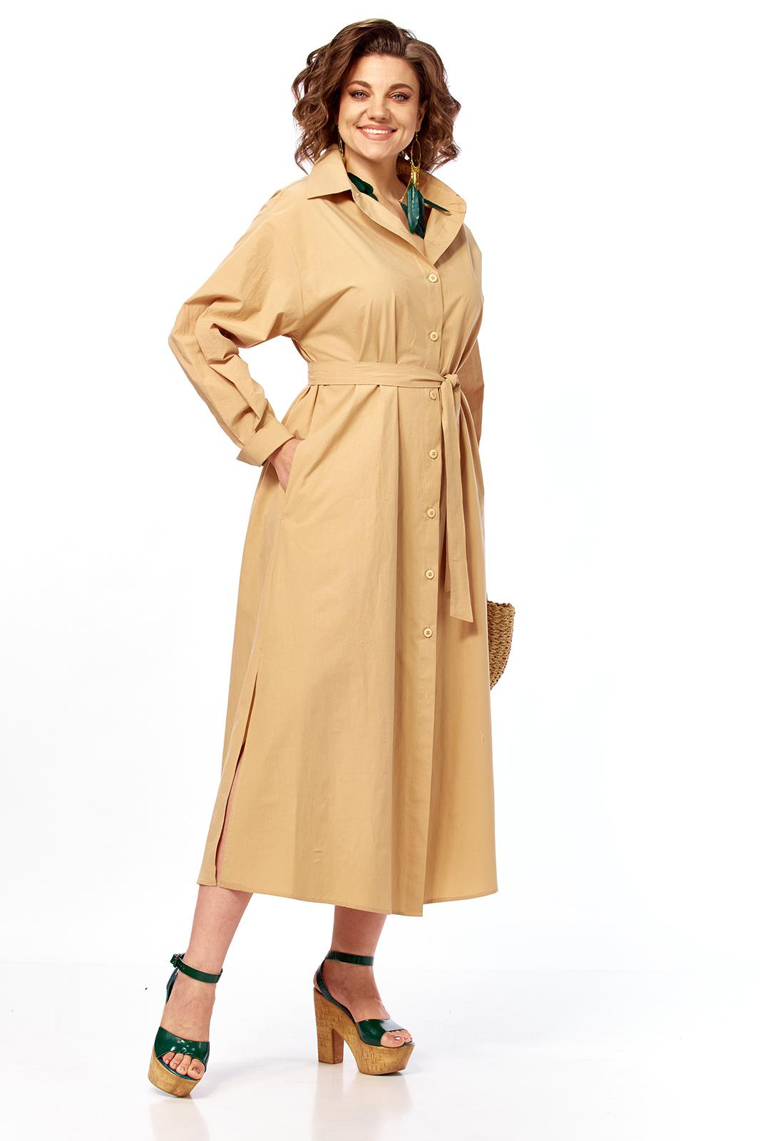 Платье женское свободного кроя с центральной застежкой на петли и пуговицы. Спина со встречной складкой застроченной сверху и в области талии. В боковых швах обработаны карманы. Рукав втачной со спущенной линией плеча. По низу рукавов разрезы с петлей и пуговицей и манжеты. Воротник рубашечный на стойке. По бокам обработаны разрезы. Пояс съемный. Фурнитура может отличаться от заявленной на фото.