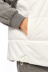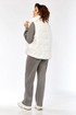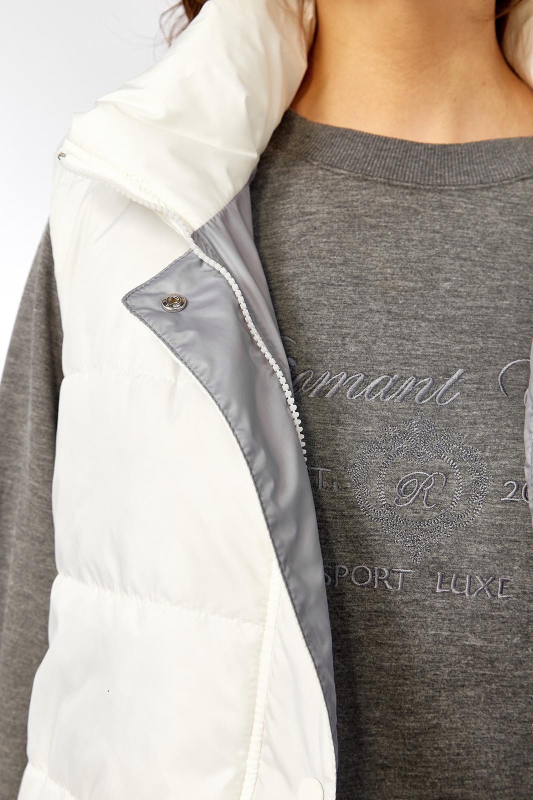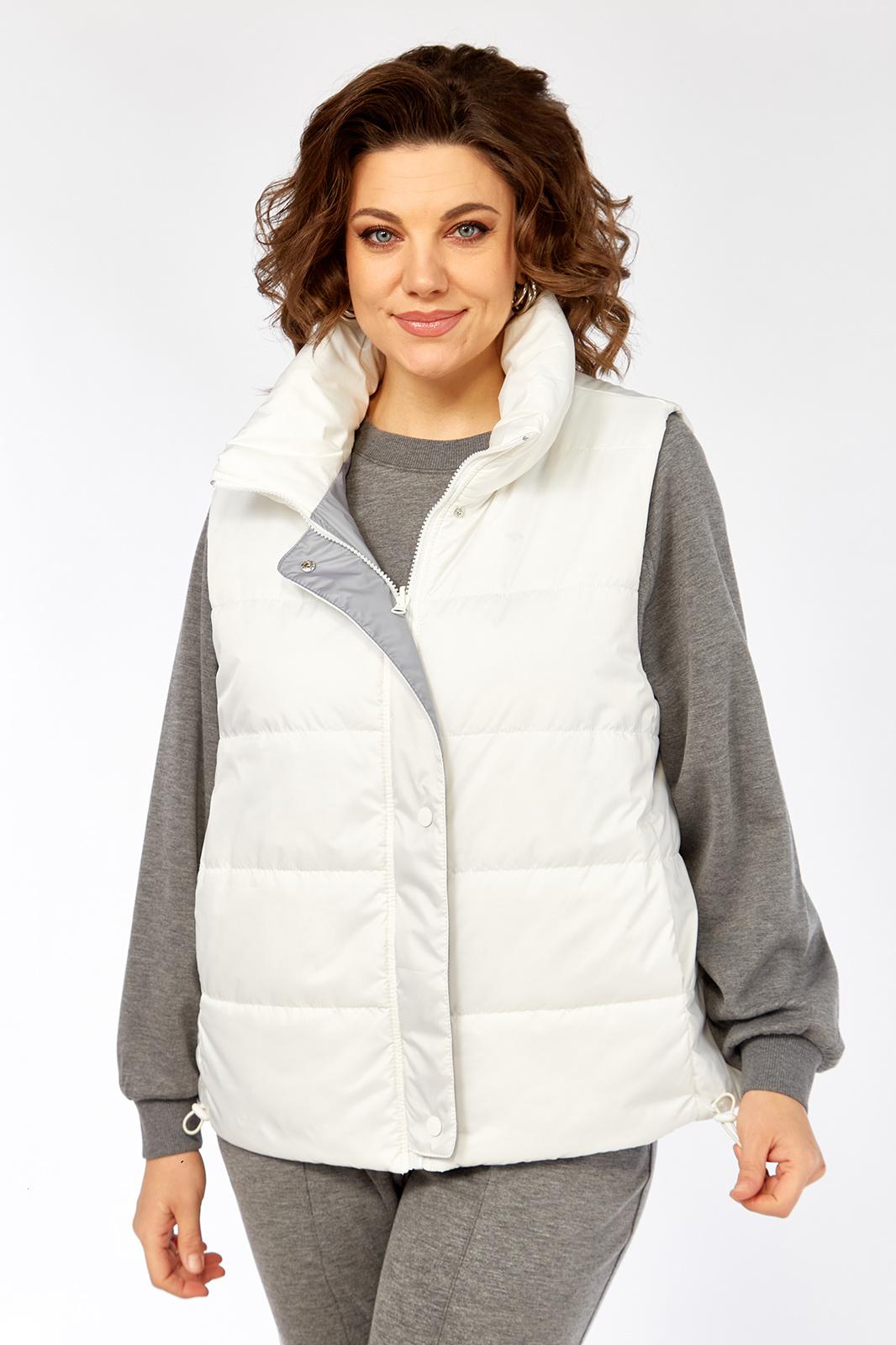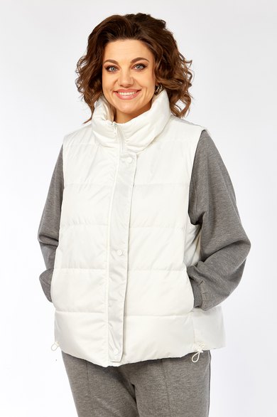 Жилетка женская прямого силуэта с центральной застежкой на тесьму-молнию и отделочную планку на кнопки. Боковой шов смещенный на перед, в шве обработаны карманы. Воротник-стойка со складками по линии горловины. Жилетка двухсторонняя. Температурный режим до +5 градусов.