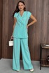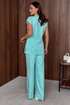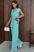 Брюки - палаццо с центральной застежкой на тесьму молнию с гульфиком и откоском, с притачным поясом со шлевками, застегивающимся на 1 прорезную петлю и пуговицу. Задняя часть пояса - на резинке. П П брюк со складками, переходящими в стрелки и боковыми карманами. З П брюк с 2-мя парами таллиевых вытачек и стрелками.