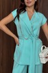 Жилет полуприлегающего силуэта с двубортной застежкой на прорезные петли и пуговицы; с отложными лацканами и разрезами по бокам. Перед - с талиевой вытачкой, переходящей в рельеф до низа, с подрезом по талии, с карманом, с настрочным клапаном над грудью. Спинка - с талиевыми вытачками. Рукава короткие спущенные цельнокроеные. В комплекте - пояс из основного материала.