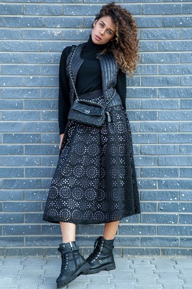 Роскошная двухслойная юбка “миди” на поясе со складками. Застежка молния в боковом шве. Верхний слой перфорированный трикотаж. Нижний слой из легкой плательной ткани.