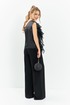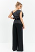 Костюм вечерний с брюками и блузой. Блуза с настрочными воланами из органзы по полочке, горловина асимметричная, изделие без рукавов, на спинке блузы таллиевые выточки. Брюки палаццо с высокой посадкой расширенные к низу, изделие на притачном поясе с резинкой по поясу, в боковых швах имеются карманы. Брюки без молнии и пуговицы