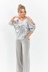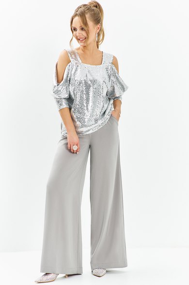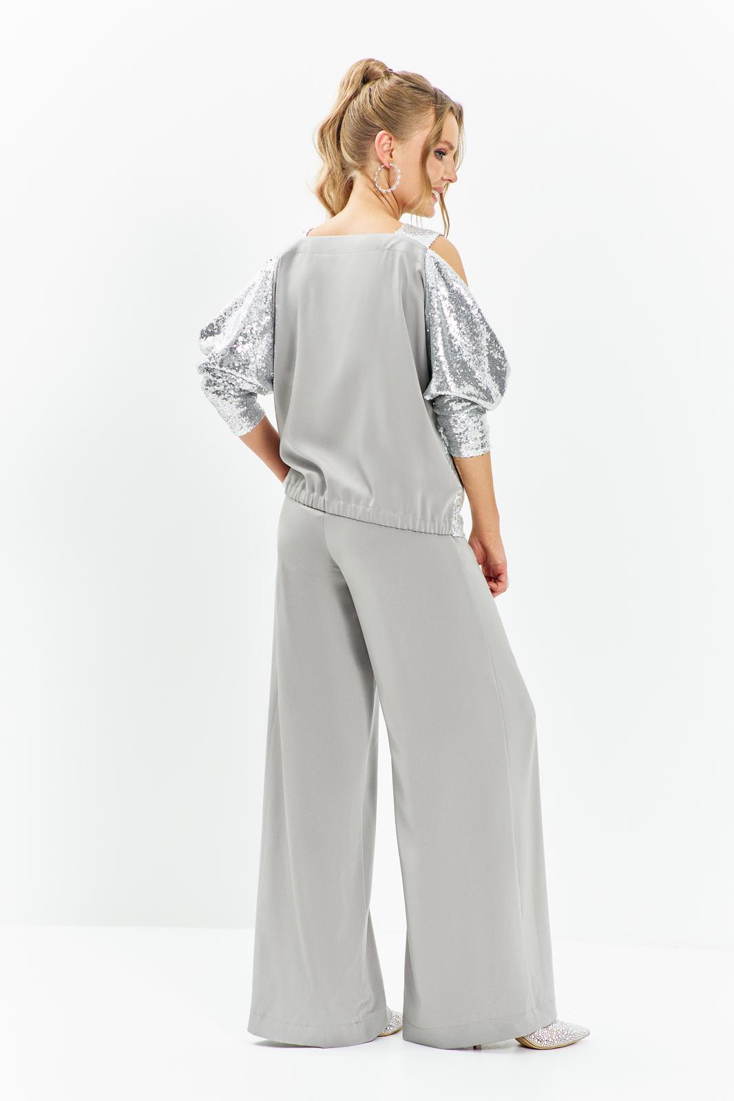 Костюм вечерний с брюками и кофтой, выполнен из сочетания сатиновой ткани с приглушенным блеском и трикотажного полотна с пайетками. Изделие с ниспадающим рукавом регланом 3/4 и широкой бретелью. джемпер без застёжки, на частичной подкладке. Низ кофты по спинке с резинкой (нерегулируемой). Брюки палаццо широкие от бедра, в боковых швах имеются карманы с отрезным бочком, пояс втачной с резинкой(без молнии)