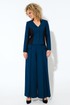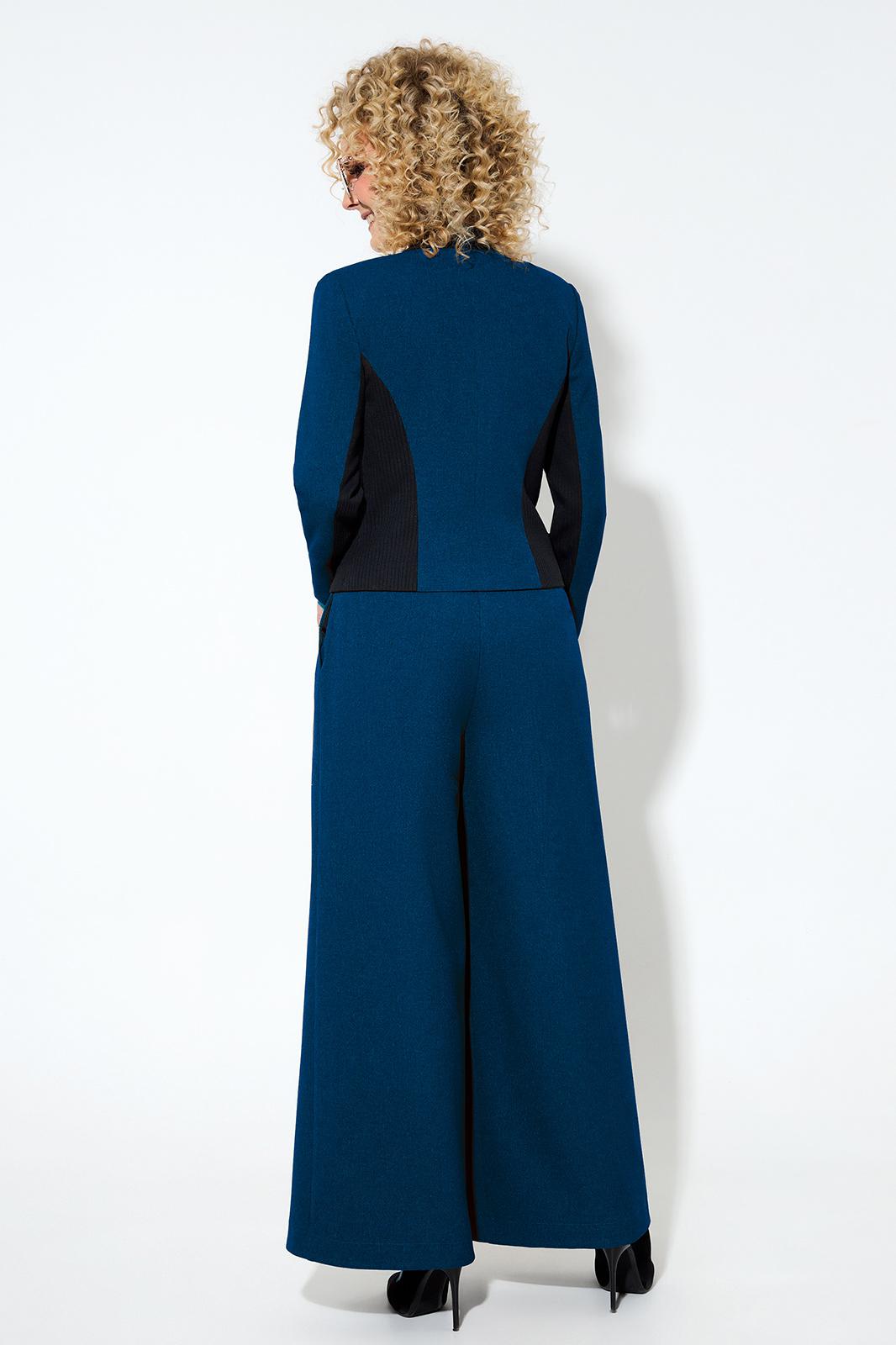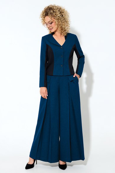 Костюм женский 2х-предметный выполнен из костюмной ткани в мелкий рубчик. В жакете отрезные бочки из трикотажного(вязаного) материала. Жакет полуприлегающего кроя , рукав-втачанный, длинный. Горловина V- образная с ассиметричной стойкой и лацканом. Застежка-кнопки. Брюки палаццо- со складками, средней посадки на притачном поясе с резинкой. застежка молния на гульфике в боковых швах брюк имеются небольшие карманы (вход в карман 11 см).