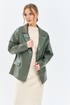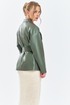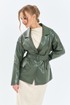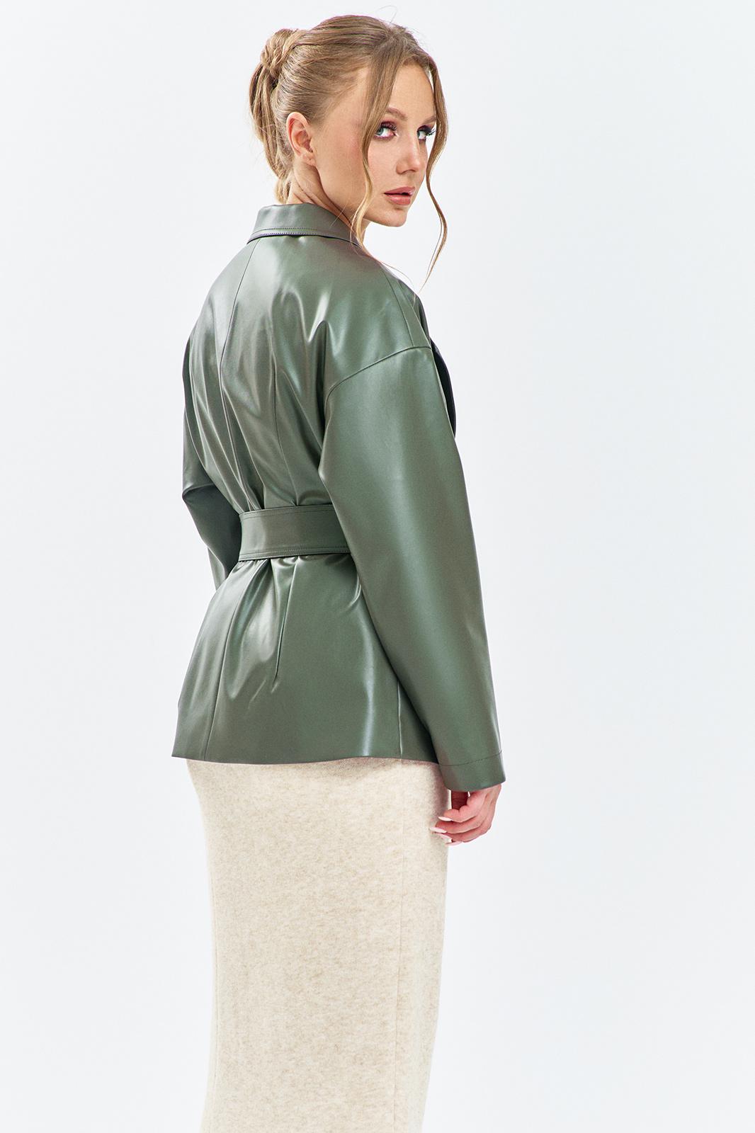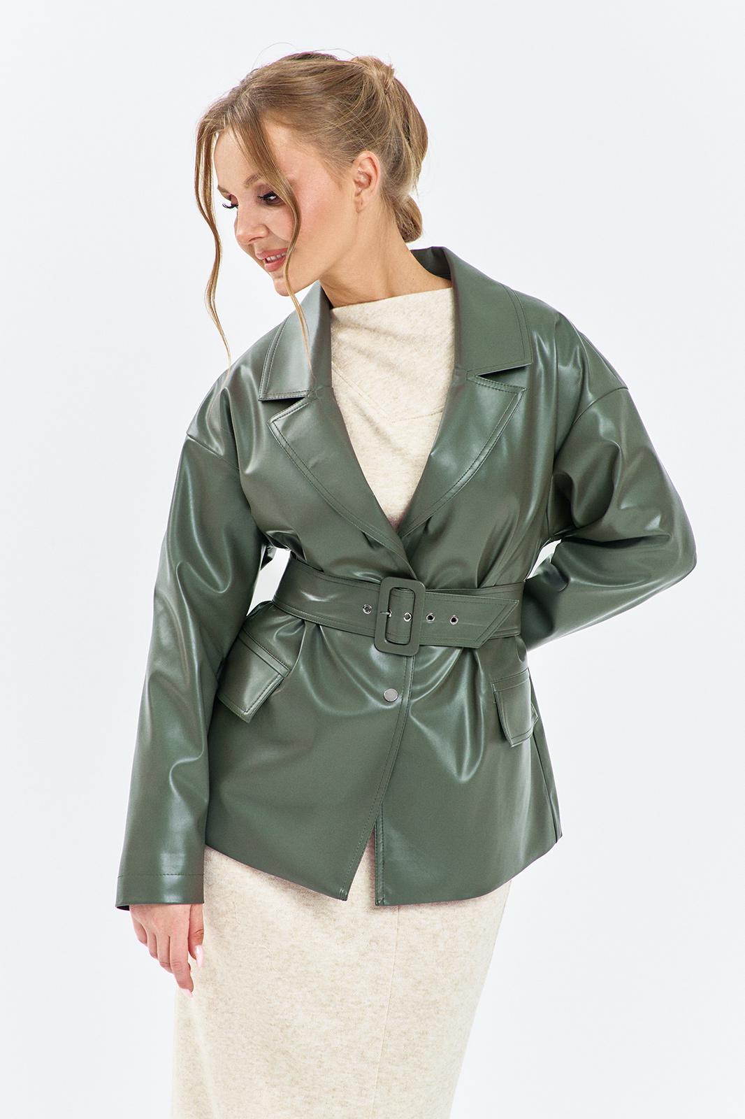 Жакет женский выполнен из эко-кожи, жакет прямого слегка приталенного кроя, по полочке жакета расположены прорезные карманы с клапанами, воротник отложной с лацканами, рукав приспущенный длинный. Застежка- кнопки. Пояс в комплектации.