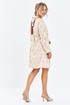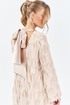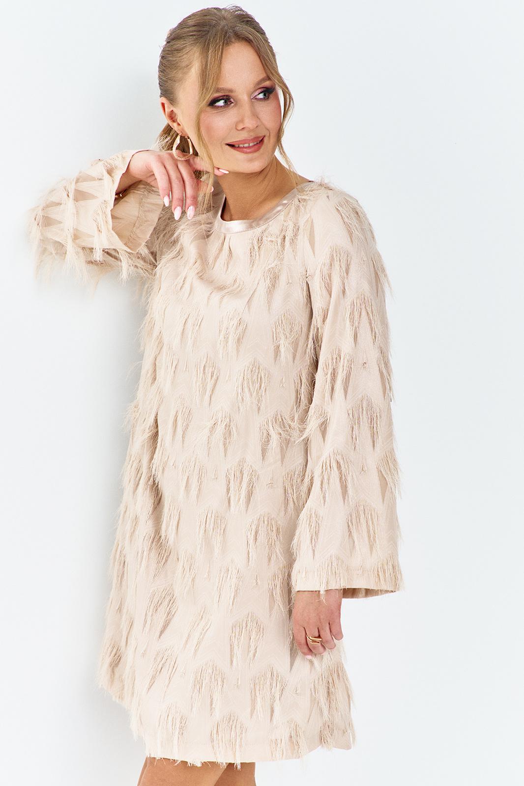 Платье женское трапециобразного кроя, свободной посадки. Модель выполнена из ткани с бахромой, горловина округлая, рукав втачной, длинный, расширенный к низу. Спинка изделия с глубоким вырезом и длинными завязками. Платье на полной подкладке.