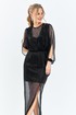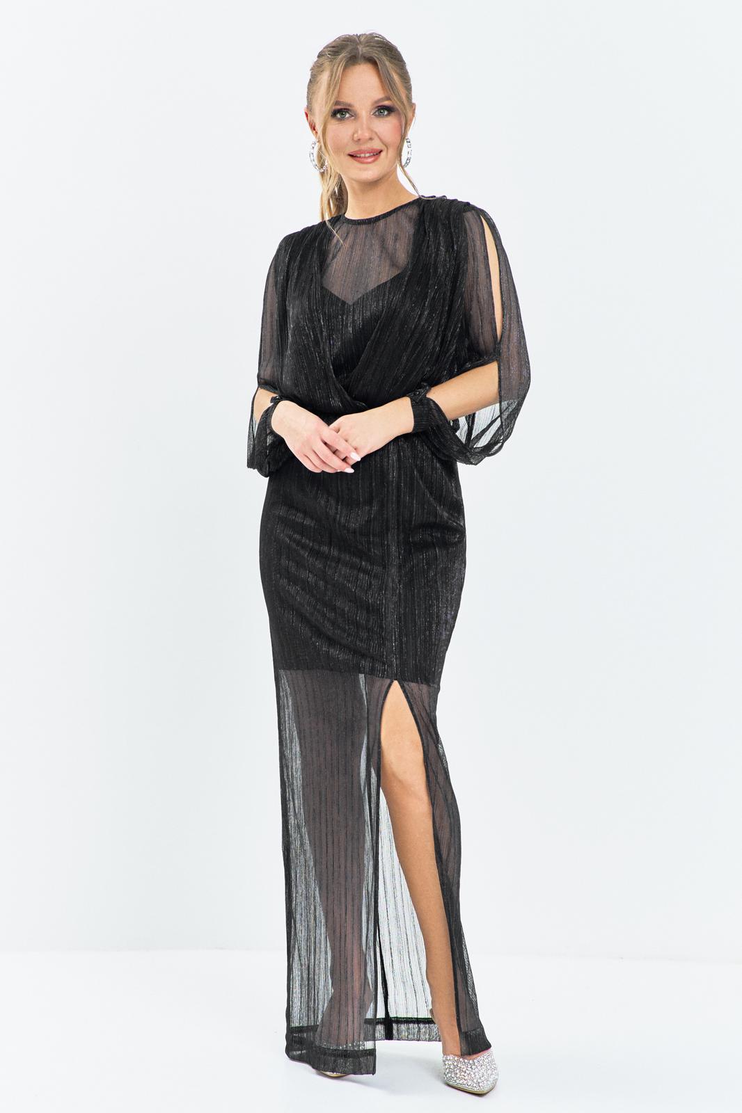 Вечернее женское платье выполнена из эластичной сетки с люрексной нитью, изделие длины - макси, отрезное по линии талии, с регулирующей эластичной тесьмой в таллиевом шве. По лифу в плечевые швы заложены глубокие складки, декольте прикрыто основной тканью. Горловина округлая, рукав - втачной, длинный, разрезной, по низу рукава манжета с петлей-пуговицей. По центру спинки разрез и декоративные складки от плеча. Юбка платья прямая с высоким разрезом от низа выше уровня колена.