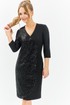 Платье вечернее, коктейльное выполнено из сочетания плательной ткани и трикотажа с пайетками. Платье прямого кроя, горловина V-образная, по полочке платья выполнена имитация запаха и расположены рельефы. Спинка изделия со средним швом и таллиевыми выточками. Рукав втачной 3/4, застежка- потайная молния по спинке.