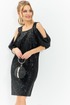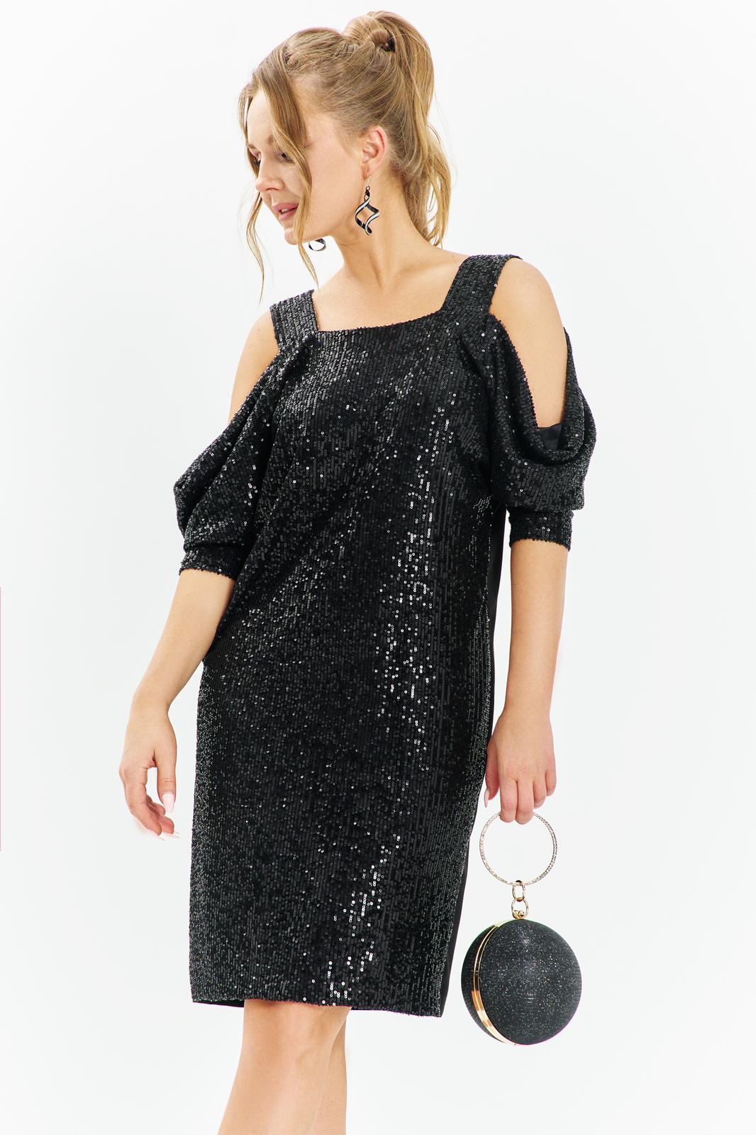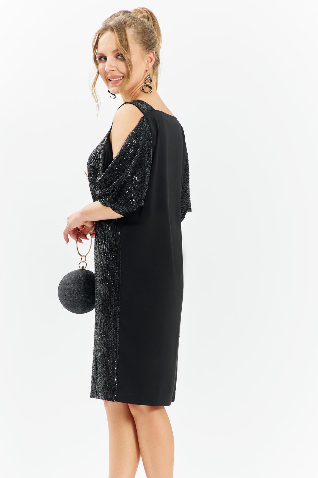 Платье коктейльное женское выполнена с сочетания трикотажного полотна с пайетками и плательной ткани по спинке, Изделие с ниспадающим рукавом регланом 3/4 и широкой бретелью. Платье без застёжки. Платье на частичной подкладке.