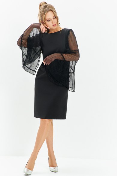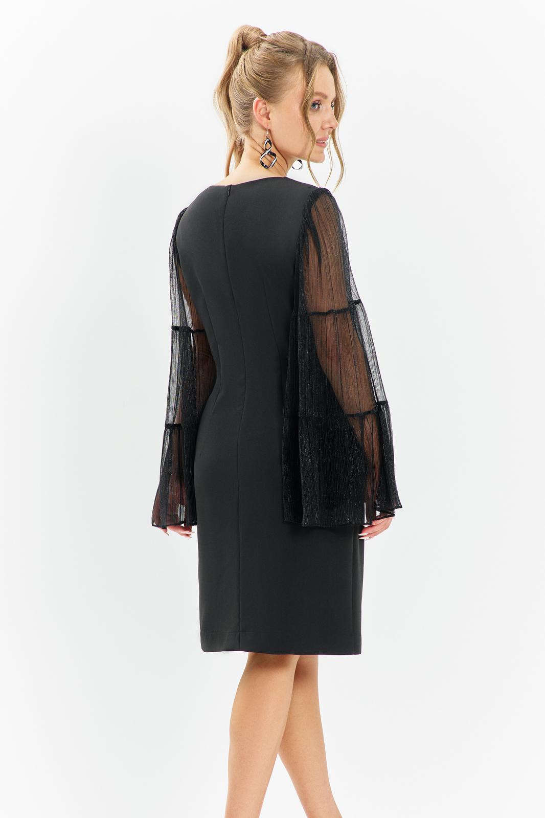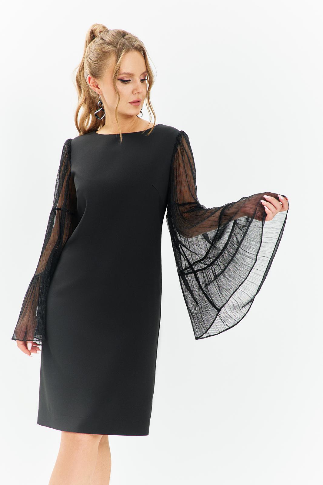 Платье вечернее, коктейльное прямого кроя выполнено из плательной ткани. Горловина округлая, по полочке изделия расположены нагрудные выточки. Рукав втачной длинный расклешенный - воланами. По спинке платья расположен средний шов и таллиевые выточки.