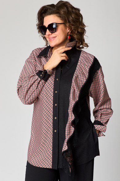 Блуза женская повседневная прямого силуэта, выполнена из трикотажного полотна двух дизайнов в сочетании с отделкой из кружева. Застежка доверху на петли и пуговицы, оротник на стойке рубашечного типа, плечо спущенное, рукав втачной по низу на притачной манжете. В боковх швах обработаны разрезы, с левой стороны по полочке притачная рюша из основной и отделочной ткани. Низ блузы фигурный. Декором блузы служат отделочные пуговицы и рюши.