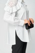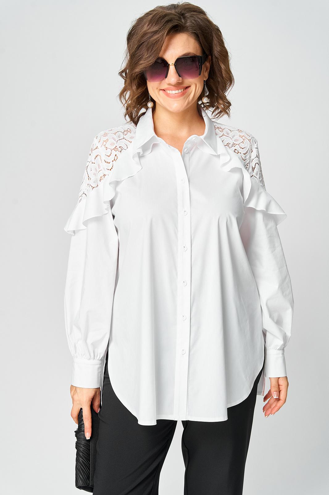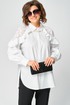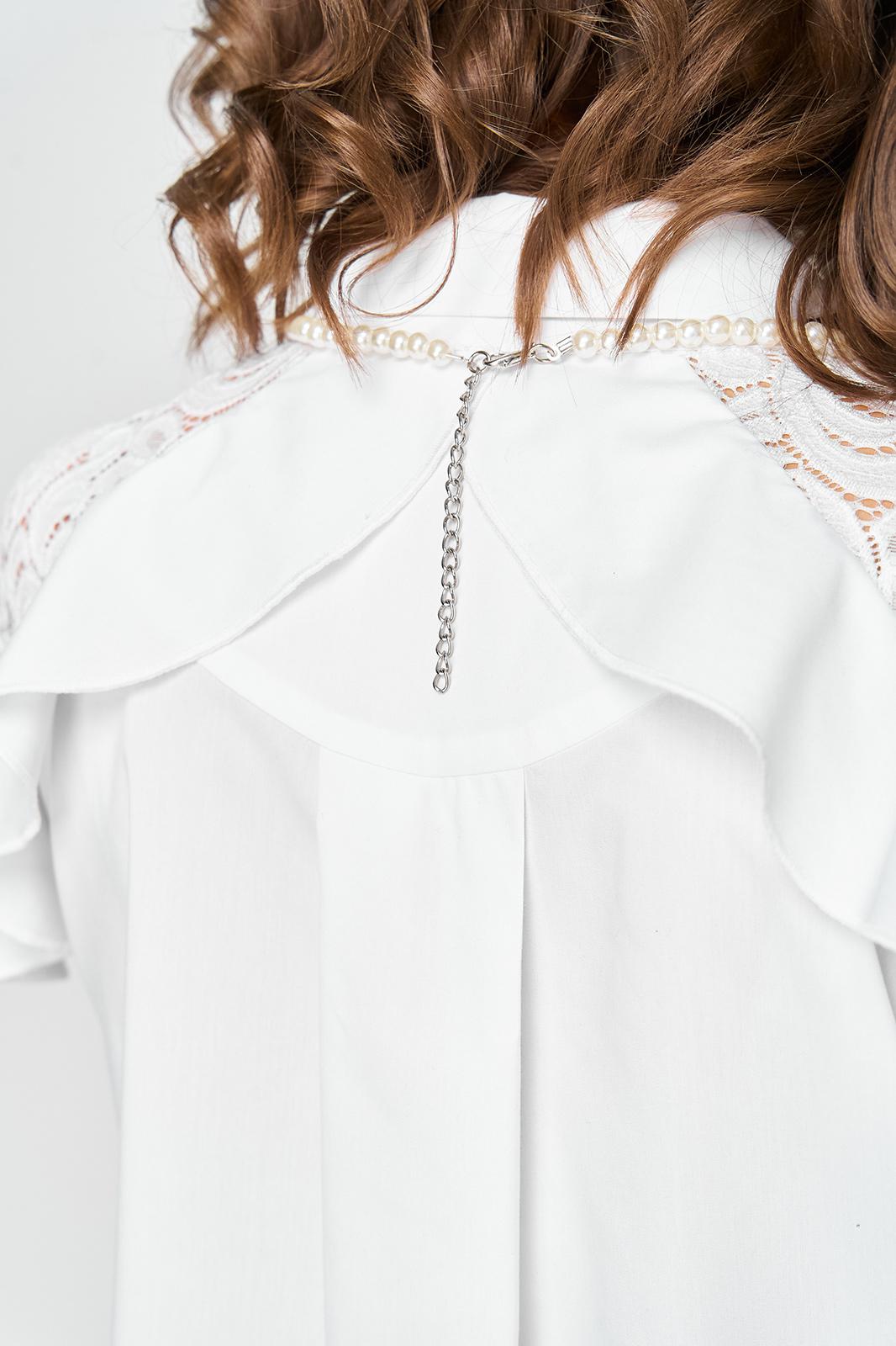 Блузка женская шикарная красивая нарядно-повседневная свободного силуэта выполнена их хлопка в сочетании с элегантным кружевом. Вырез горловины воротник на стойке рубашечного типа, рукав втачной с декоративным подрезом из кружева по низу на притачной манжете. Застежка до верху на обметанные петли и пуговицы. Низ блузы фигурный, в боковых швах обработан разрезы.