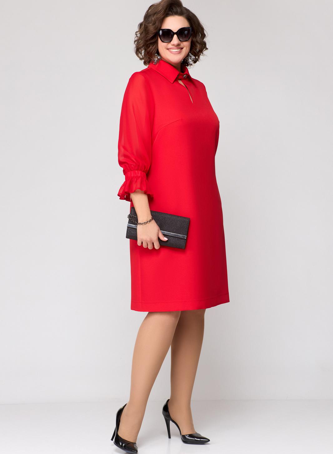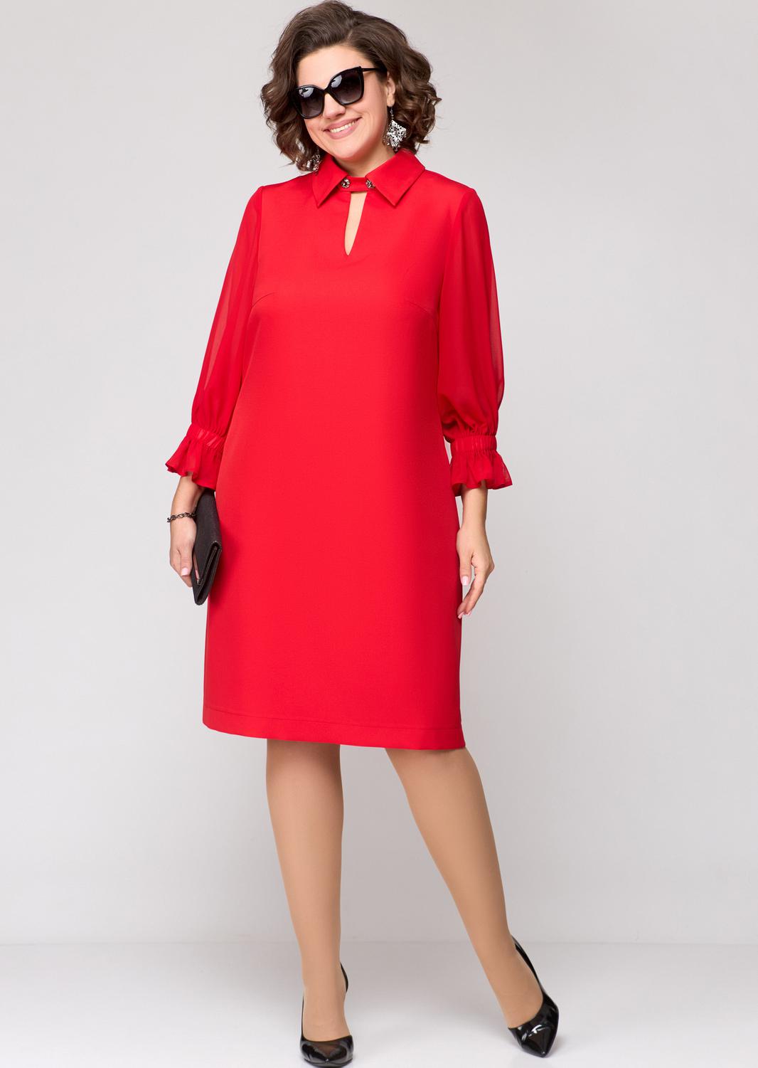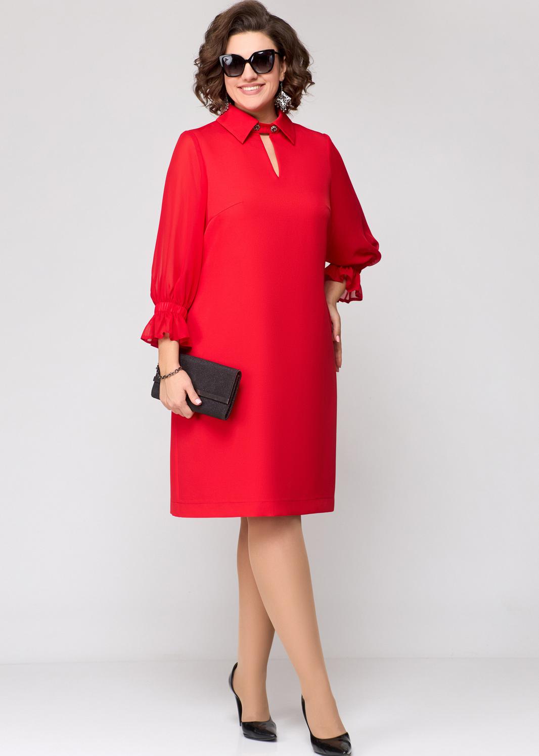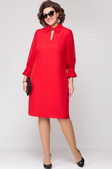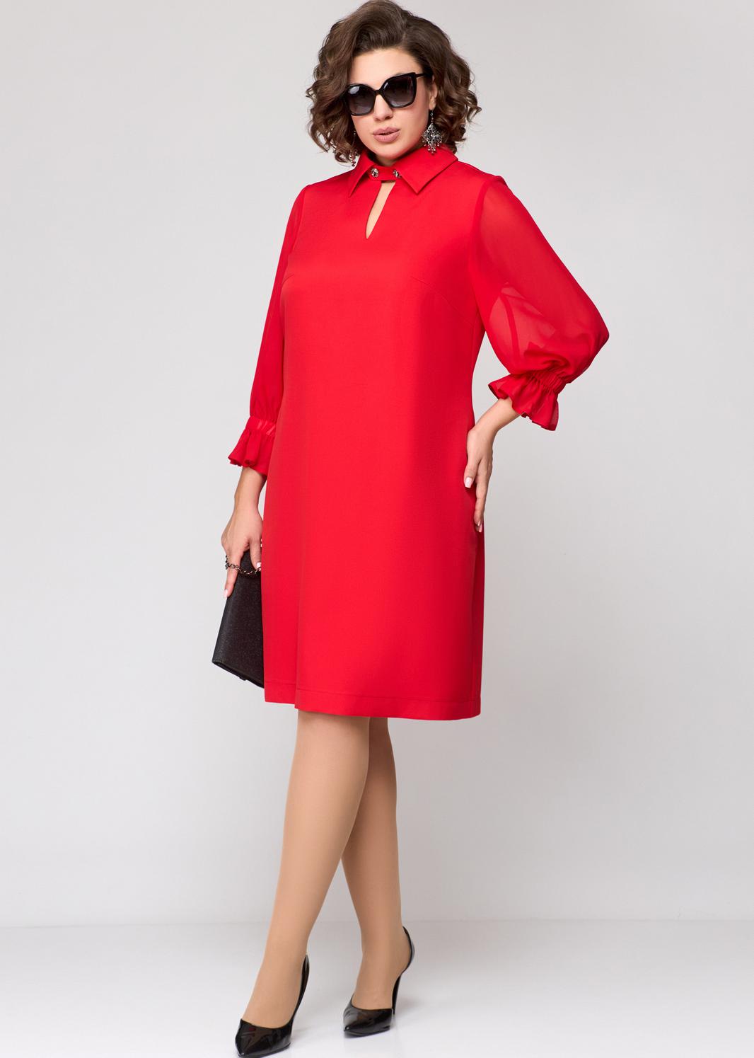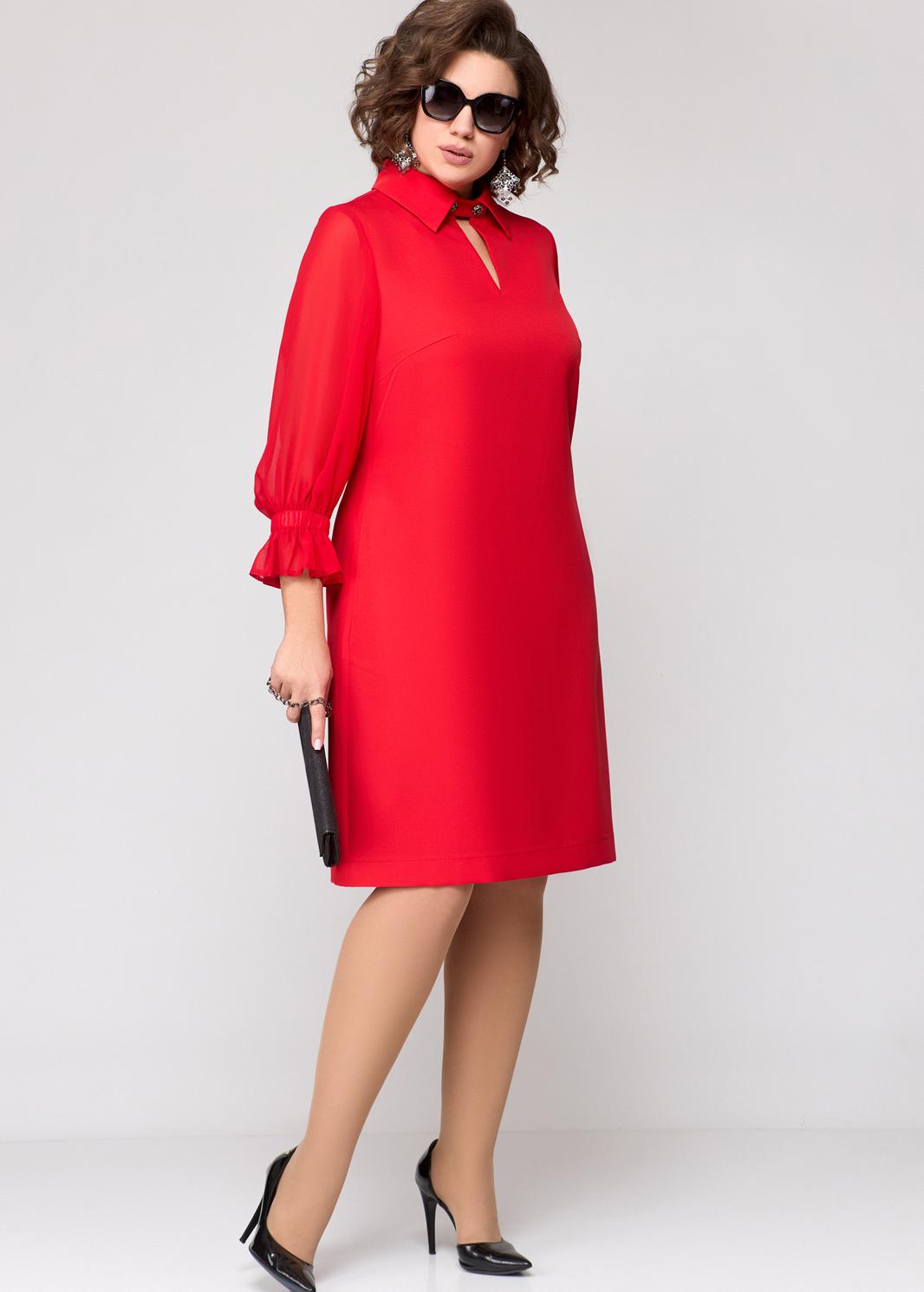 Платье женское нарядно-повседневное А-силуэта выполнено из плательной ткани в сочетании с шифоном. Вырез горловины - воротник на стойке рубашечного типа. По центру переда отделочный элемент в виде капельки зафиксированный патой с отделочными пуговицами. Пата съемная. Рукав втачной 7/8 из шифона по низу с воланом. В боковых швах обработаны карманы. Декором платья служат отделочные пуговицы со стразами.