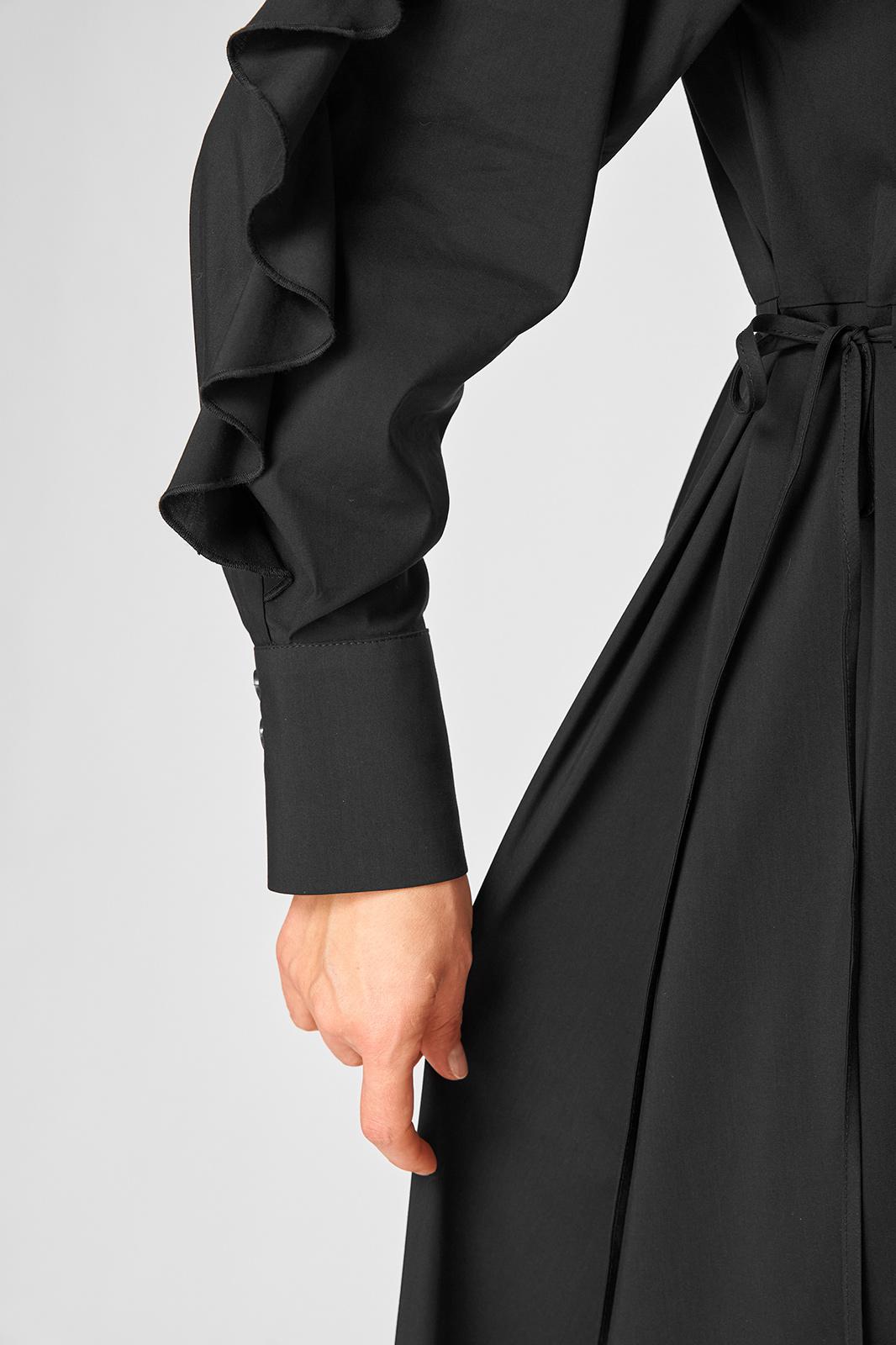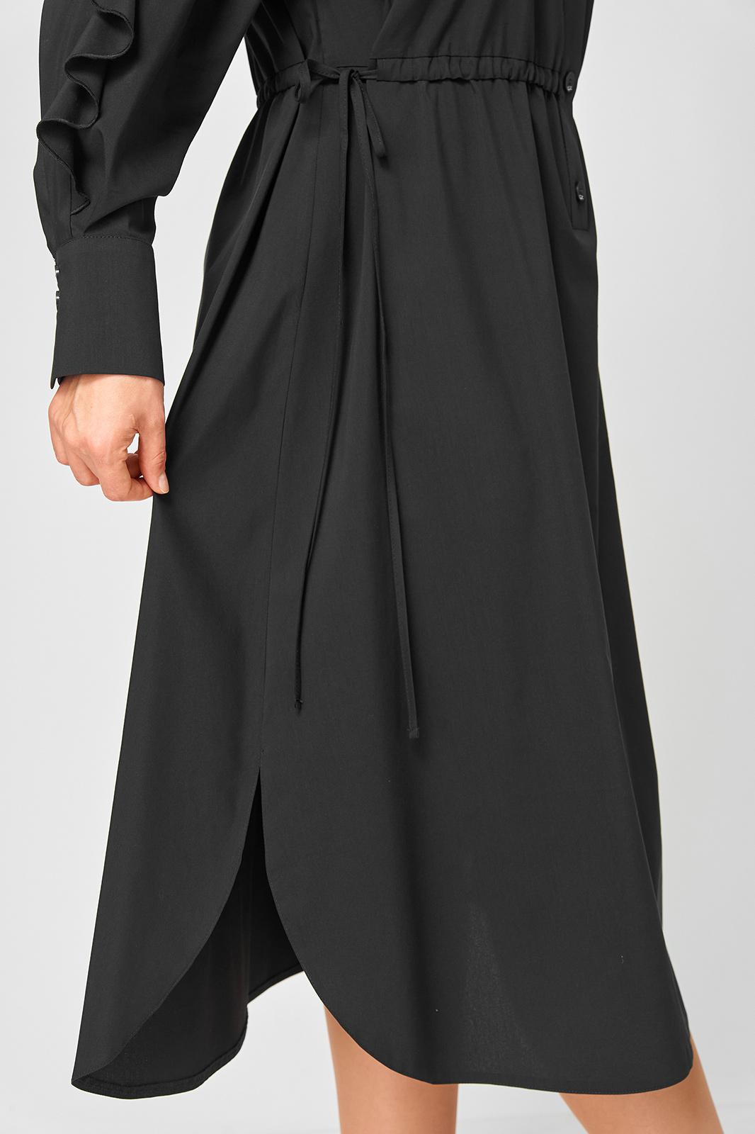 Платье женское полуприлегающего силуэта до пояса в стиле платья-рубашки, выполнено из однотонного хлопка. Трендовый фасон, который сочетает в себе коморт повседневной вещи и элегантность праздника. Вырез горловины воротник на стойке рубашечного типа, застежка планка чуть ниже талии на обметаннве петли и пуговицы. Плечо спущенное, рукав втачной по центру разрезной со вставкой в виде волана на притачной манжете, что придает изделию легкость и изюминку. По полочке и спинке кулиса с руликом входящим к боковым швам. Идеальная талия за 1 секунду. Встроенная кулиска с регулировкой - это гениальное решение, которое подстраивается под вашу фигуру и Вы сами создаете свой восхитительный образ и регулируете свои обьемы. Низ платья фигурный закругленный к боковым швам, что создает удобство в носке и небанальность в изделии. В боковых швах обработаны разрезы. Декором платья служат отделочные пуговицы, кулиска и необычные воланы по рукавам.