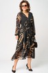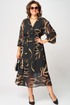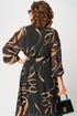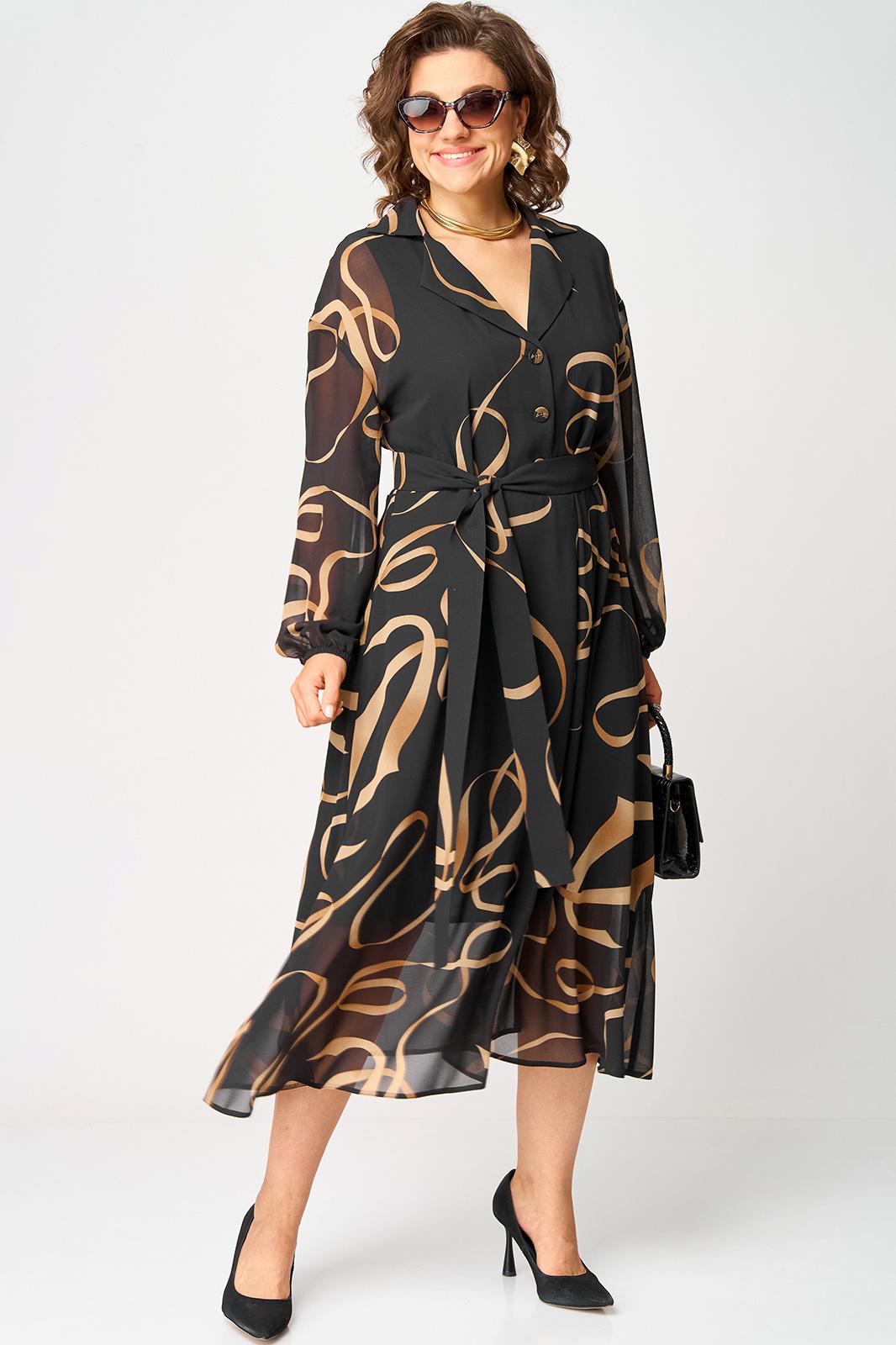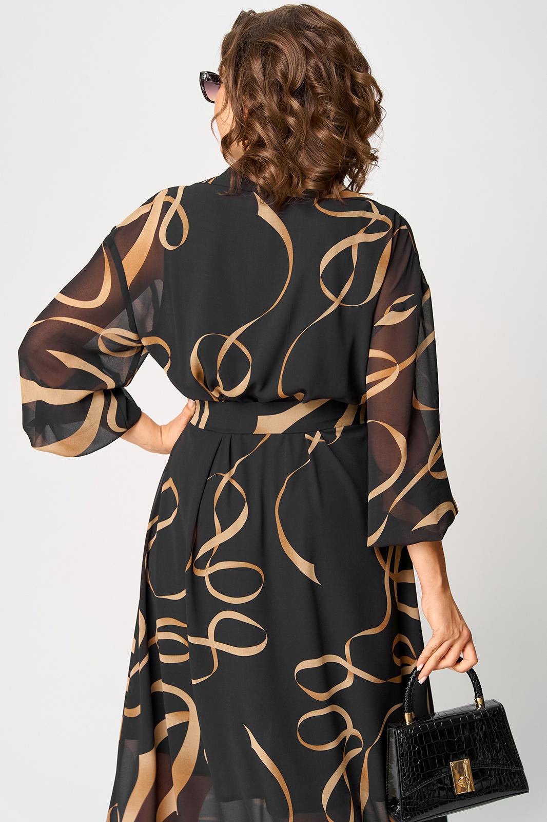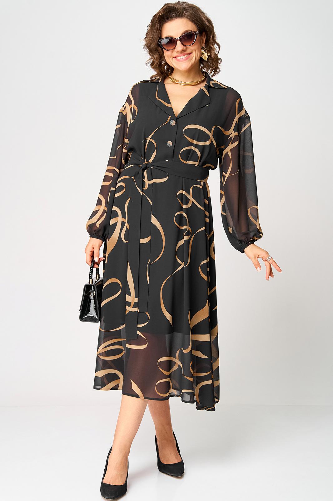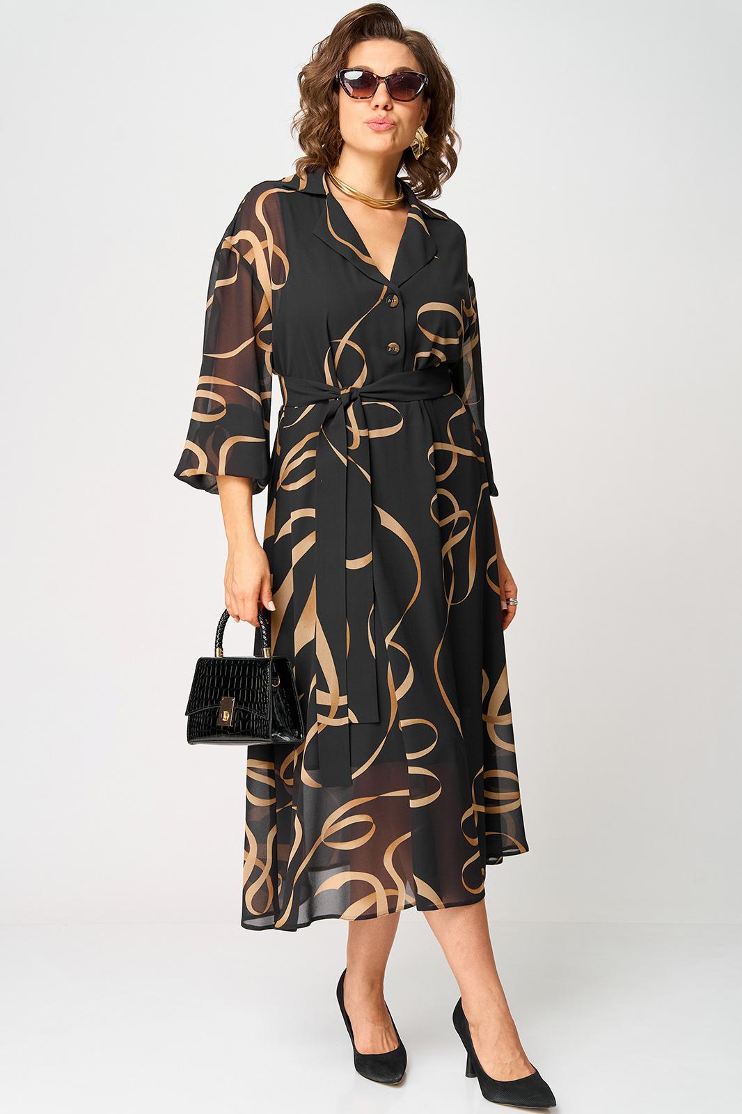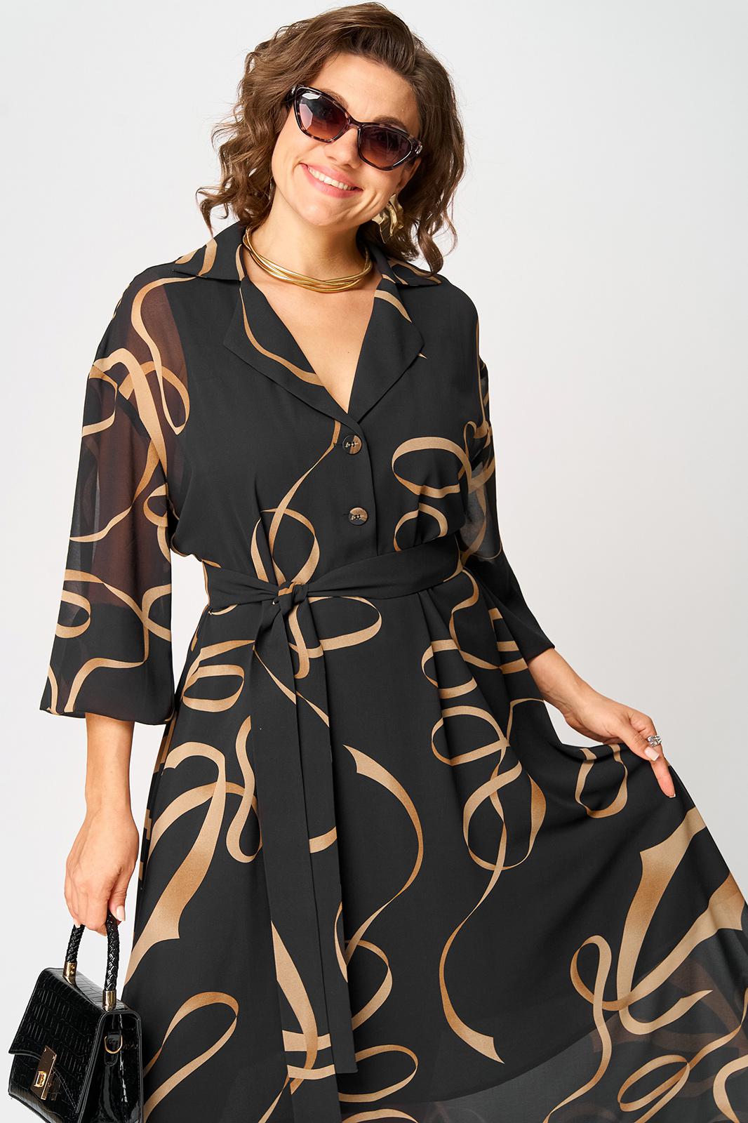 Платье женское нарядно-повседневное полуприлегающего силуэта до талии расширенное к низу. Платье отрезное по талии. Выполнено из креп-шифона. Вырез горловины отложной воротник с подбортами, до талии застежка на обметанные петли и пуговицы. Рукав втачной по низу собран на резинку. Платье на трикотажной подкладке. Декором платья служит съемный пояс и принт самой ткани.