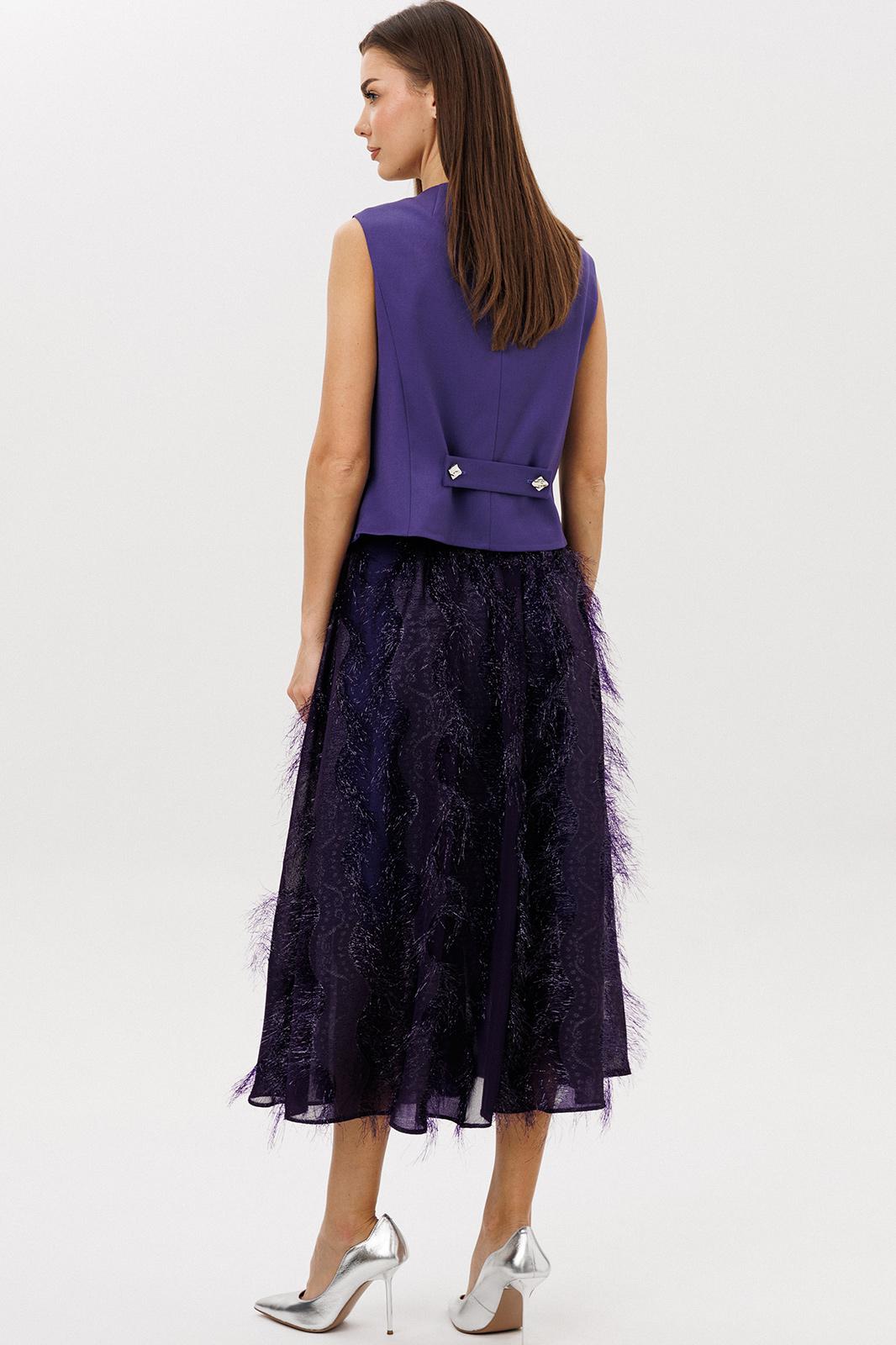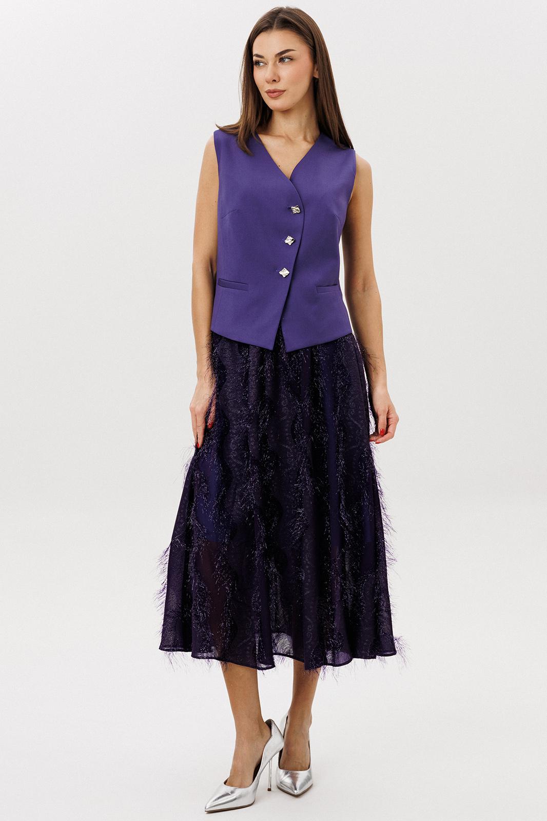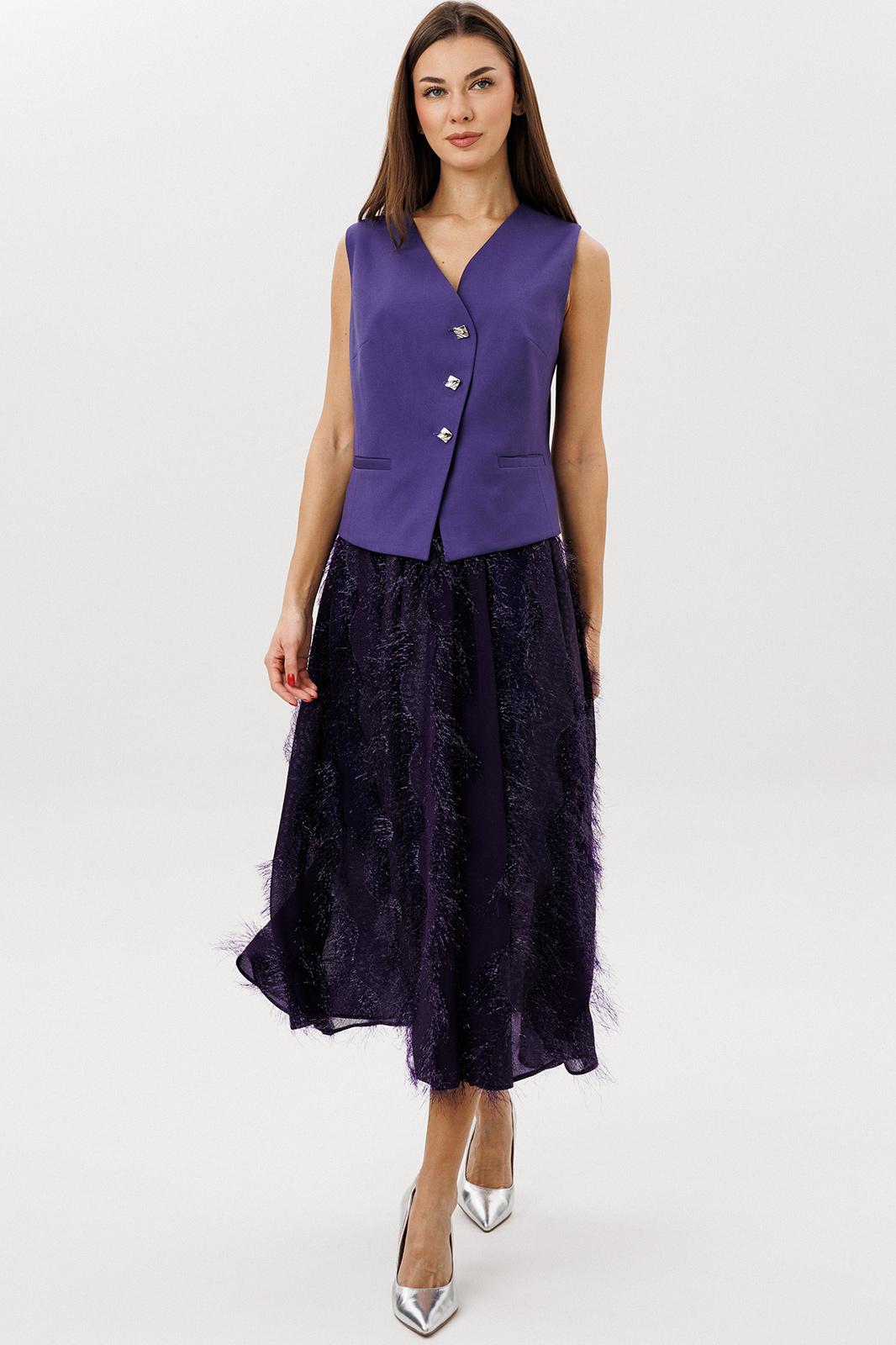 Актуальный комплект, в котором строгая геометрия жилета гармонично сочетается с романтичной женственностью многослойной юбки. Лёгкий шифон с фактурным переливом делает образ выразительным и праздничным, а продуманная посадка юбки обеспечивает красивую линию талии и динамику силуэта.