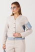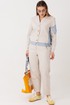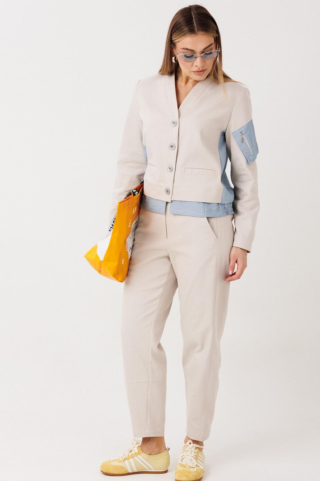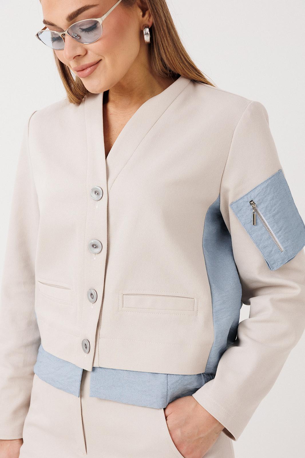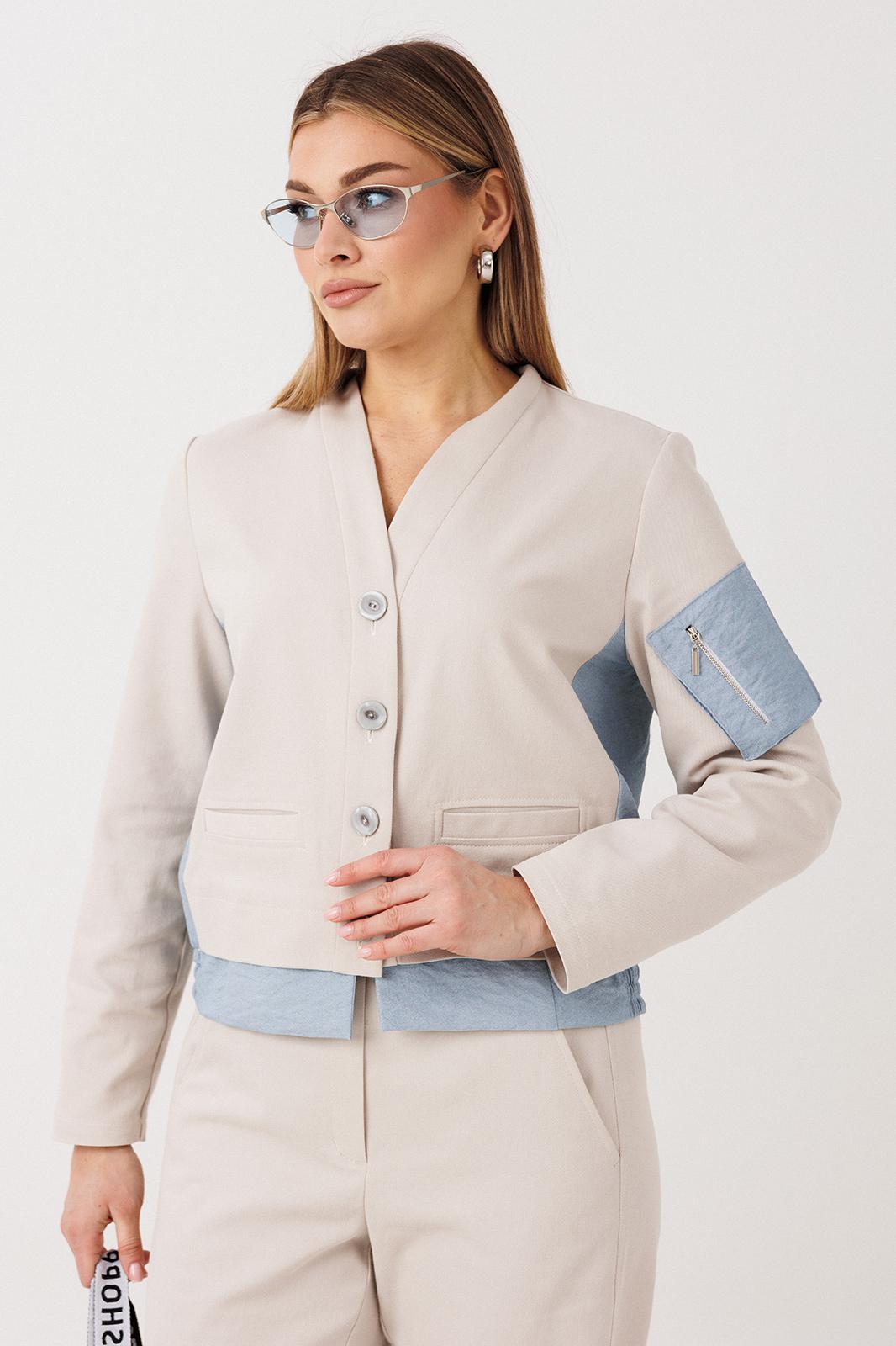 Жакет свободный, упрямленного силуэта, втачного покроя с центральной застежкой на притачной планке. Полочка с прорезным карманом с листочкой. Спинка с отрезной кокеткой, мягкой складкой и притачным поясом на резинке. Рукав одношовный, с локтевой вытачкой и накладным карманом-пеналом с молнией на левом рукаве.