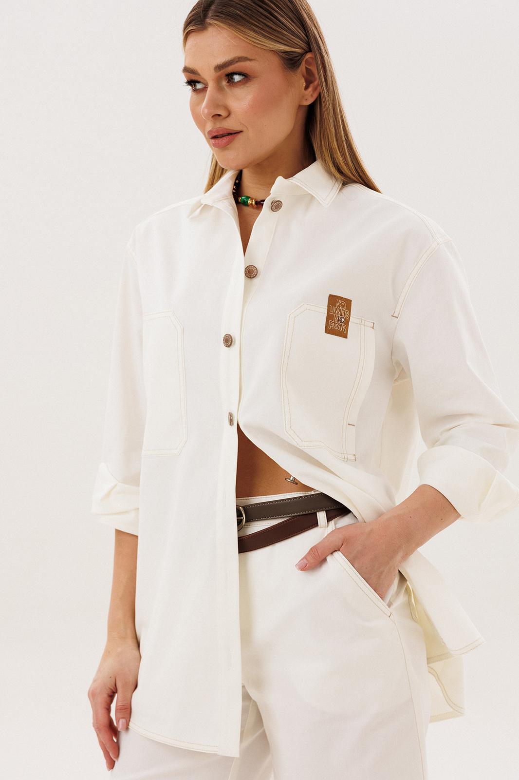 Рубашка выполнена из лёгкого денима, который отлично пропускает воздух и обеспечивает комфорт даже в жаркую погоду. Свободный силуэт и минималистичные детали делают модель универсальной — её можно носить как самостоятельный элемент или в составе комплекта.