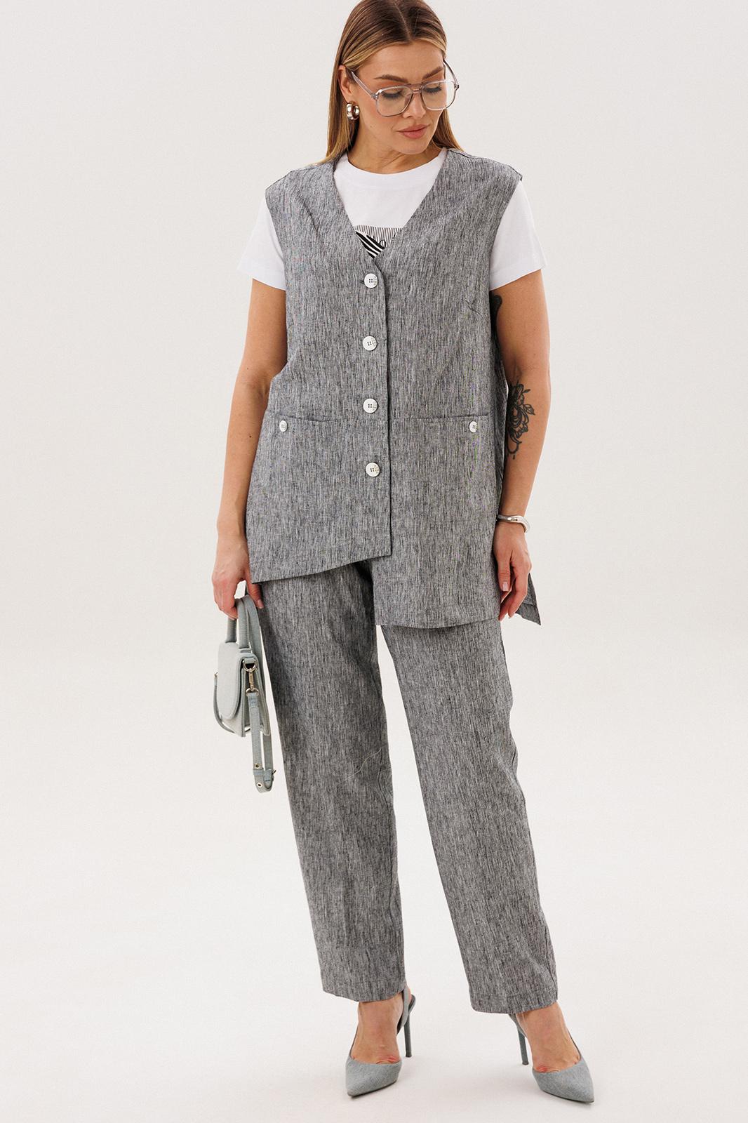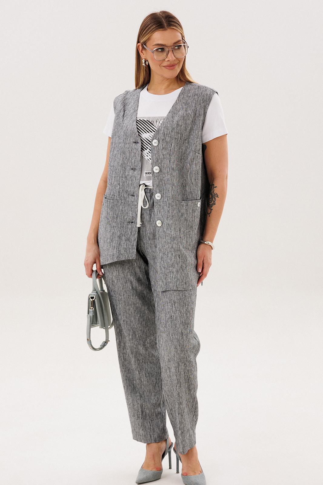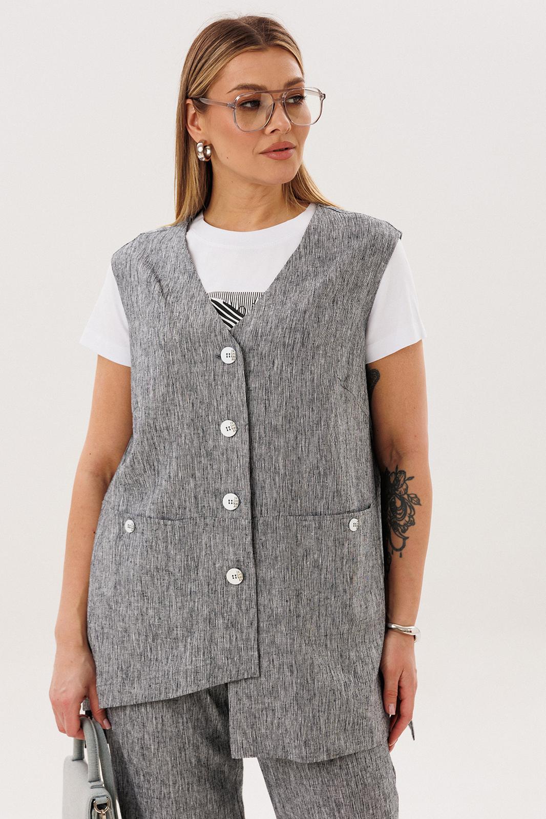 Стильный и актуальный образ - жилет на базовую футболку плюс брюки в расслабленном стиле. Практичный и удобный - это лучший вариант для летней жары. Свободный жилет, который можно носить и без футболки, удлиненный с разноуровневым ассиметричным низом, удлиненной спинкой, боковыми разрезами и карманами в швах.