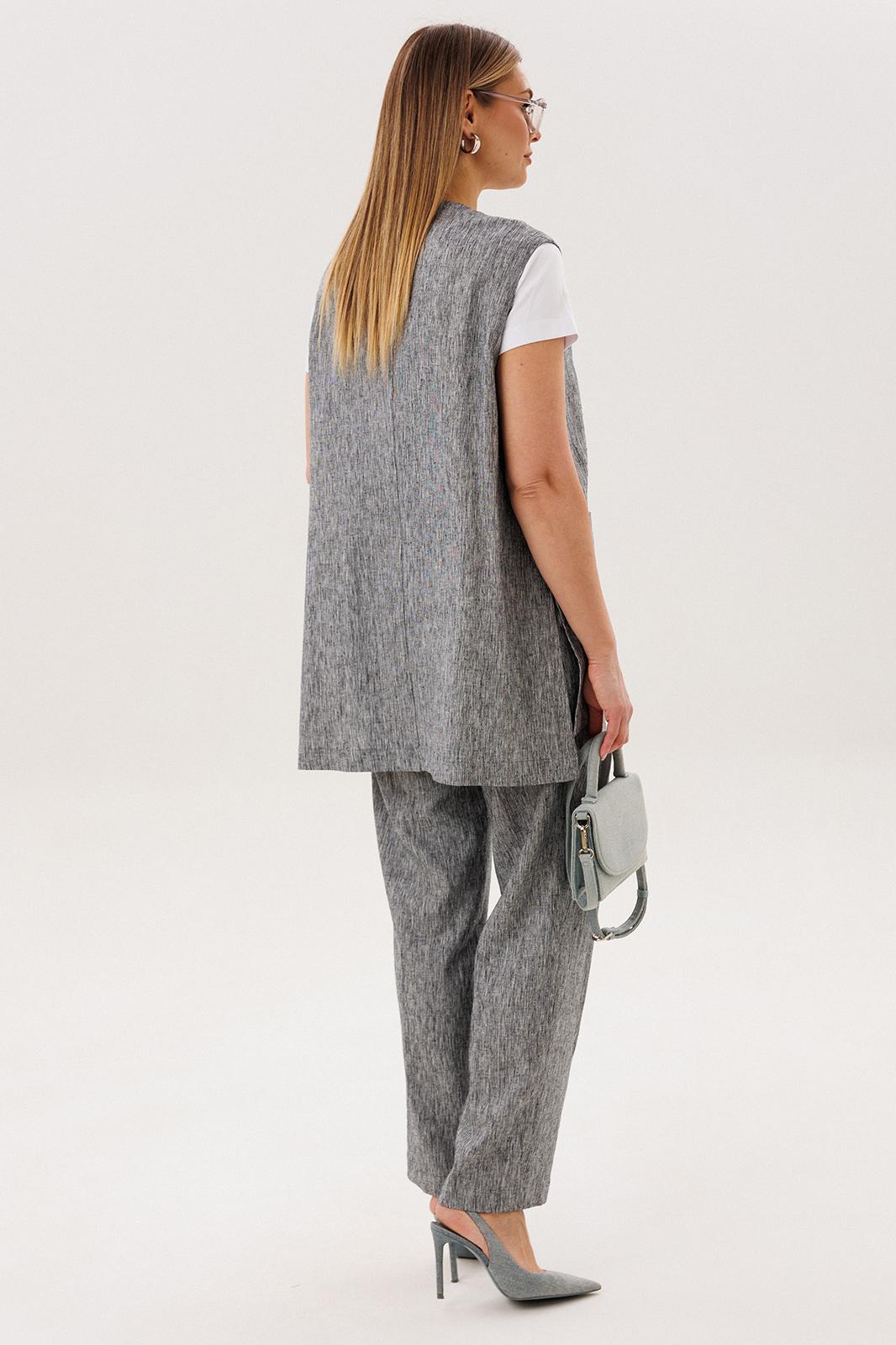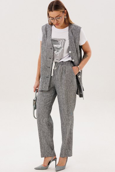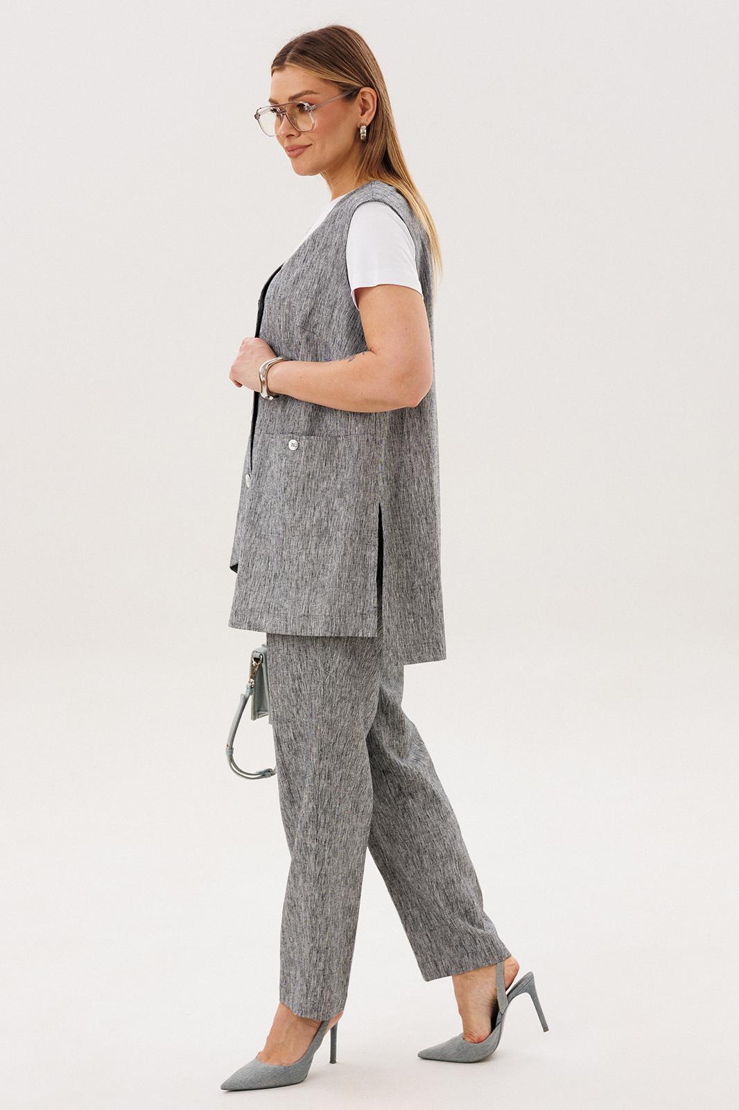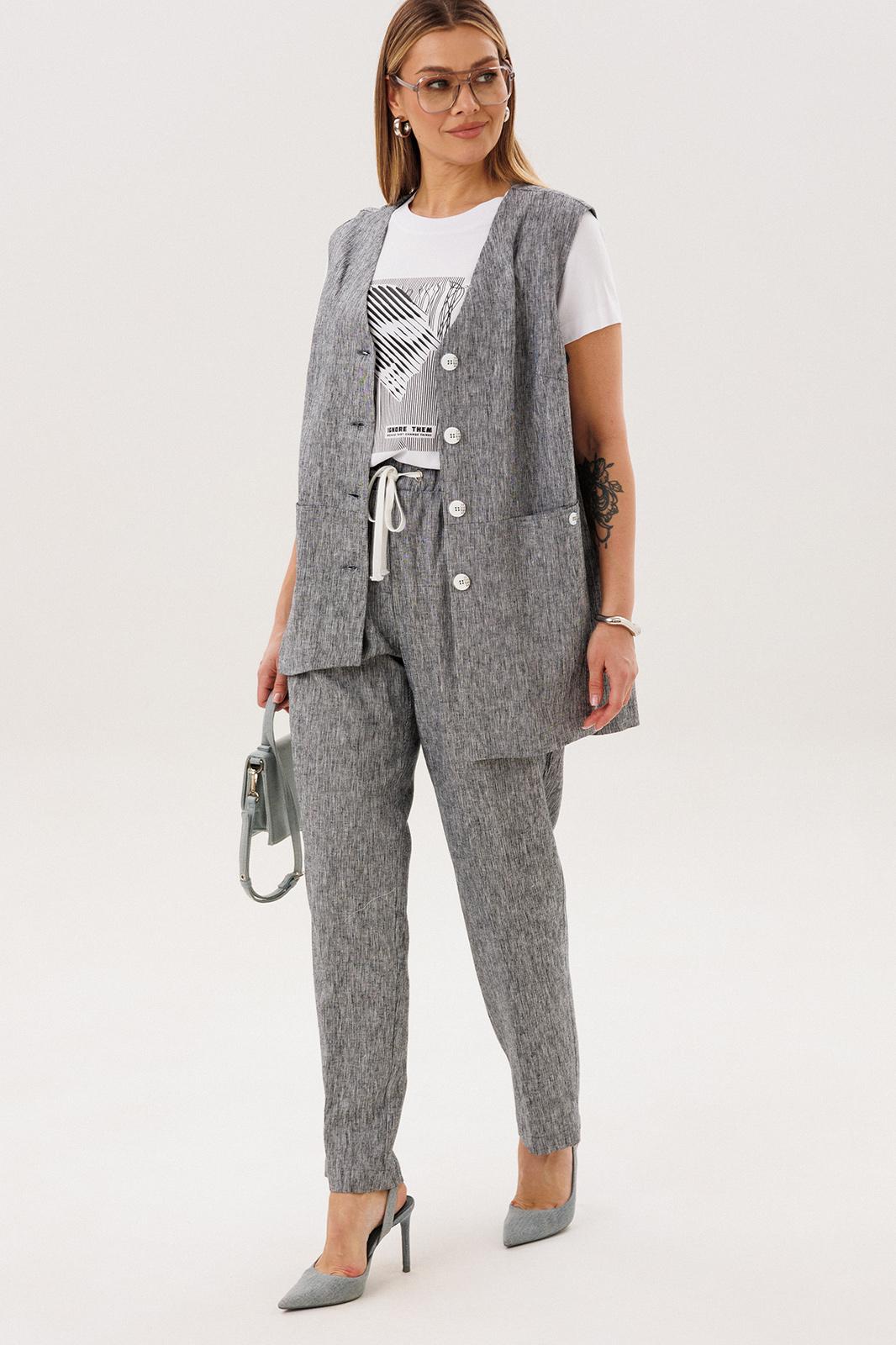 Стильный и актуальный образ - жилет на базовую футболку плюс брюки в расслабленном стиле. Практичный и удобный - это лучший вариант для летней жары. Свободный жилет, который можно носить и без футболки, удлиненный с разноуровневым ассиметричным низом, удлиненной спинкой, боковыми разрезами и карманами в швах.