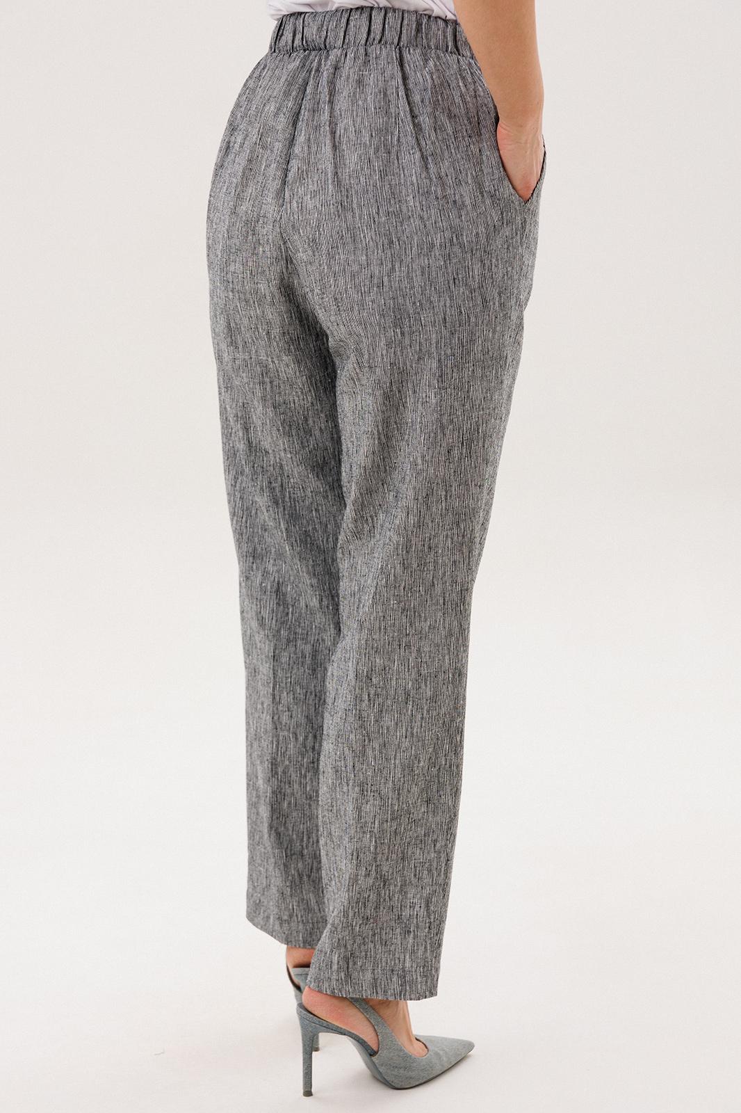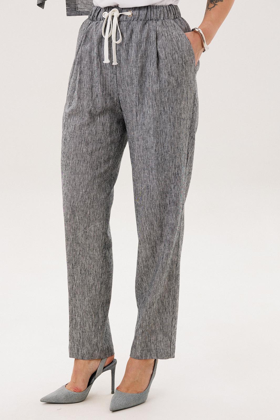Брюки в расслабленном стиле, слегка зауженные к низу, на притачном эластичном поясе с люверсами и отделочным шнуром, с наклонными боковыми карманами и мягкой складкой на передних половинках.