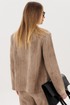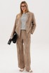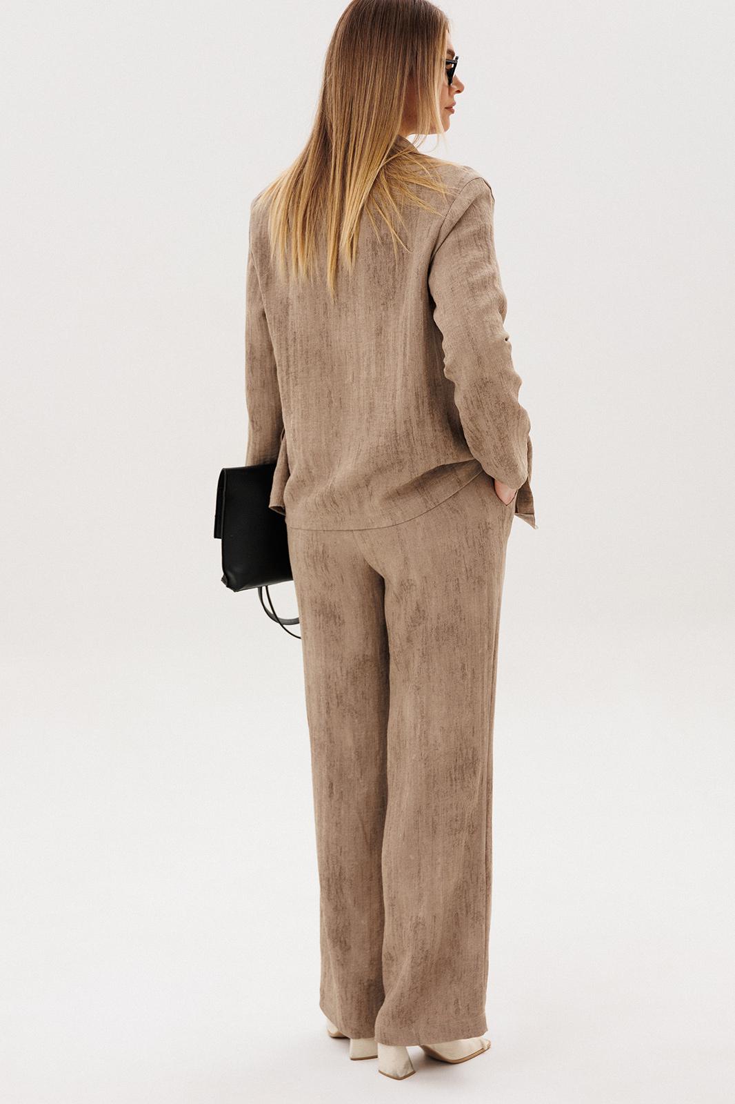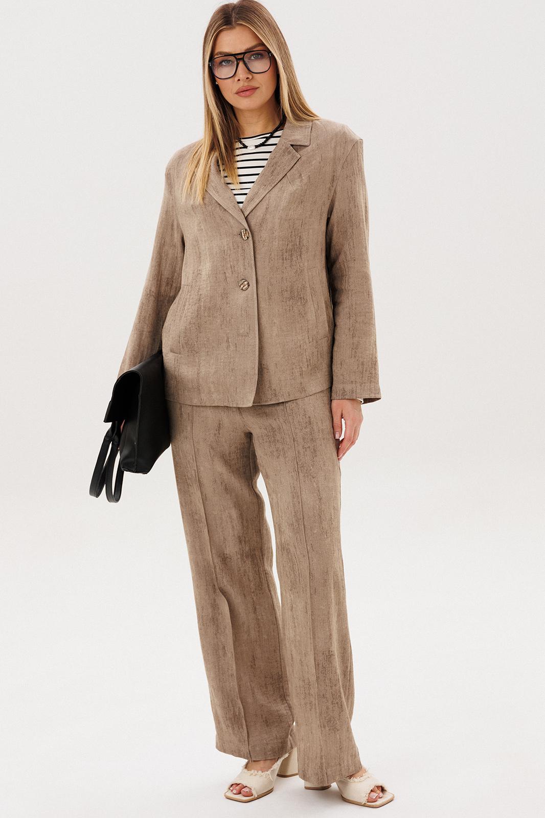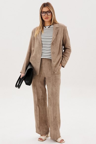 Жакет и брюки формируют лаконичный, структурированный силуэт, визуально вытягивая фигуру. Широкий крой брюк добавляет образу динамики и обеспечивает свободу движений.