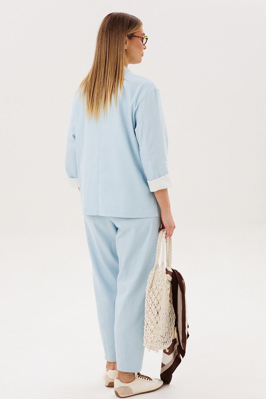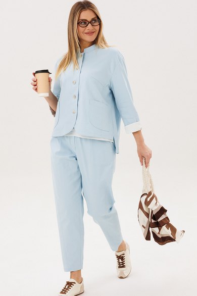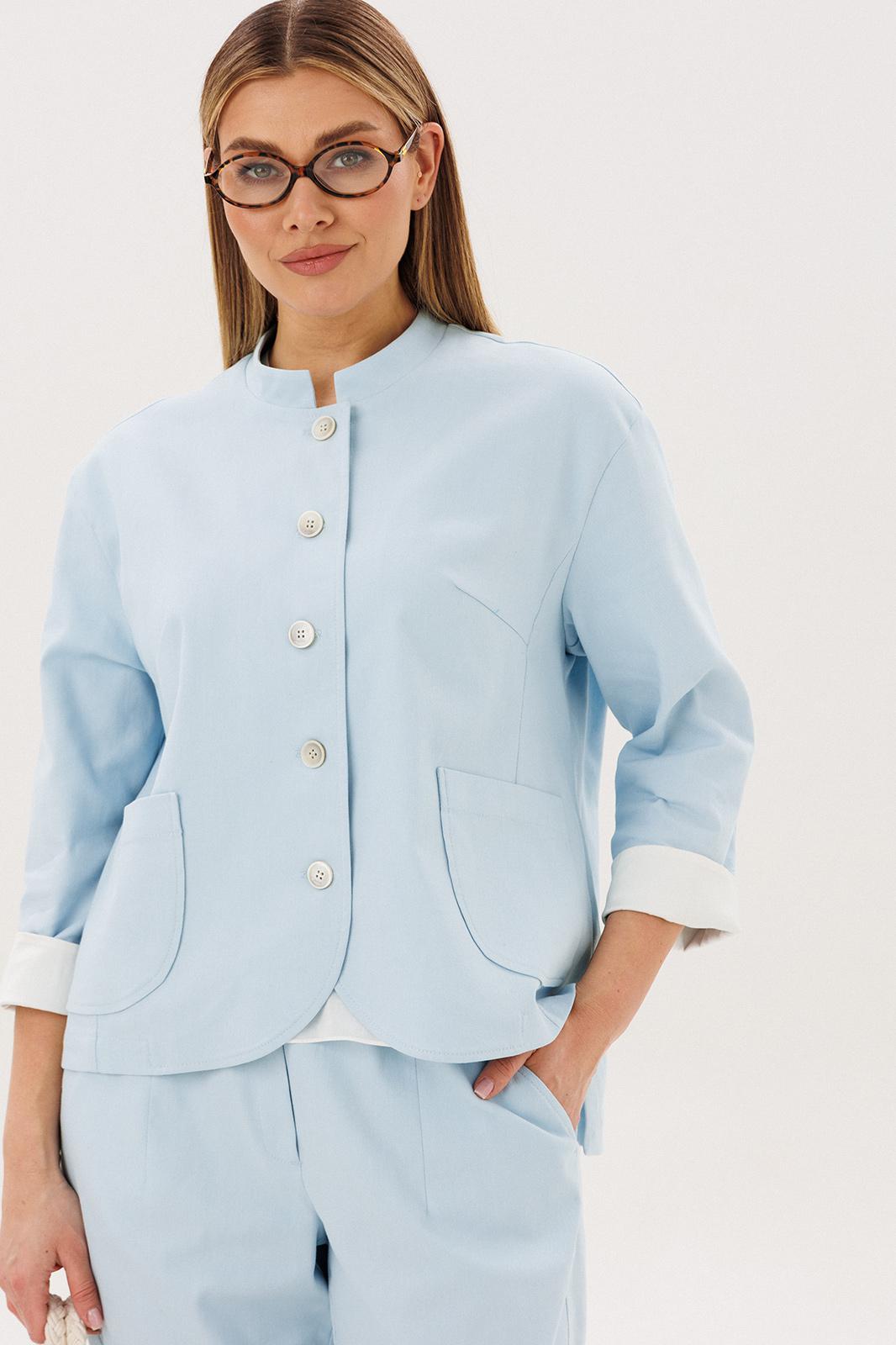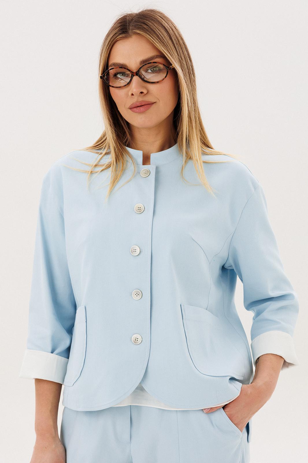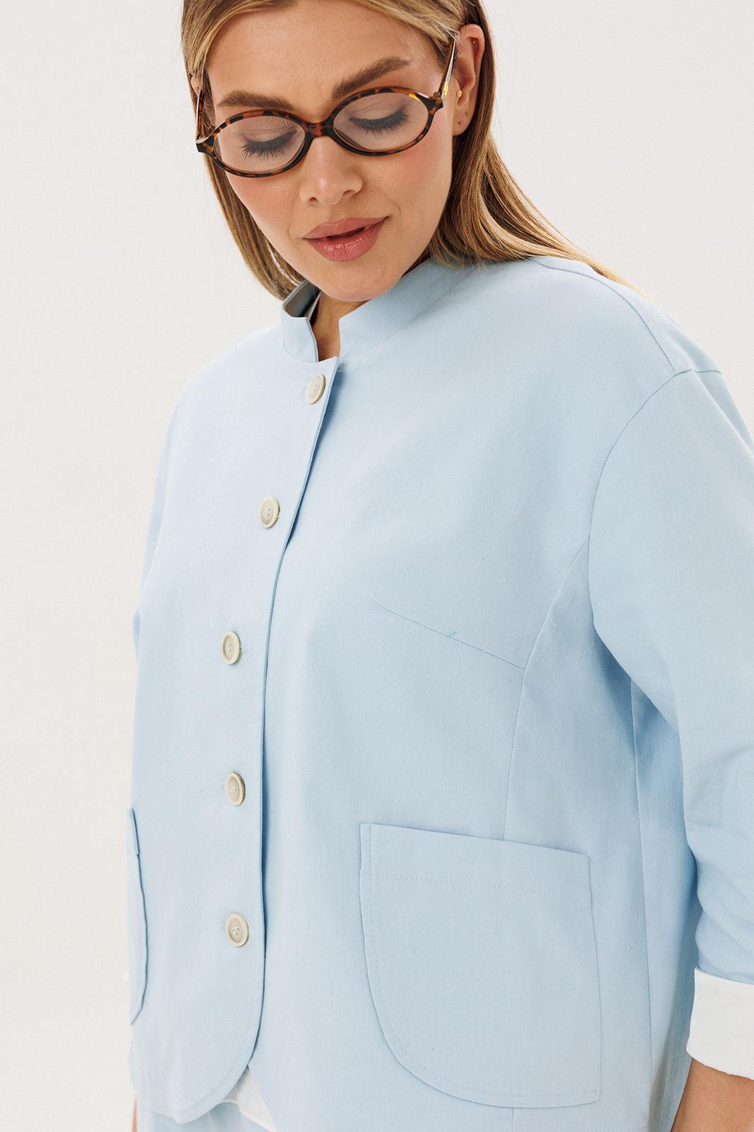 Жакет из натурального хлопка обеспечивает комфорт и отлично держит форму, подчёркивая аккуратный силуэт. Минималистичный дизайн с аккуратной линией горловины и пуговицами делает модель универсальной и современной.