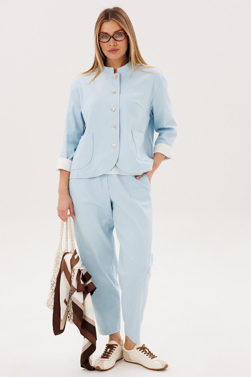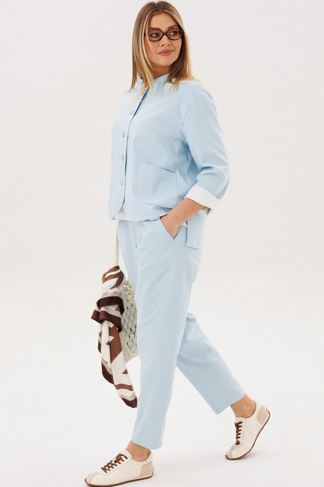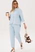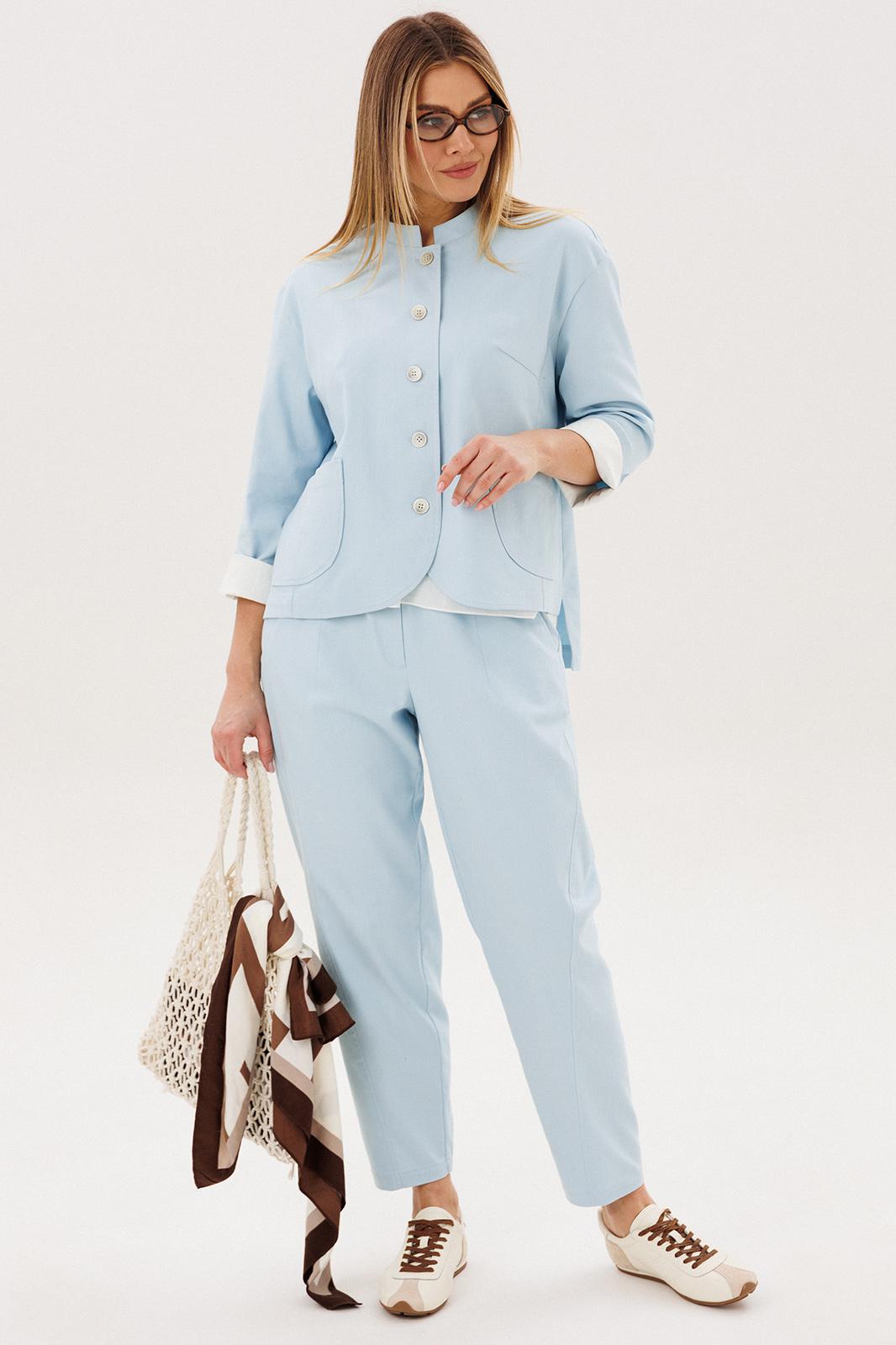 Стильный брючный комплект — идеальное сочетание комфорта и утончённой элегантности. Модель выполнена в нежном голубом оттенке и дополнена трендовой атласной блузой, создавая актуальный и гармоничный образ на каждый день.