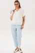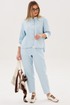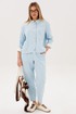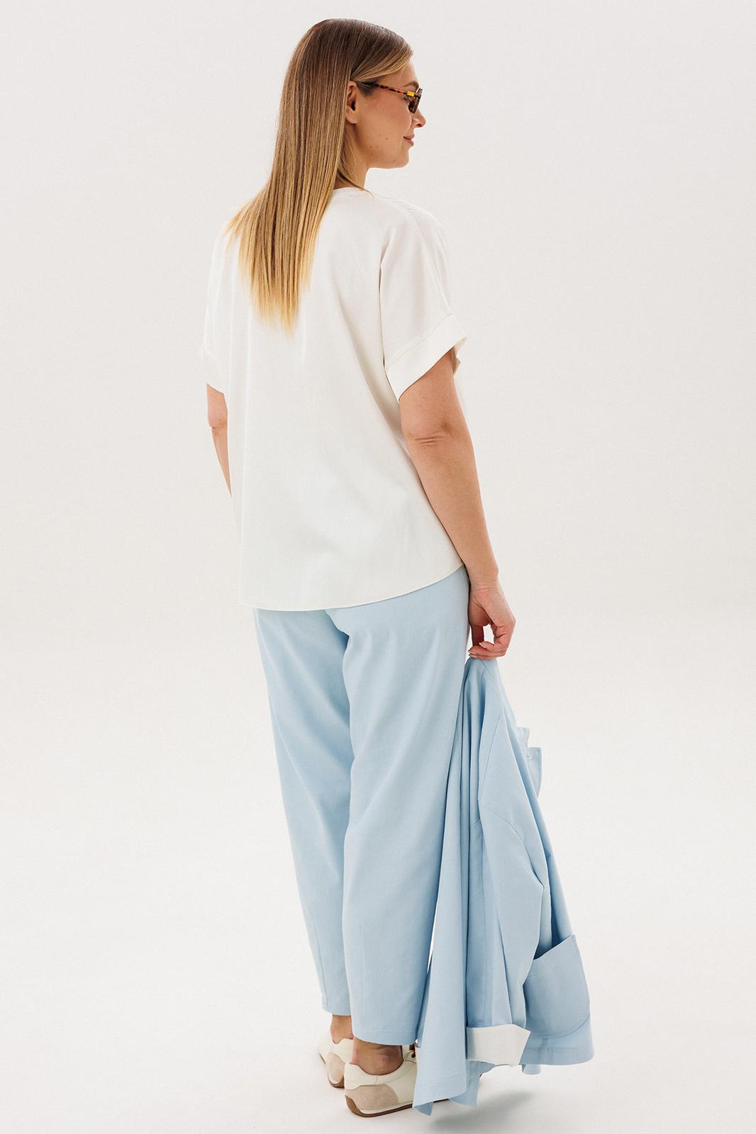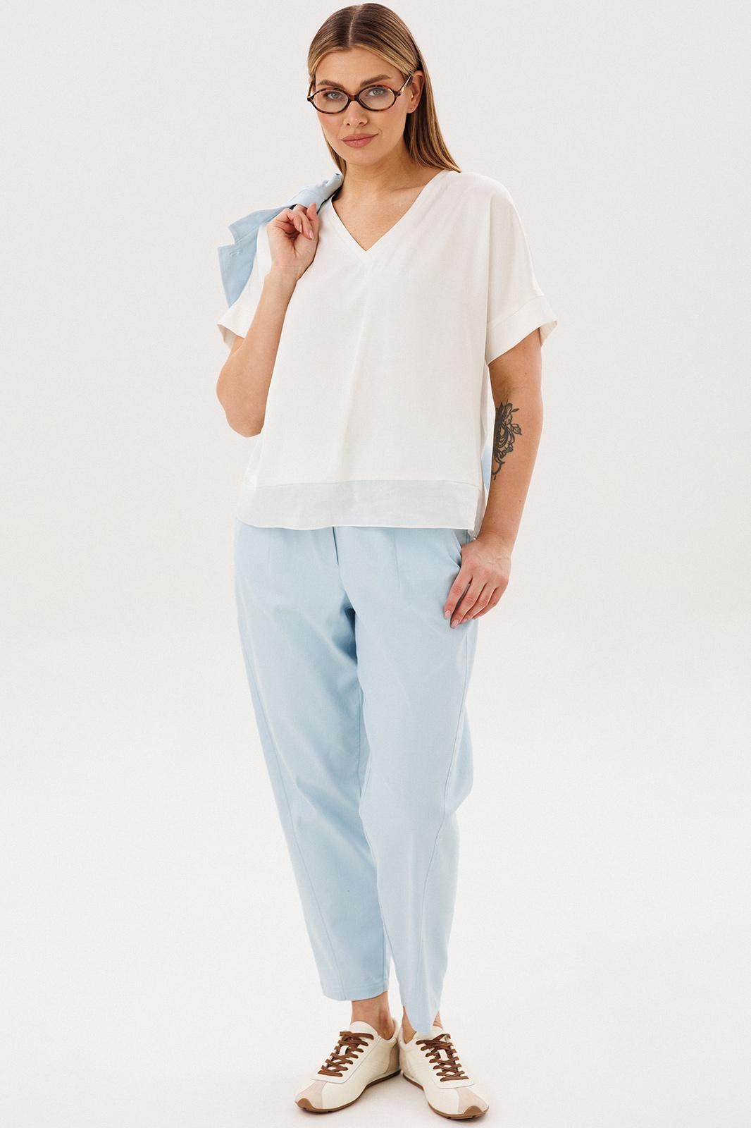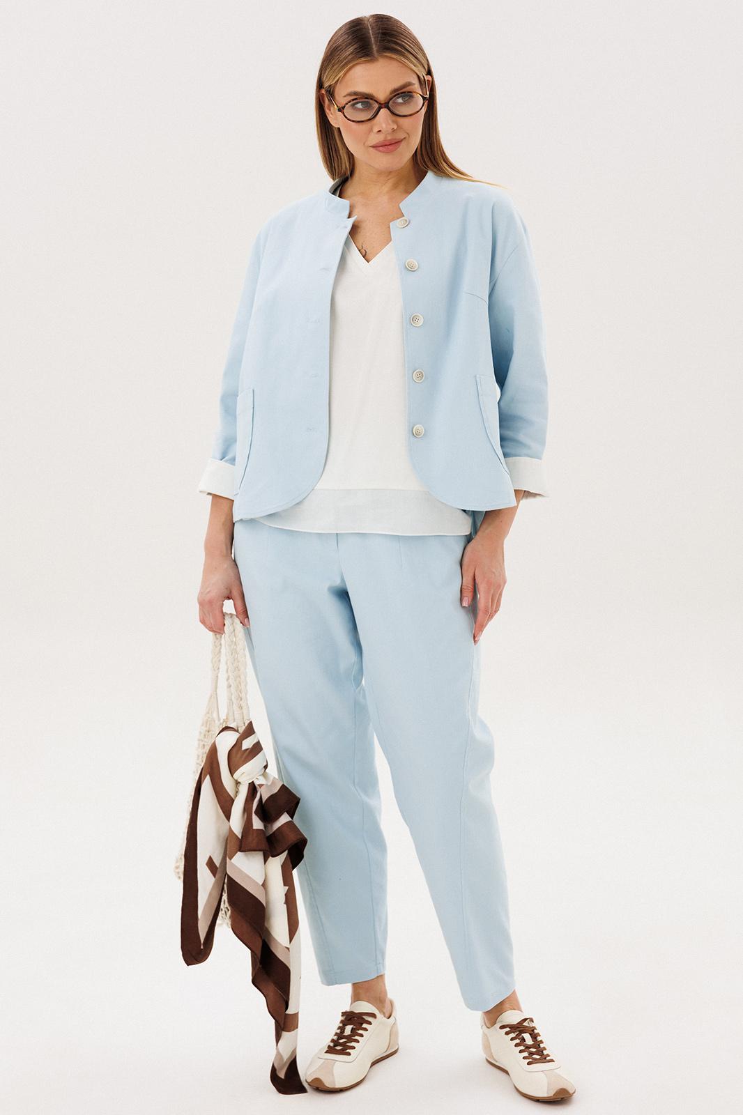 Стильный брючный комплект — идеальное сочетание комфорта и утончённой элегантности. Модель выполнена в нежном голубом оттенке и дополнена трендовой атласной блузой, создавая актуальный и гармоничный образ на каждый день.