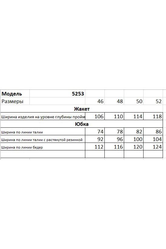 Пиджак классического покроя, слегка упрямленный, с центральной застежкой, английским воротником и втачным двухшовным рукавом со шлицей. Полочка с нагрудной вытачкой, с прорезным карманом с рамкой и клапаном, отрезным бочком. На левой полочке оригинальный нагрудной карман с отделочной деталью. Спинка со средним швом и плечевой вытачкой. Юбка на притачном поясе, со шлевками, эластичном в области спинки, на комфортной трикотажной подкладке. Переднее полотнище с наклонными боковыми карманами, заднее с горизонтальным членением ниже линии бедер, сложной шлицей с запахом, центральным швом с застежкой. Пояс в комплект не входит