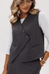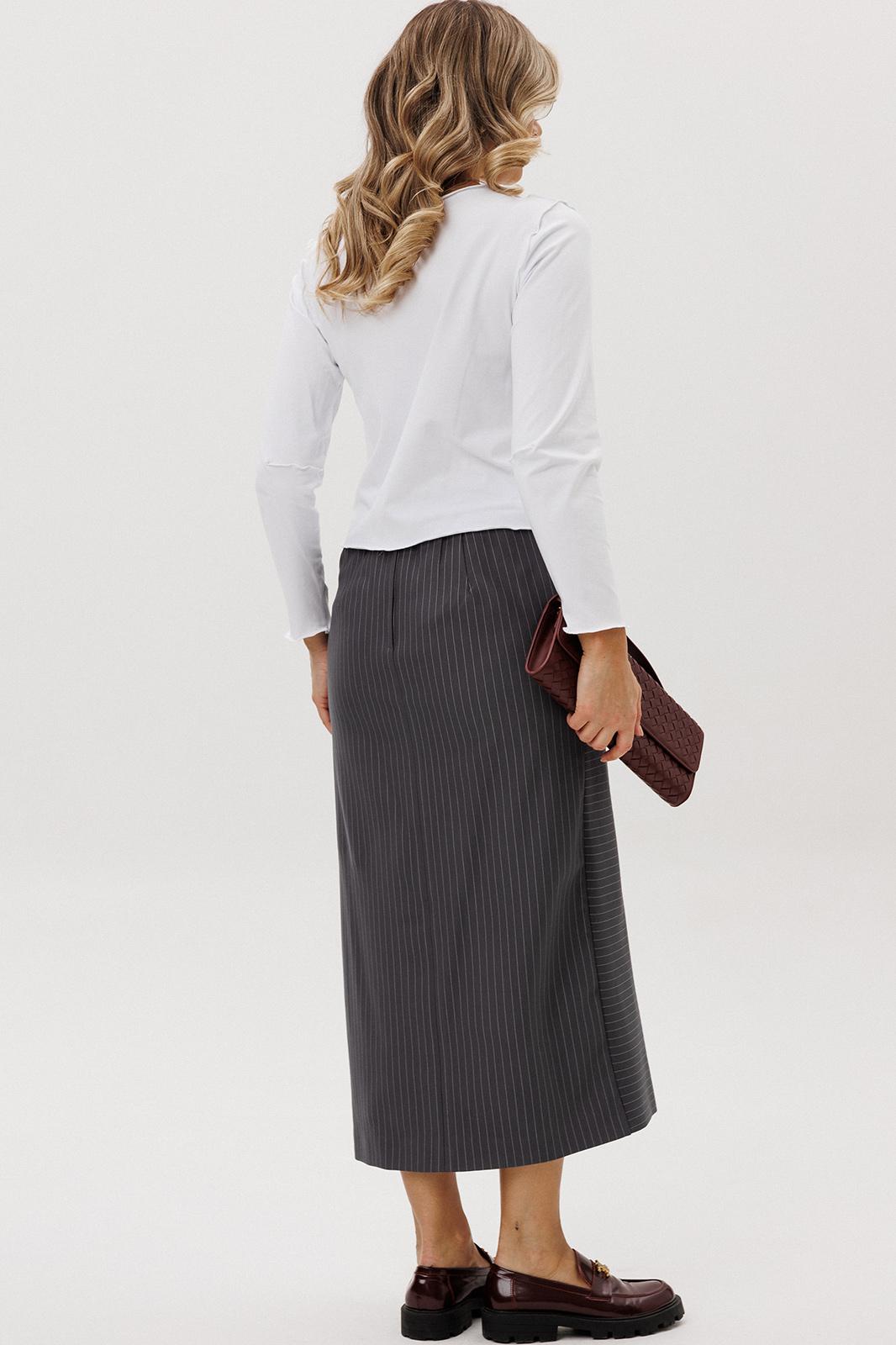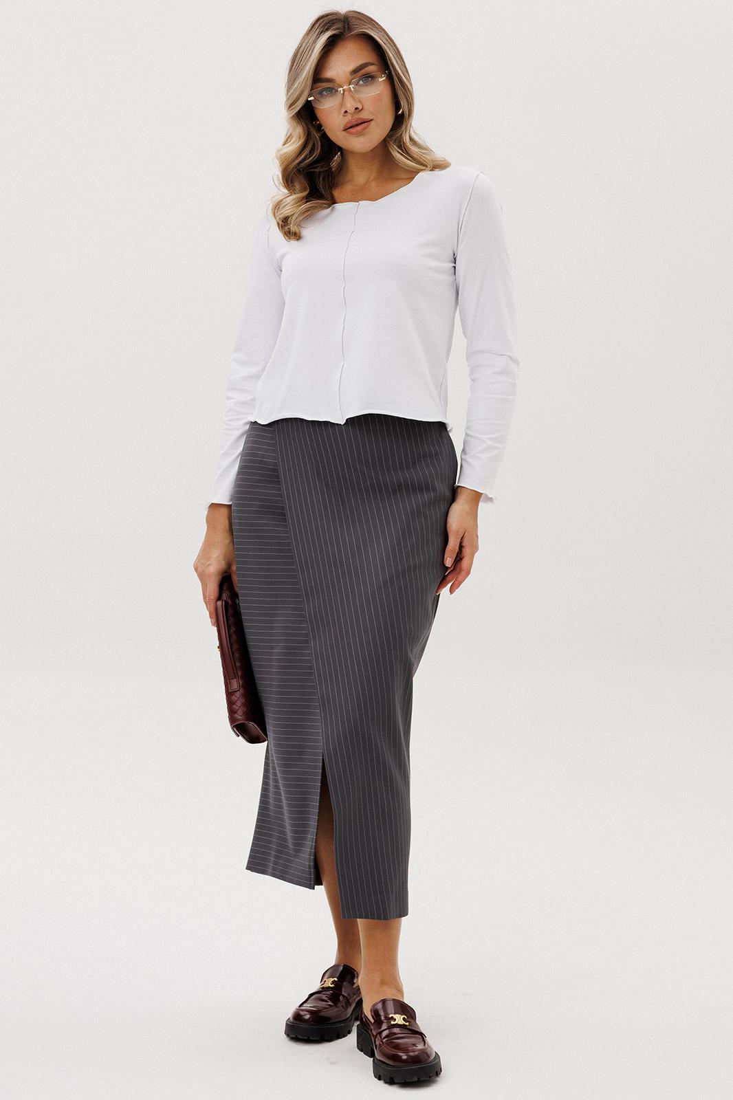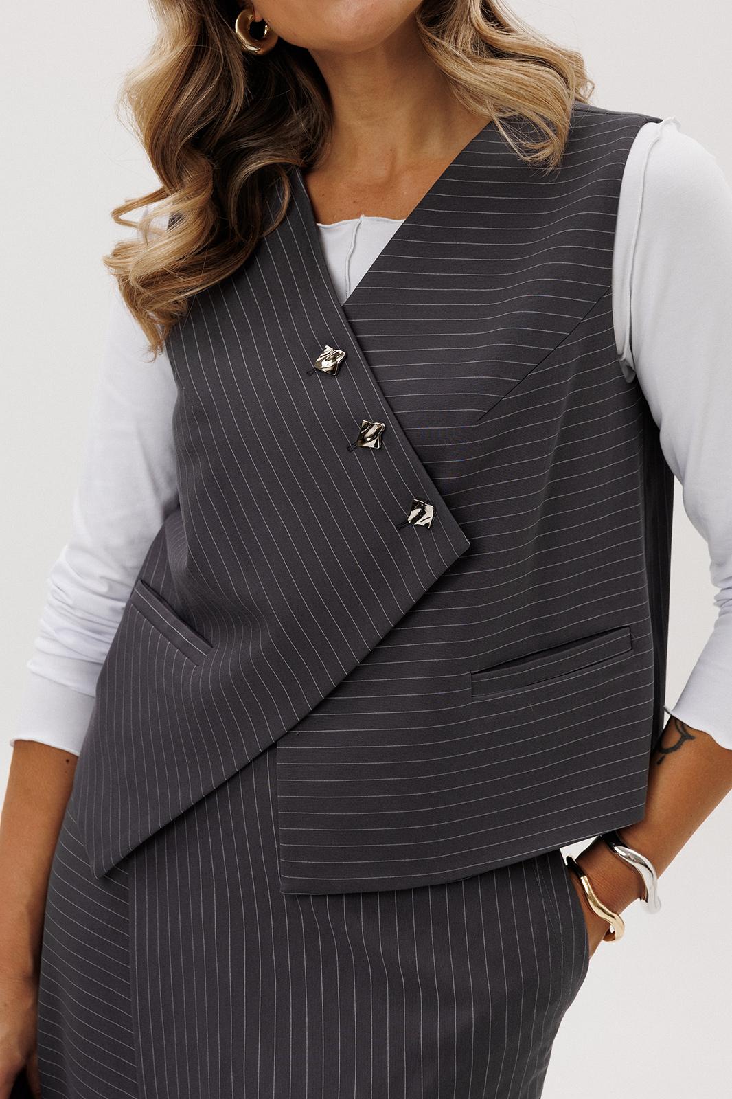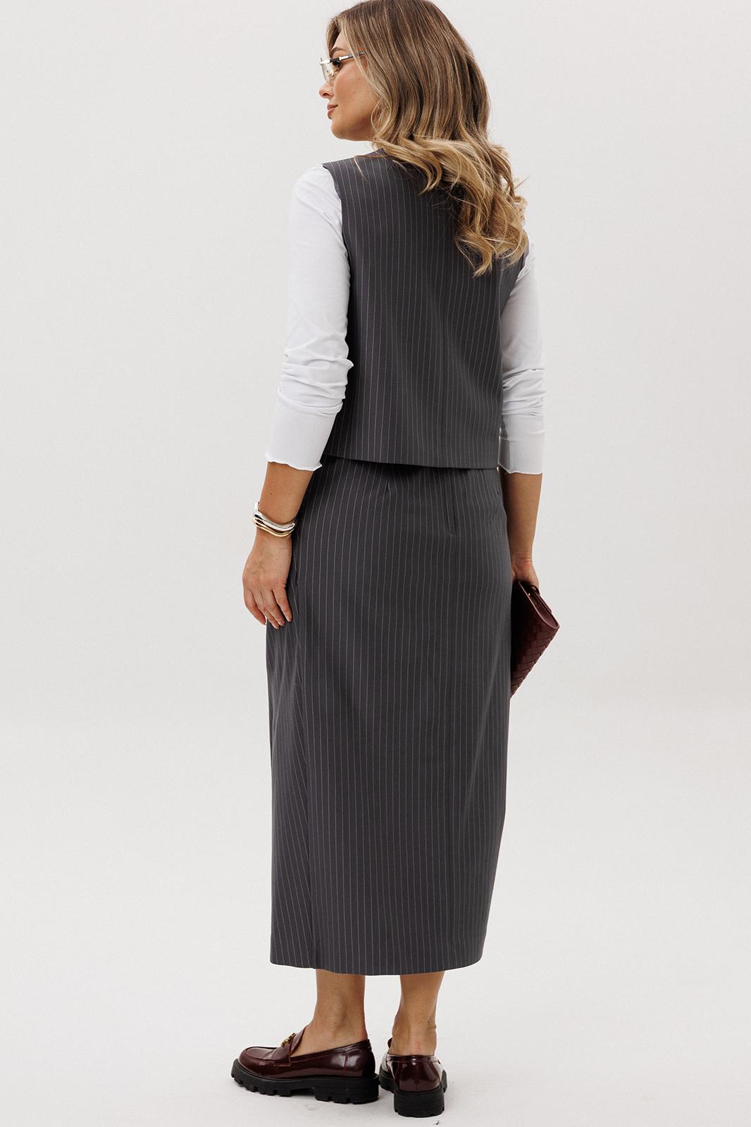 Стильный женский костюм в полоску — идеальное сочетание элегантности и современного минимализма. Комплект состоит из жилета оригинального кроя с асимметричной застёжкой, прямой юбки миди с мягким запахом и джемпера с длинным рукавом.