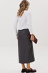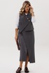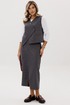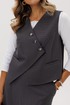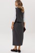 Модель выполнена из плотной трикотажной ткани с тонкой вертикальной полоской, которая визуально вытягивает силуэт и подчёркивает стройность. Жилет без рукавов застёгивается на декоративные пуговицы, создавая выразительный акцент в образе. Юбка миди с запахом добавляет женственности и комфорта при движении. Джемпер трикотажный, с длинным рукавом, полуприлегающего силуэта.