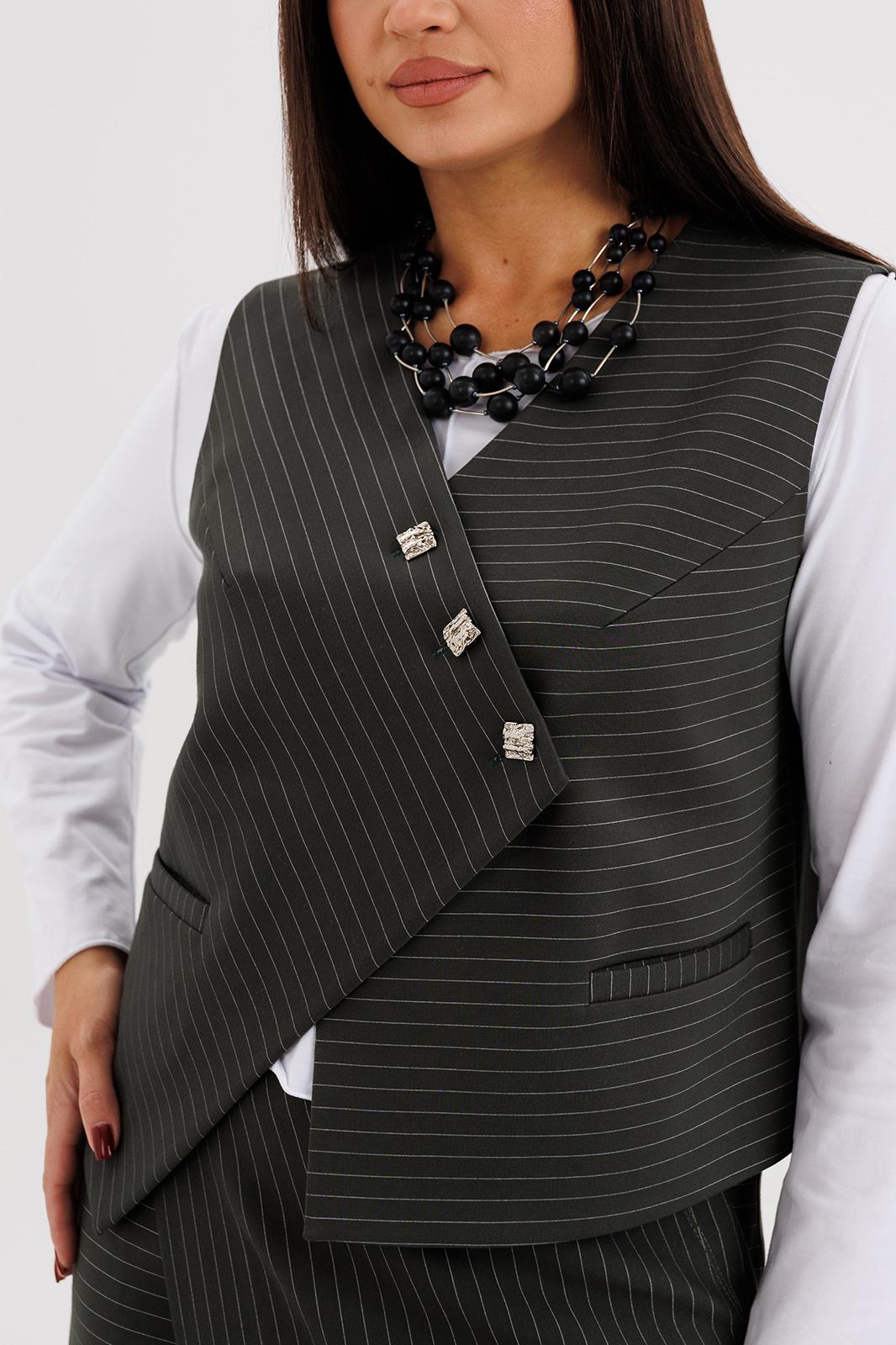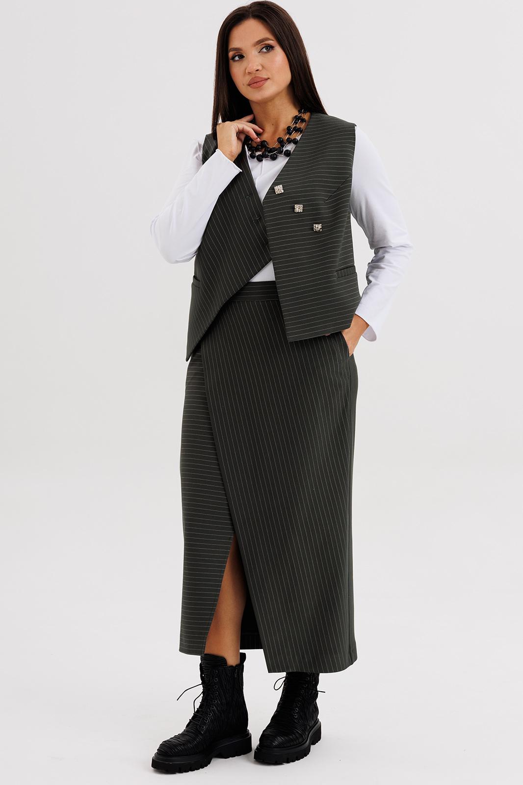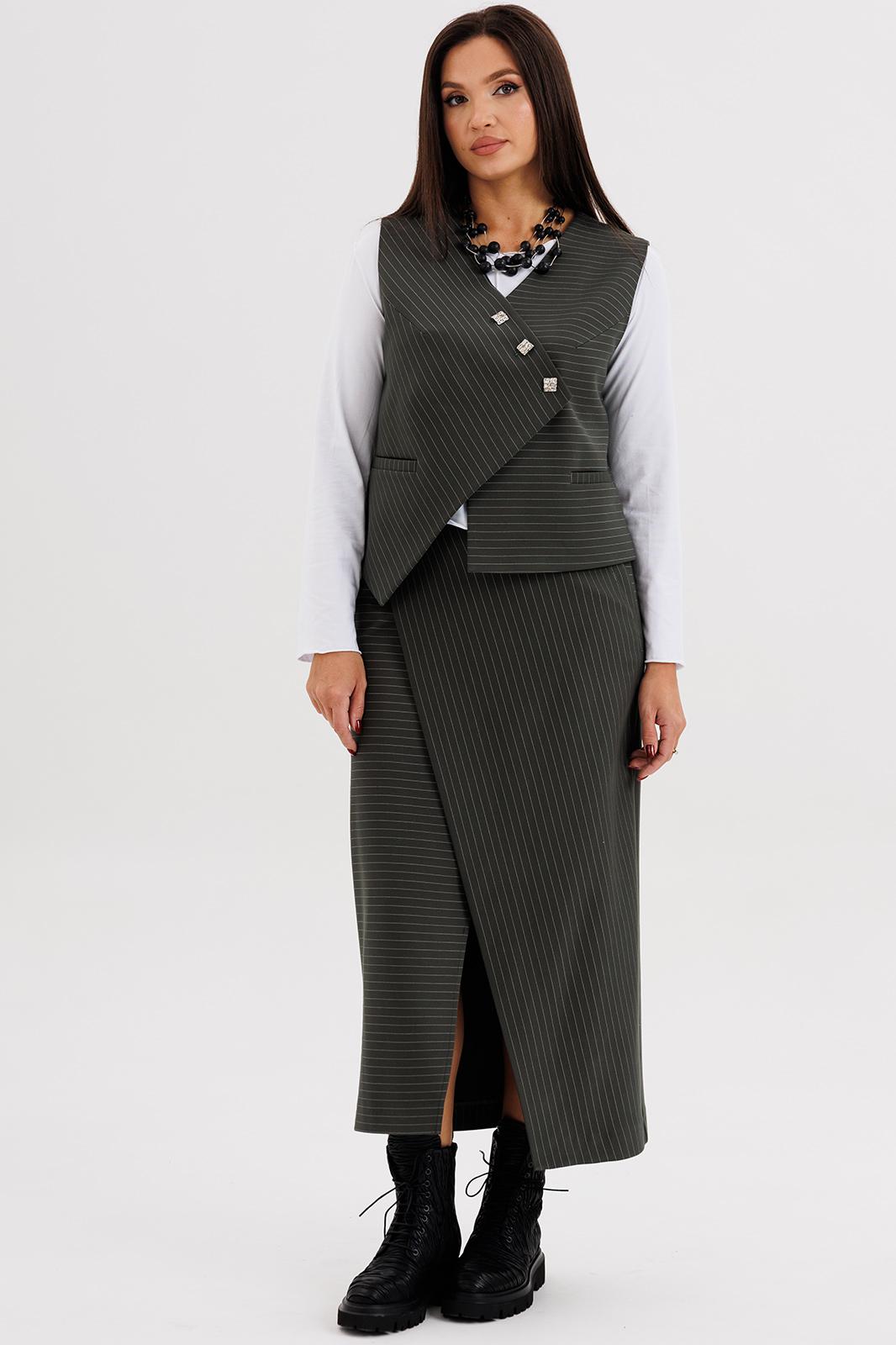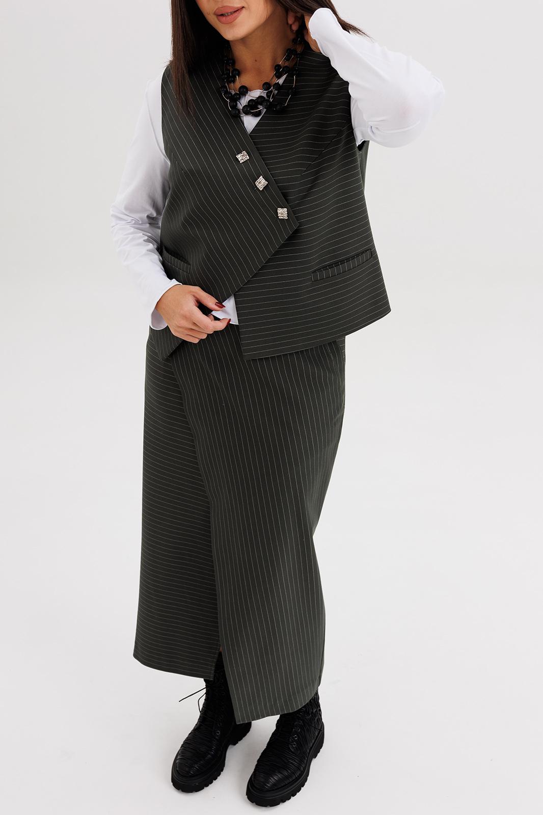 Стильный женский костюм в полоску — идеальное сочетание элегантности и современного минимализма. Комплект состоит из жилета оригинального кроя с асимметричной застёжкой, прямой юбки миди с мягким запахом и джемпера с длинным рукавом.