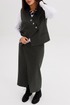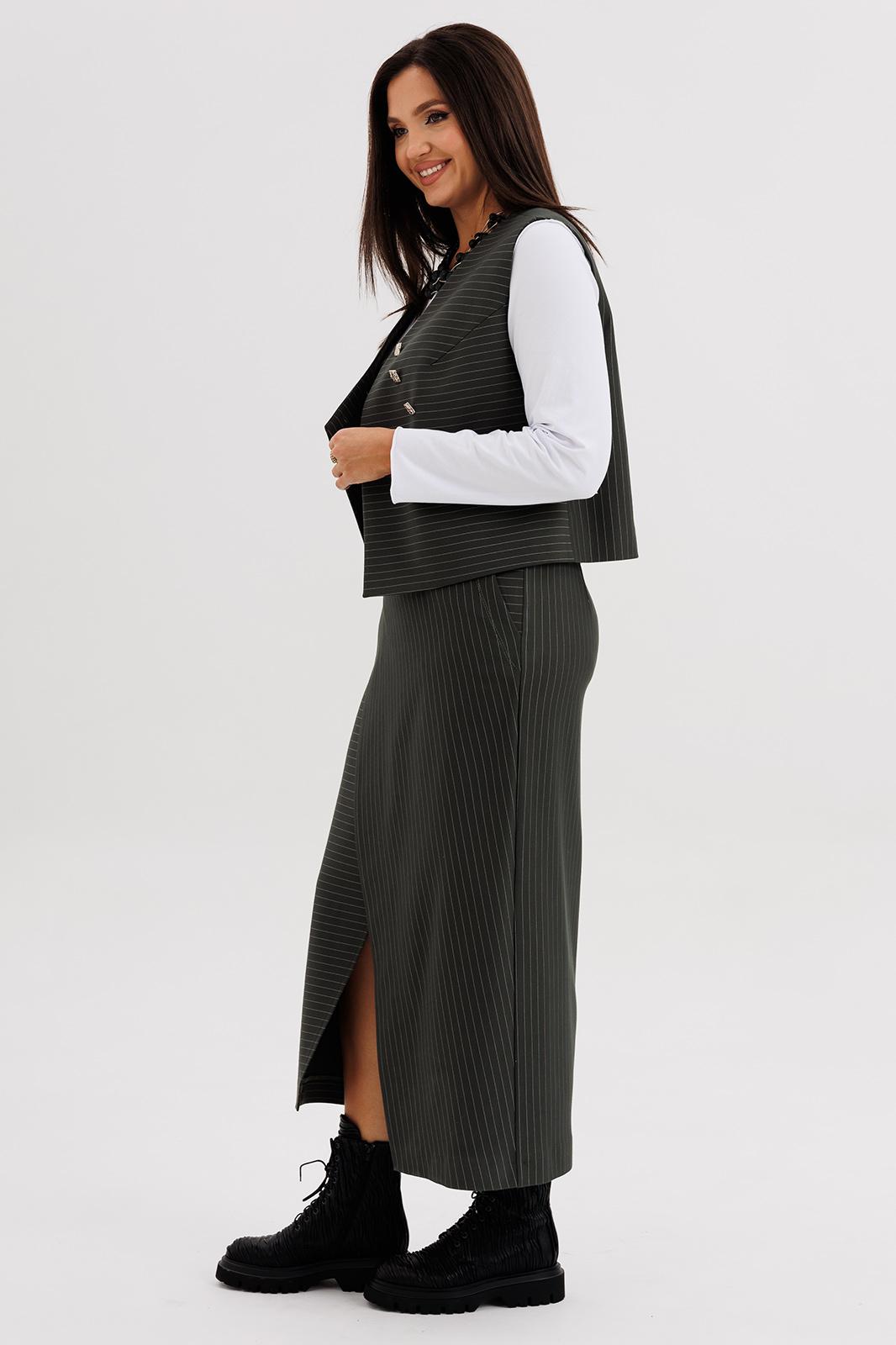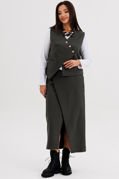 Модель выполнена из плотной трикотажной ткани с тонкой вертикальной полоской, которая визуально вытягивает силуэт и подчёркивает стройность. Жилет без рукавов застёгивается на декоративные пуговицы, создавая выразительный акцент в образе. Юбка миди с запахом добавляет женственности и комфорта при движении. Джемпер трикотажный, с длинным рукавом, полуприлегающего силуэта.