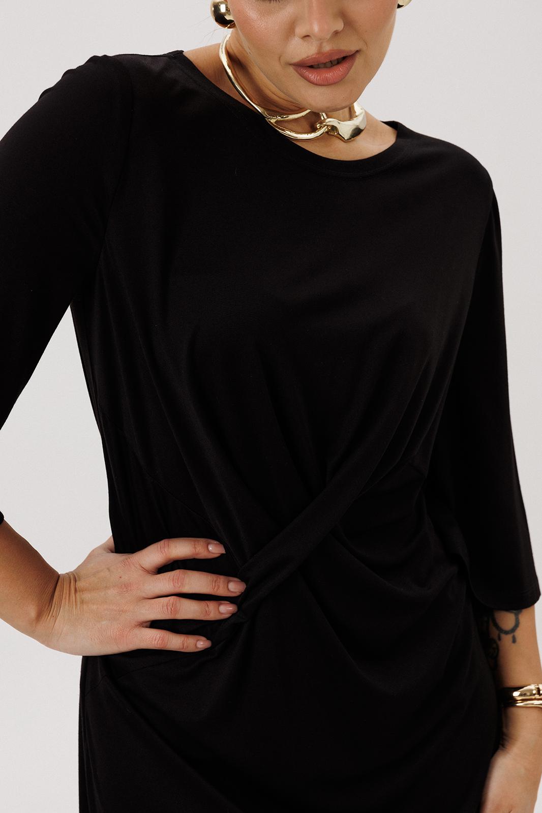 Полочка со сложным ассиметричным подрезом и драпировкой. Спинка со средним швом и застёжкой-каплей.