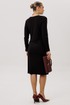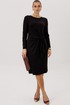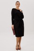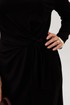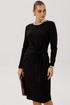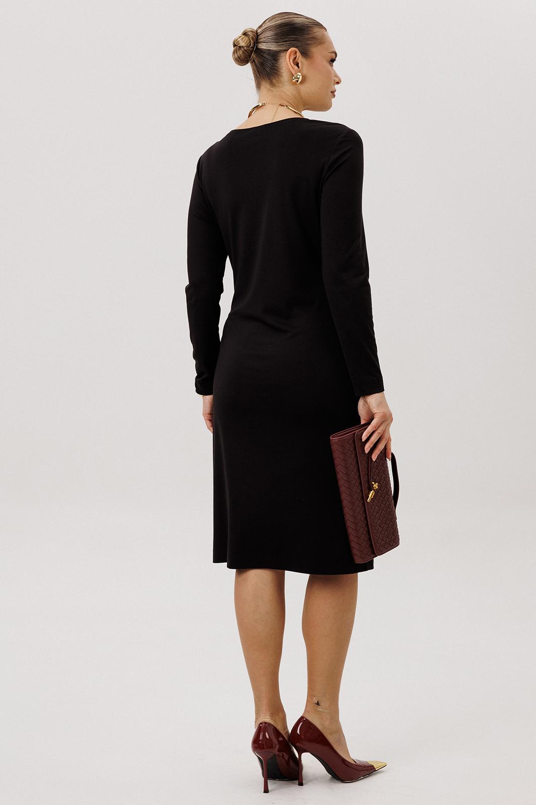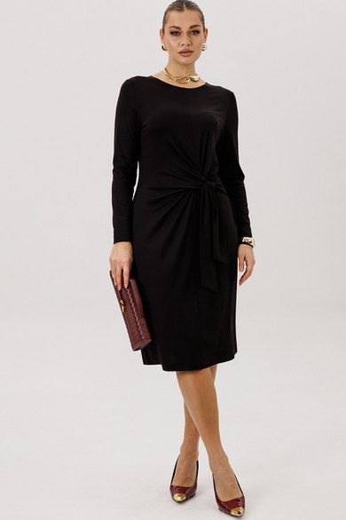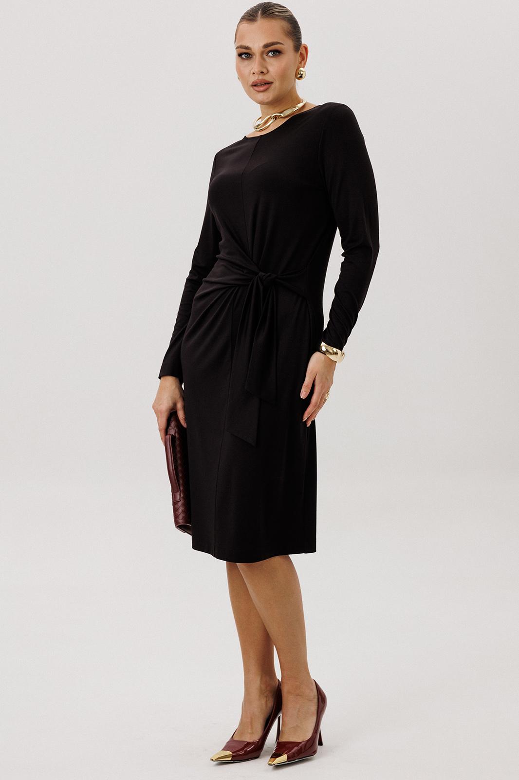Платье полуприлегающего силуэта, втачного покроя с круглым вырезом горловины и длинным рукавом. Комфортное вискозное полотно, средняя длина. Полочка с центральным швом и ассиметричным поясом-завязкой, образующим драпировку на правой половине. Рукав одношовный.