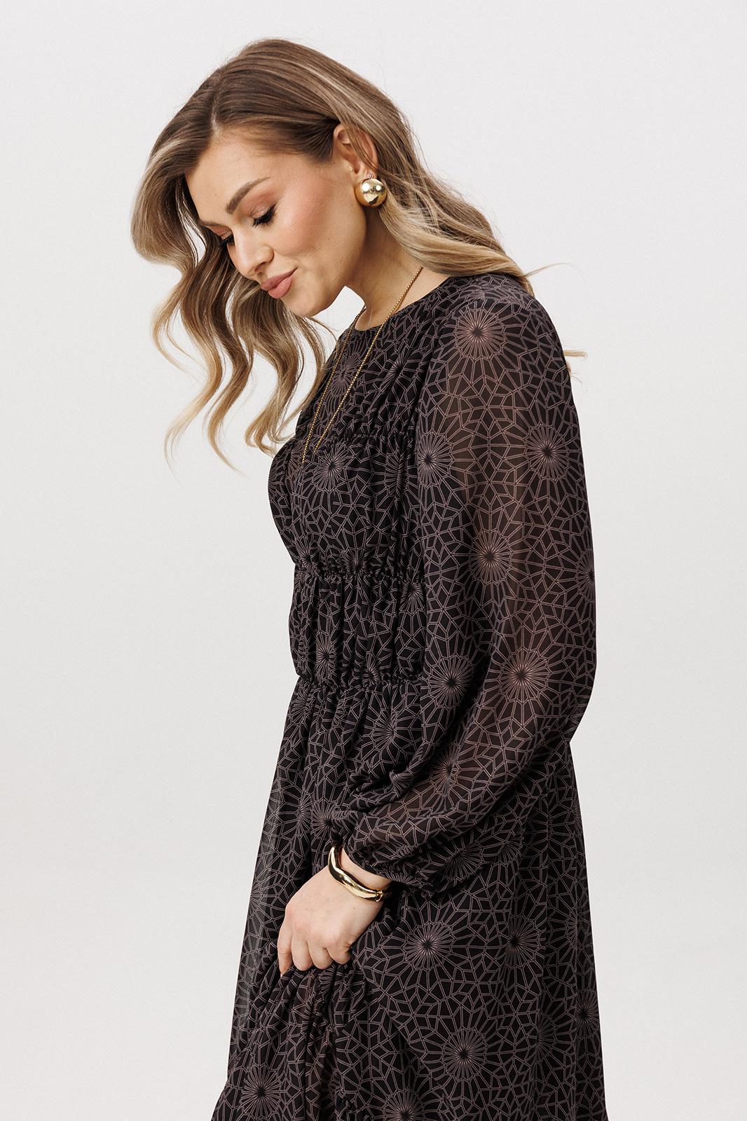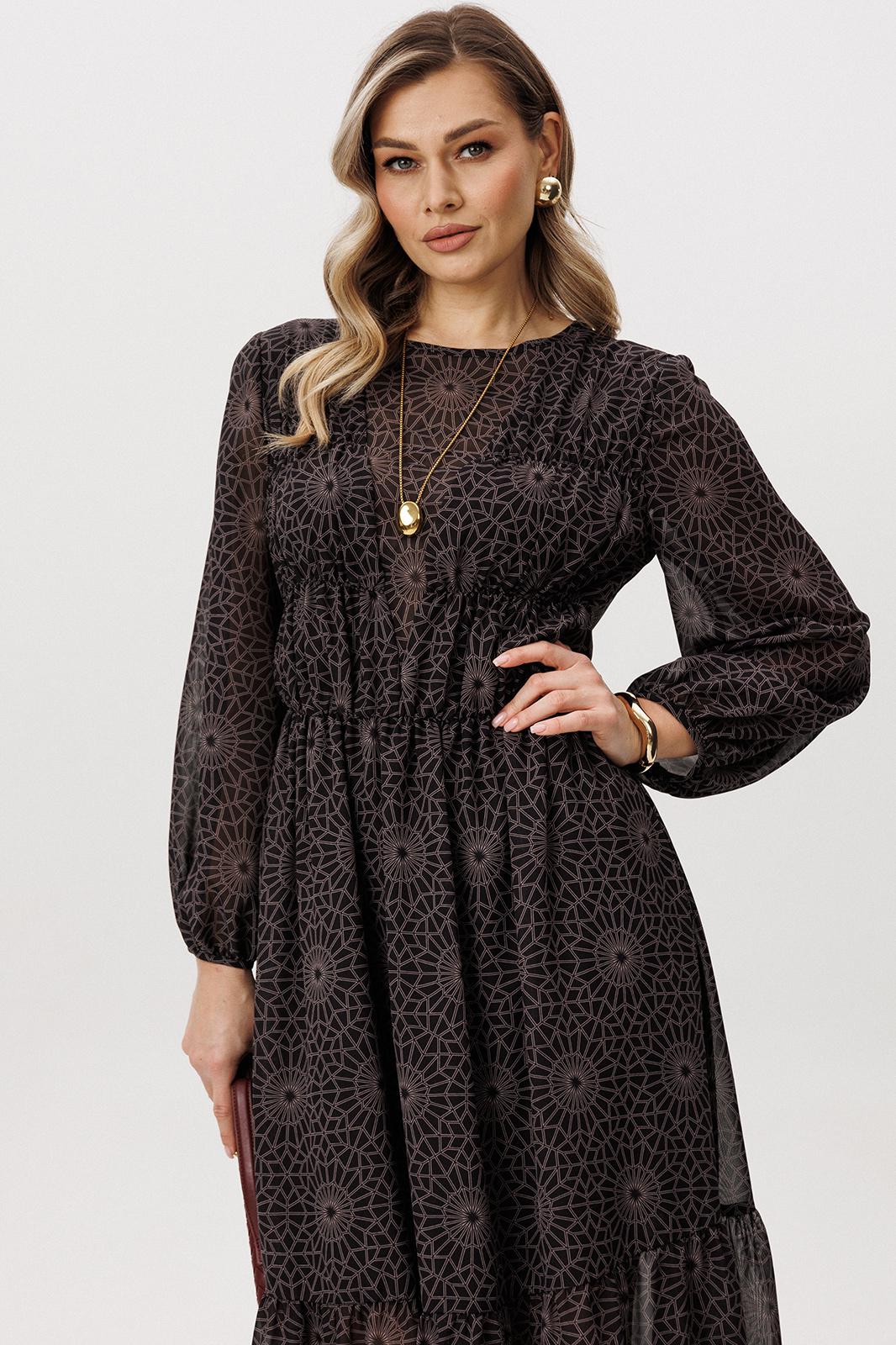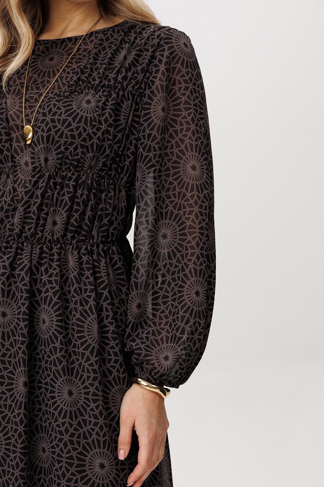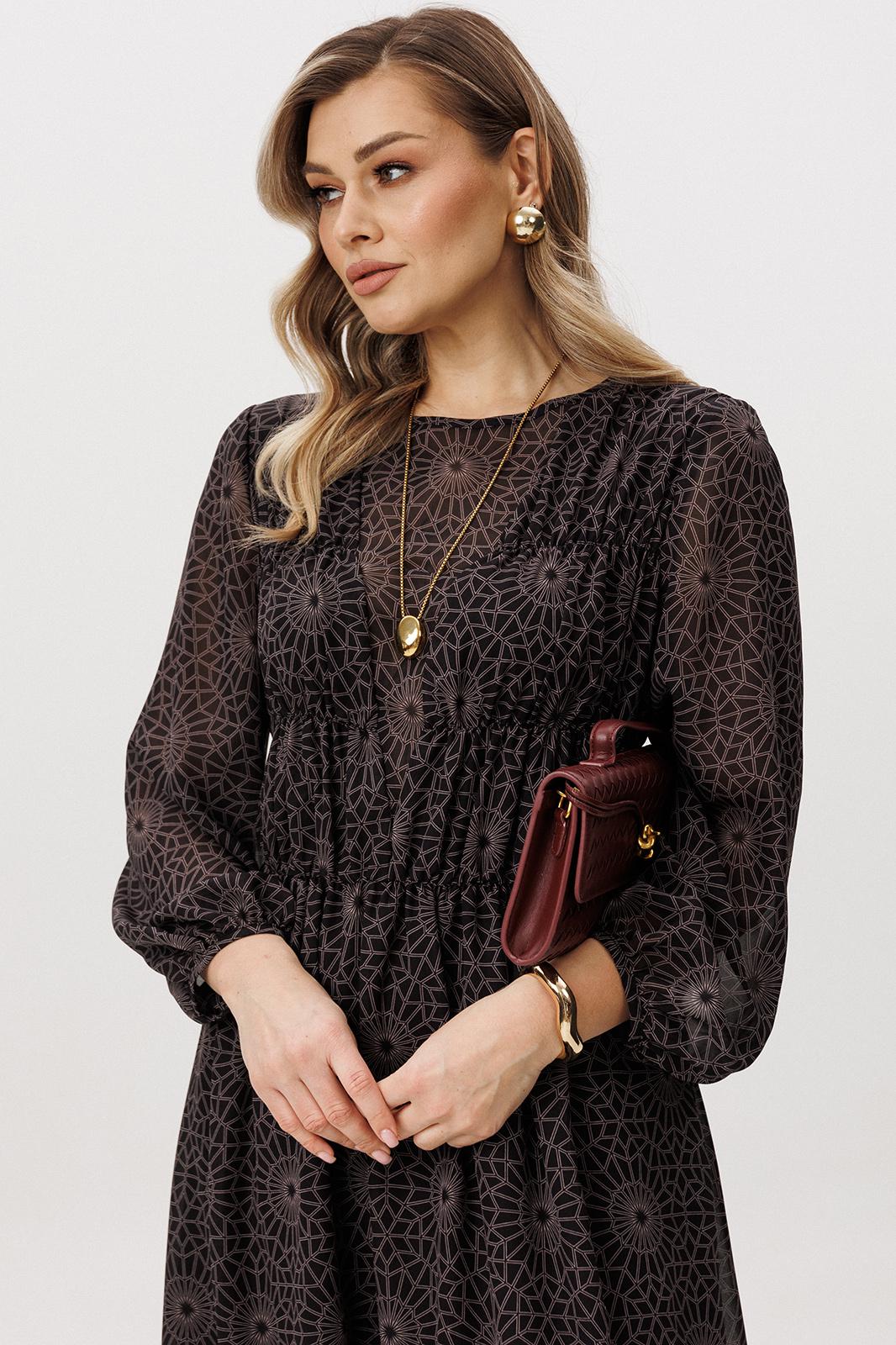 Легкое и воздушное, микс нежности и дерзости, воплощенный в комбинации противоположностей: нежного шифона и геометрического принта. А-образный силуэт, втачной рукав, со сборкой по низу, круглая горловина. Платье отрезное, чуть выше линии талии, лиф полочки с V-образным подрезом и легкой сборкой в боковой части на эластичную венгерку. Боковая часть на подкладке. Лиф спинки со средним швом и застежкой. По линии талии-эластичная тесьма.