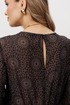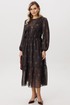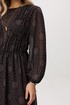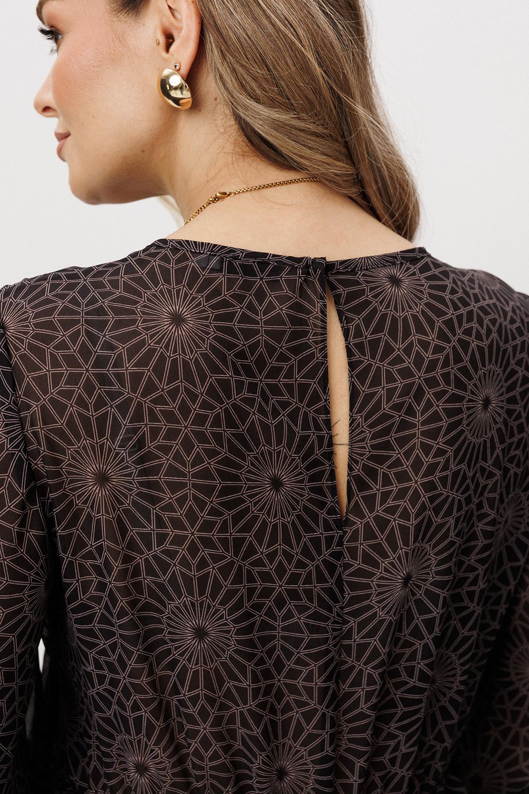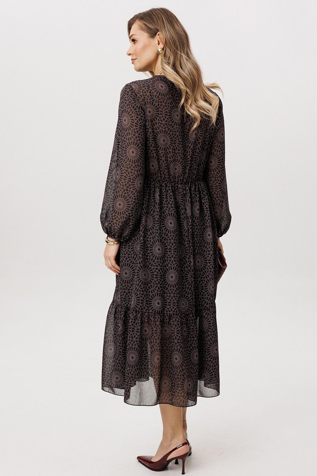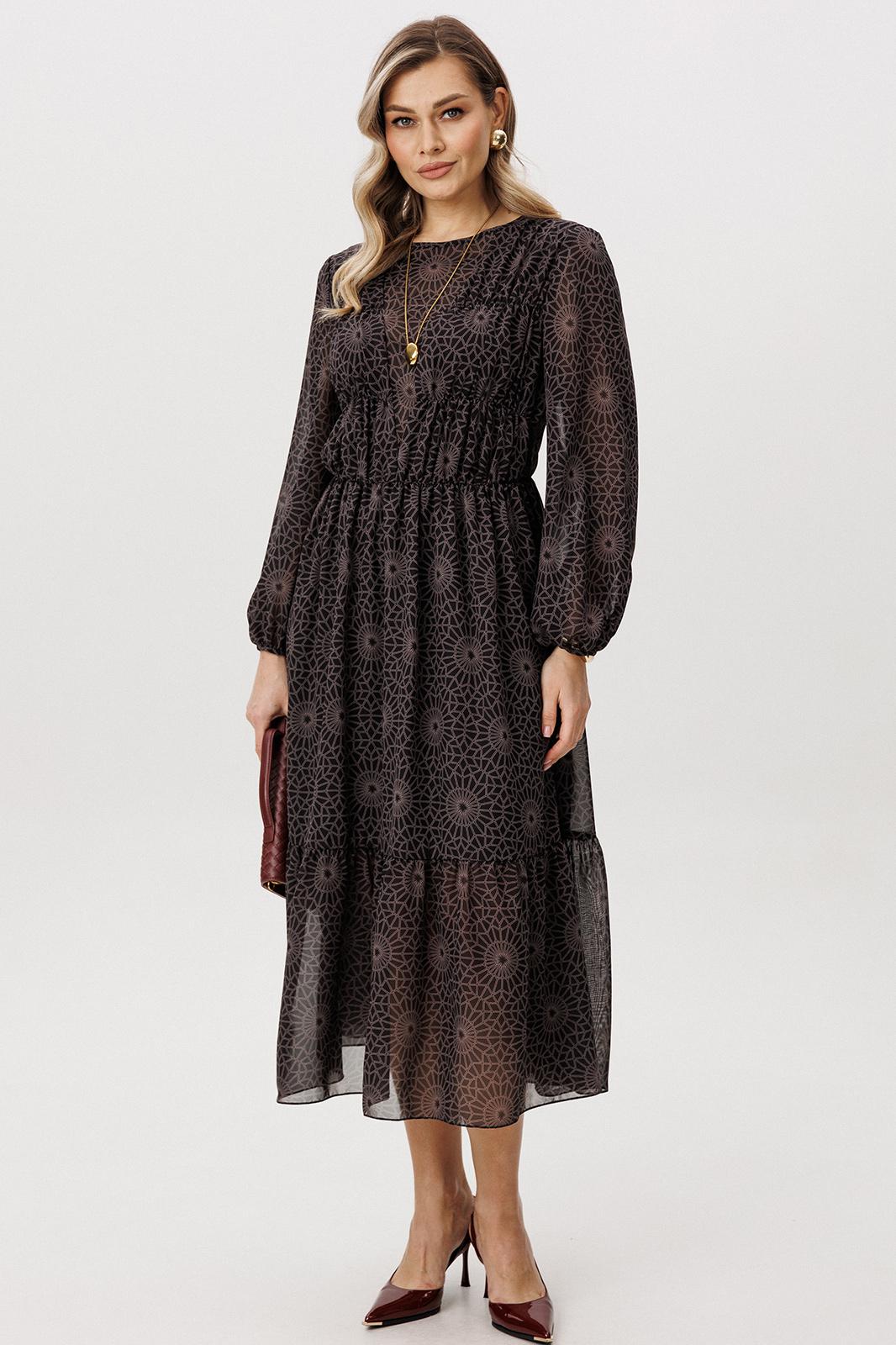 Легкое и воздушное, микс нежности и дерзости, воплощенный в комбинации противоположностей: нежного шифона и геометрического принта. А-образный силуэт, втачной рукав, со сборкой по низу, круглая горловина. Платье отрезное, чуть выше линии талии, лиф полочки с V-образным подрезом и легкой сборкой в боковой части на эластичную венгерку. Боковая часть на подкладке. Лиф спинки со средним швом и застежкой. По линии талии-эластичная тесьма.