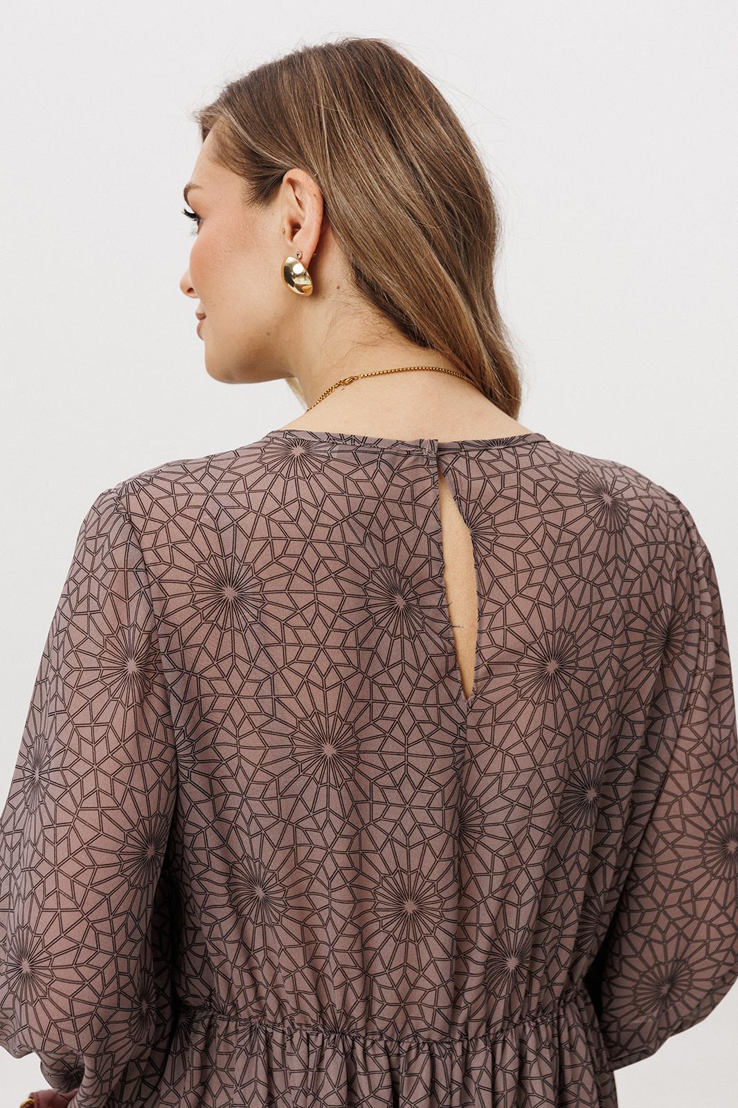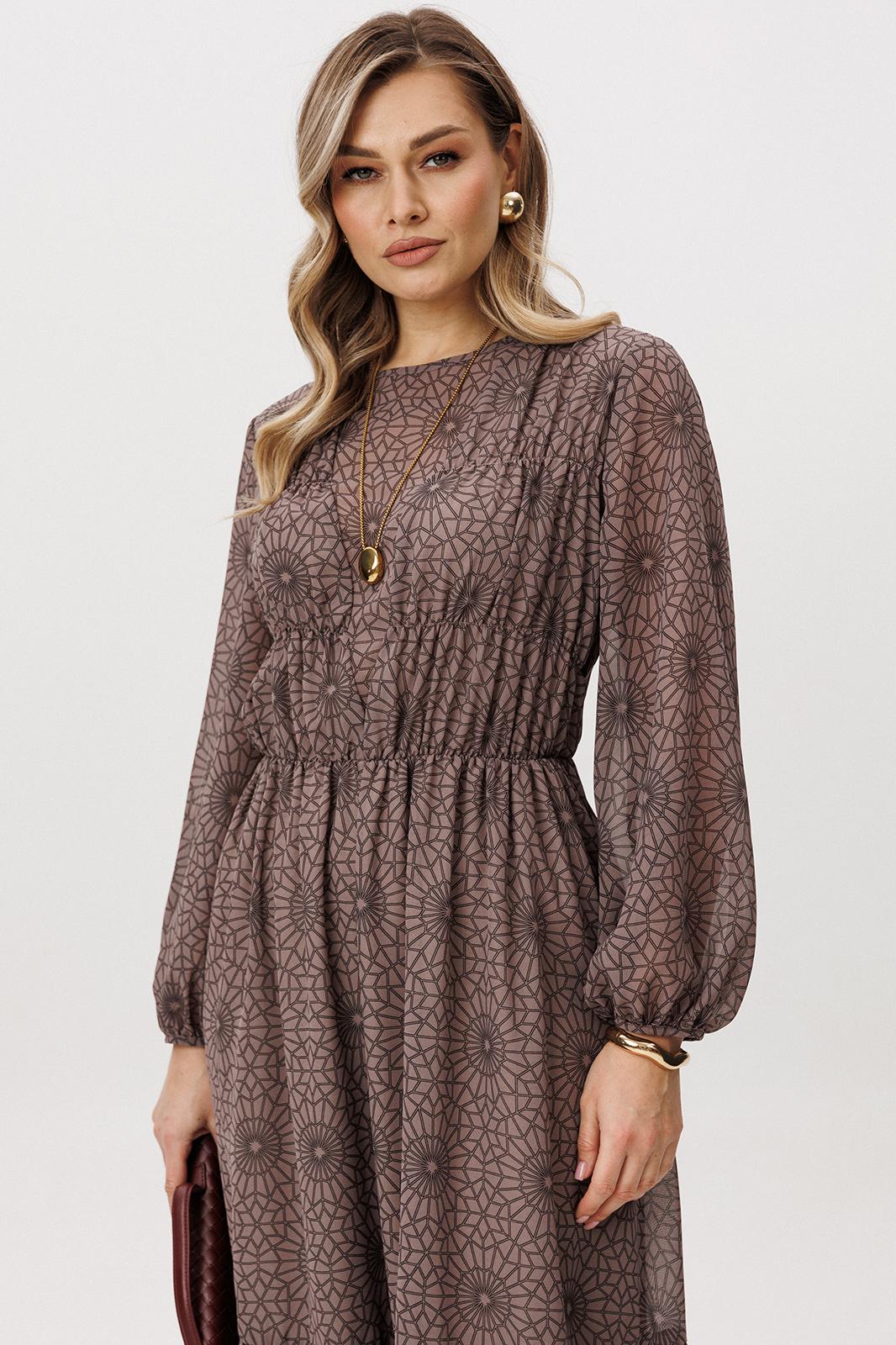 Легкое и воздушное, микс нежности и дерзости, воплощенный в комбинации противоположностей: нежного шифона и геометрического принта. А-образный силуэт, втачной рукав, со сборкой по низу, круглая горловина. Платье отрезное, чуть выше линии талии, лиф полочки с V-образным подрезом и легкой сборкой в боковой части на эластичную венгерку. Боковая часть на подкладке. Лиф спинки со средним швом и застежкой. По линии талии-эластичная тесьма.