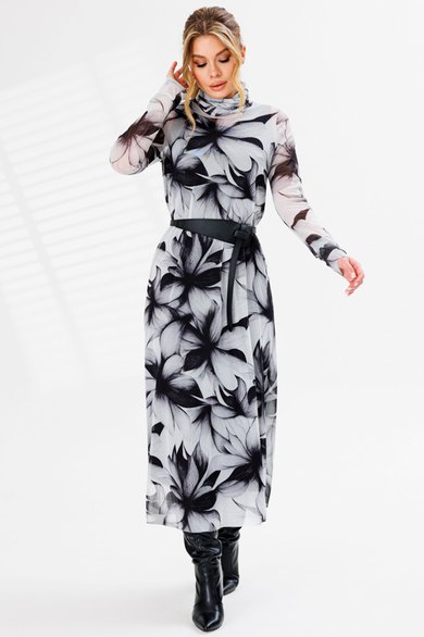 Верхнее платье из сетки. Нижнее платье-комбинация из атласа, прямого силуэта, без рукавов. В комплект входит пояс.