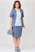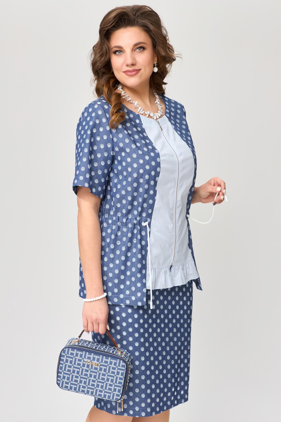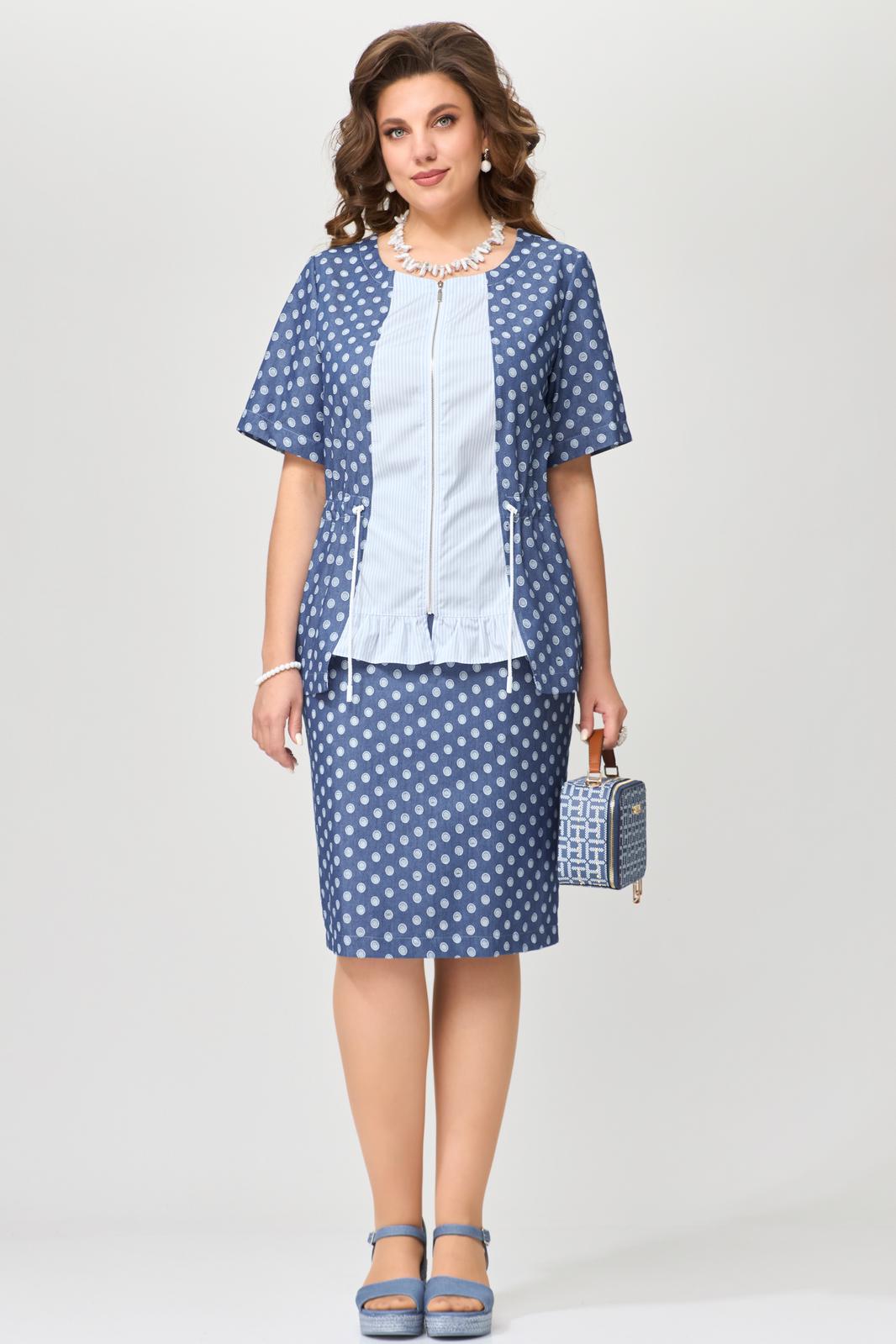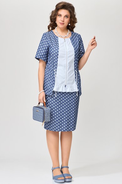 Женский комплект Хайда состоит из юбки и блузки, выполнен из тонкой джинсовой ткани. Блузка полуприлегающего силуэта с кулисой по талии. Горловина в платье округлая, застежка с разъемной молнией. По центру полочки блузка декоративная вставка с рюшей по низу, по спинке - кокетка. Рукав в блузке втачной, низ рукава обработан швом в подгибку с закрытым срезом. Низ изделия обработан швом в подгибку с закрытым срезом. Юбка зауженная к низу, по спинке юбки - шлица, на поясе по бокам резинка, застежка на потайную молнию и пуговицу. Этот комплект легкий в носке, летом не парит, отлично подходит для выхода в город, для праздников и для повседневной носки.