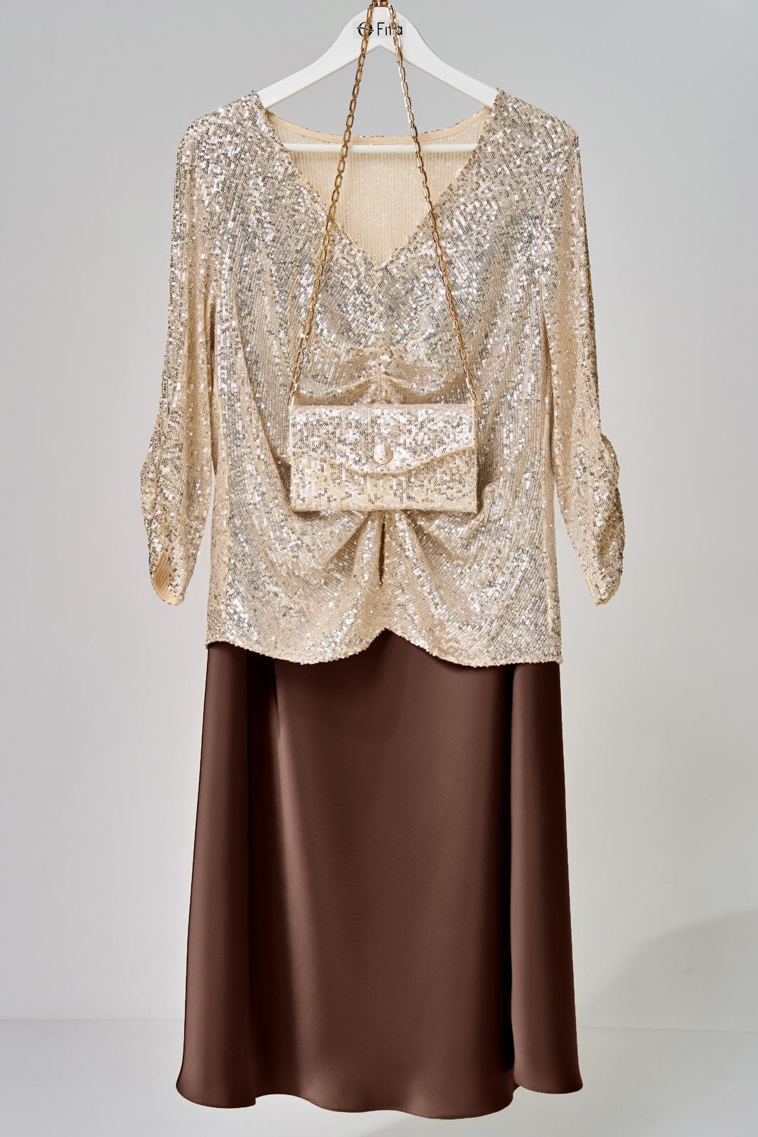 Нарядный комплект Зария состоит из нарядной блузки с пайетками, сатиновой юбки и сумки-клатча.