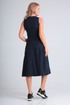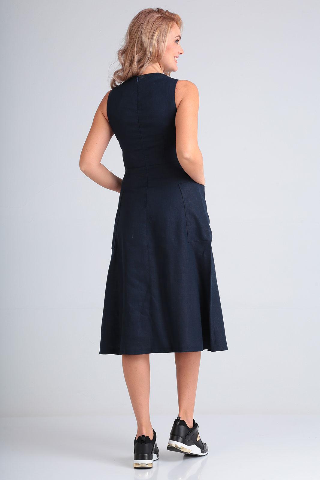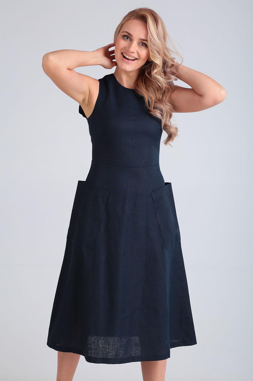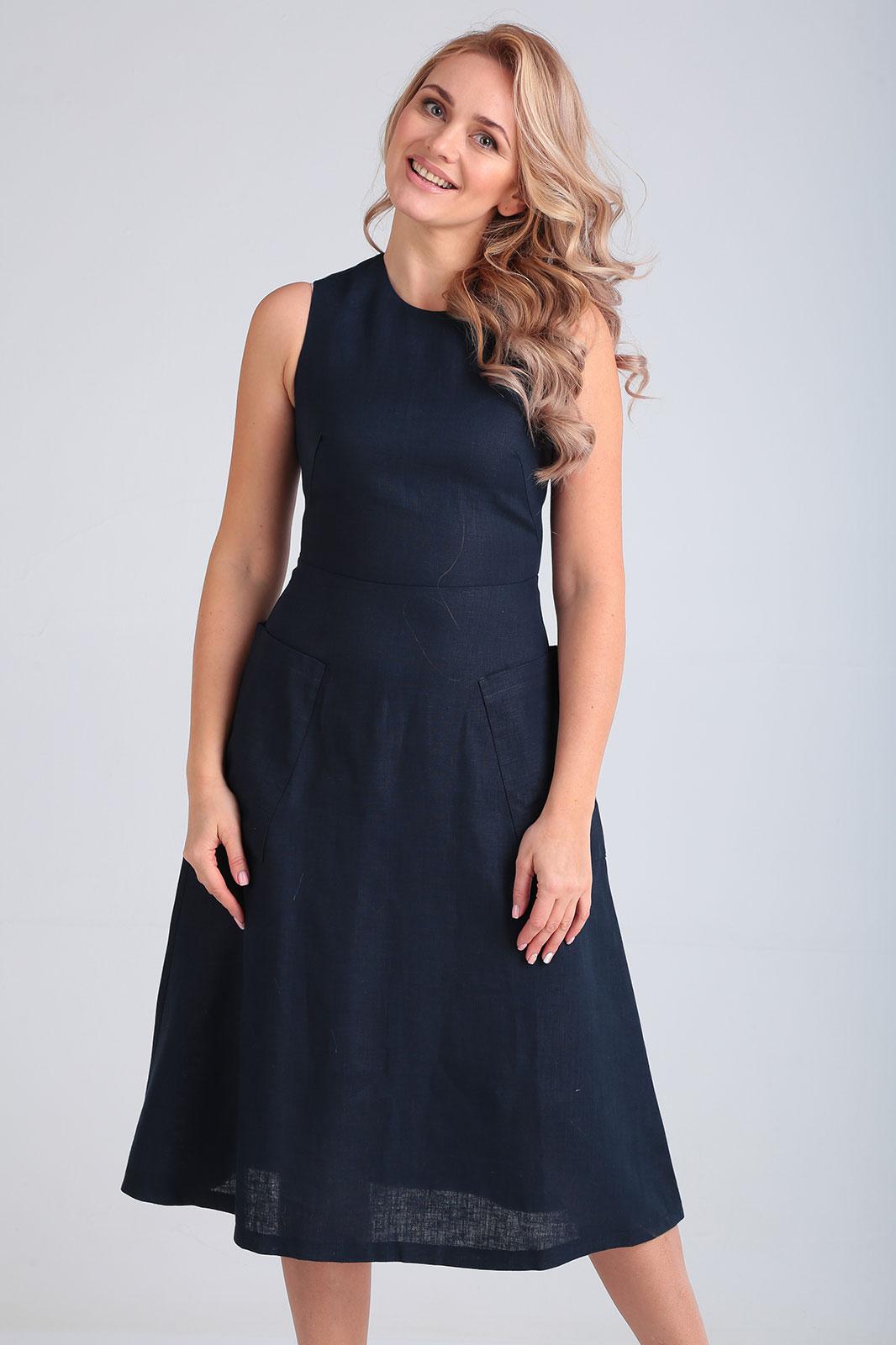 Платье длины миди, отрезное по талии, расклешенного силуэта, с круглой горловиной, без рукава, на задней полочке молния, впереди накладные карманы. Длина по спинке 109 см