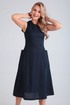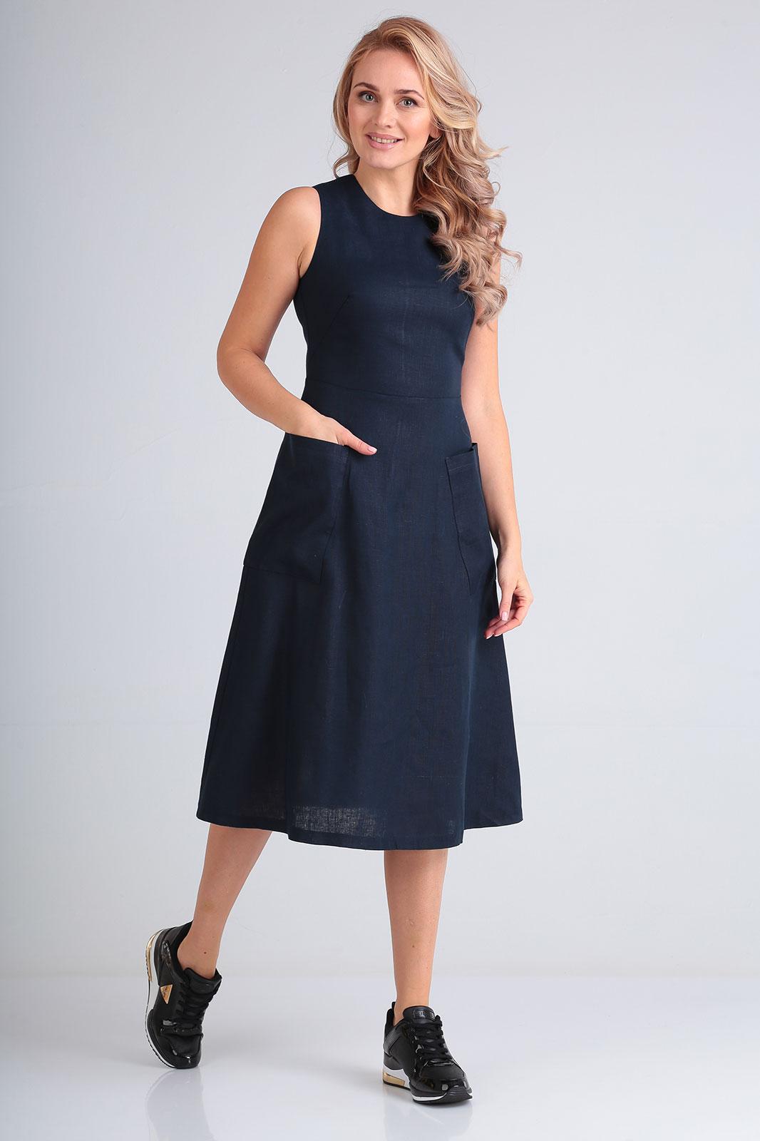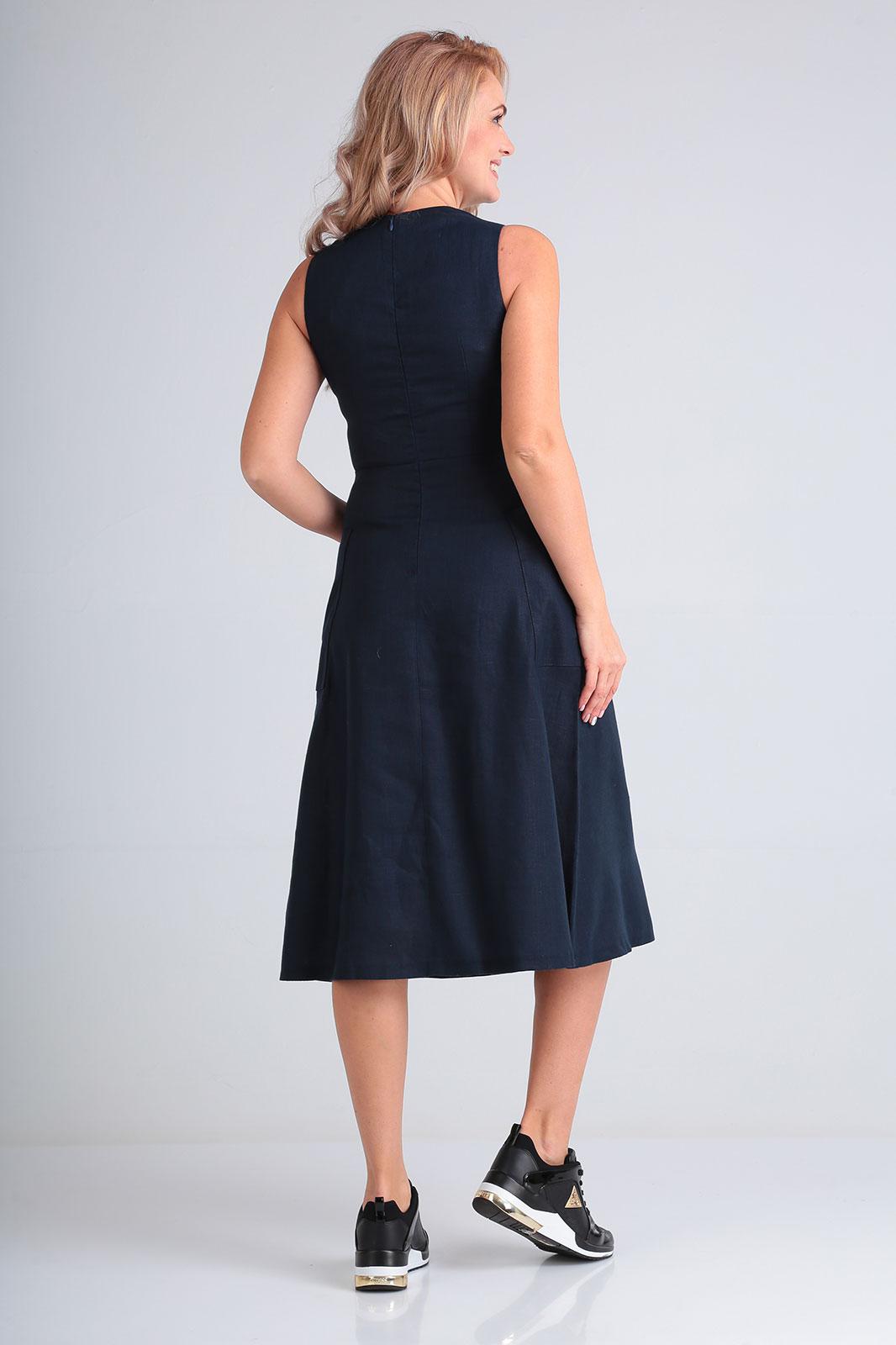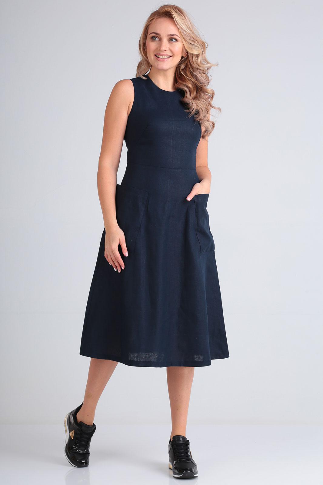 Платье длины миди, отрезное по талии, расклешенного силуэта, с круглой горловиной, без рукава, на задней полочке молния, впереди накладные карманы. Длина по спинке 109 см