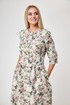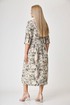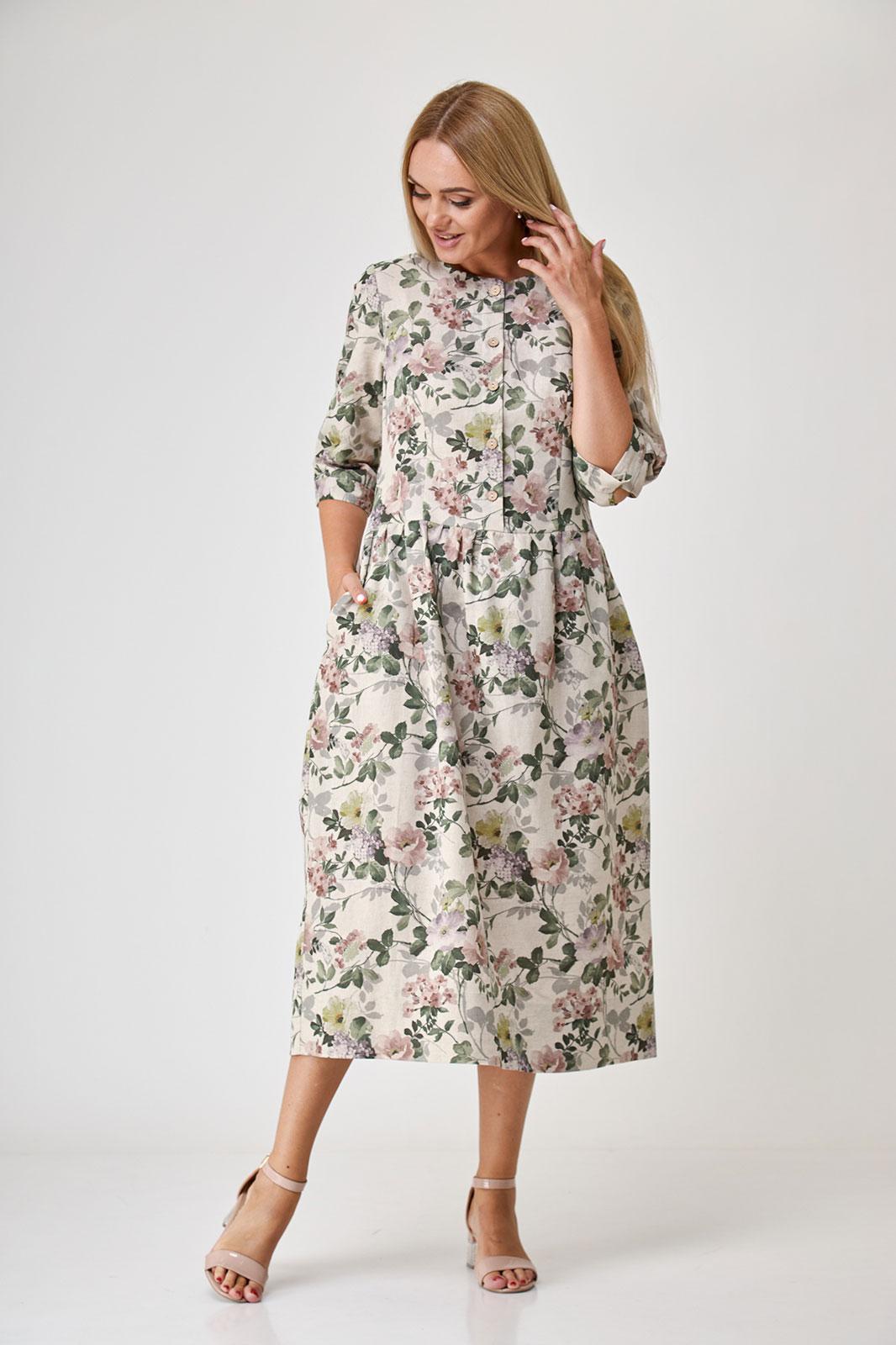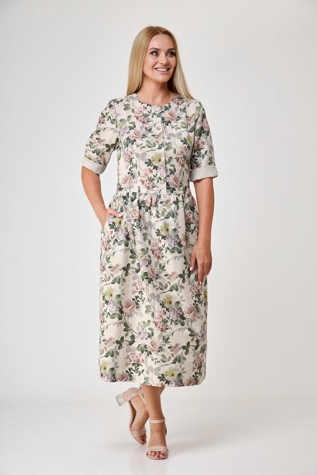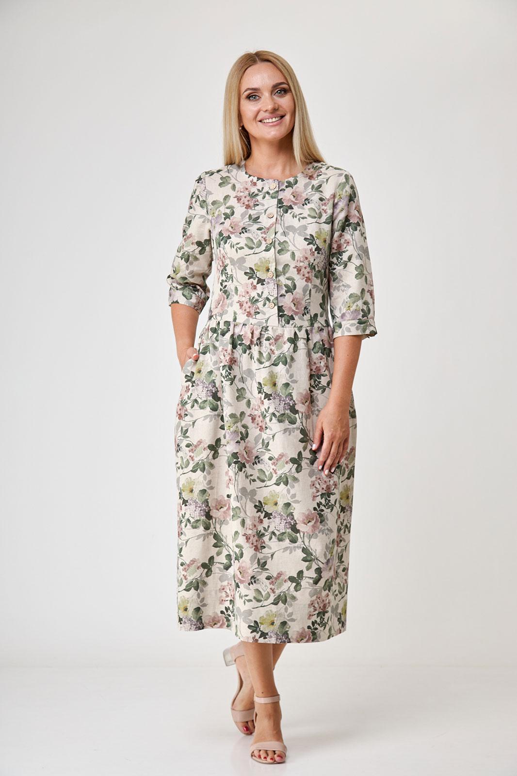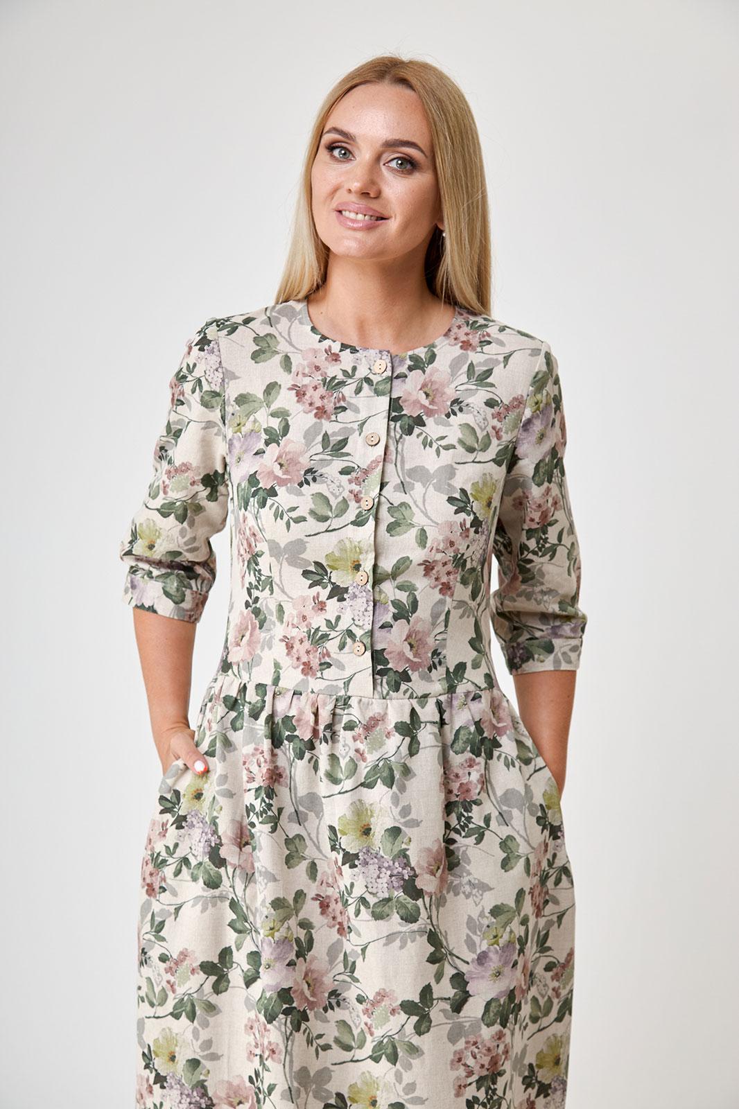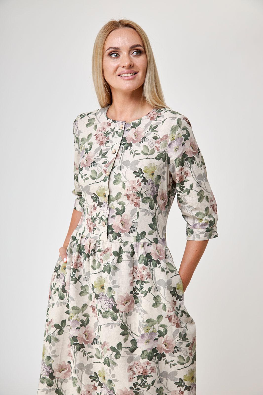 Платье состоящее из льна , полуприлегающее,длиной миди, отрезное по линии талии, с прямой юбкой на сборке по талии, с рукавом 3/4 , с застежкой доверху без воротника. По переду и спинке выполнены талевые вытачки. По переду застёжка до талии на 5 петель и пуговиц. Горловина окантована. Рукава втачные 3/4, внизу на манжете и пуговице. Карманы в боковых швах. Низ платья с широкой подгибкой с закрытым срезом.