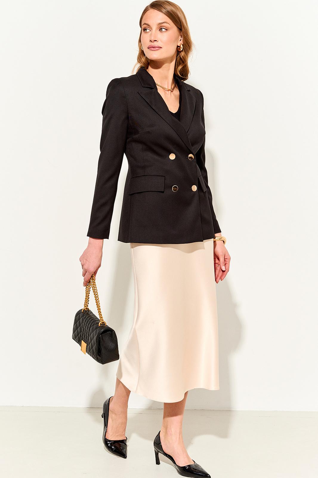 Юбка миди прилегающего силуэта из струящейся сатиновой ткани с добавлением шелка; пояс притачной, в боковые швы которого вставлена резинка для лучшего прилегания; застежка на молнию , петлю и пуговицу.